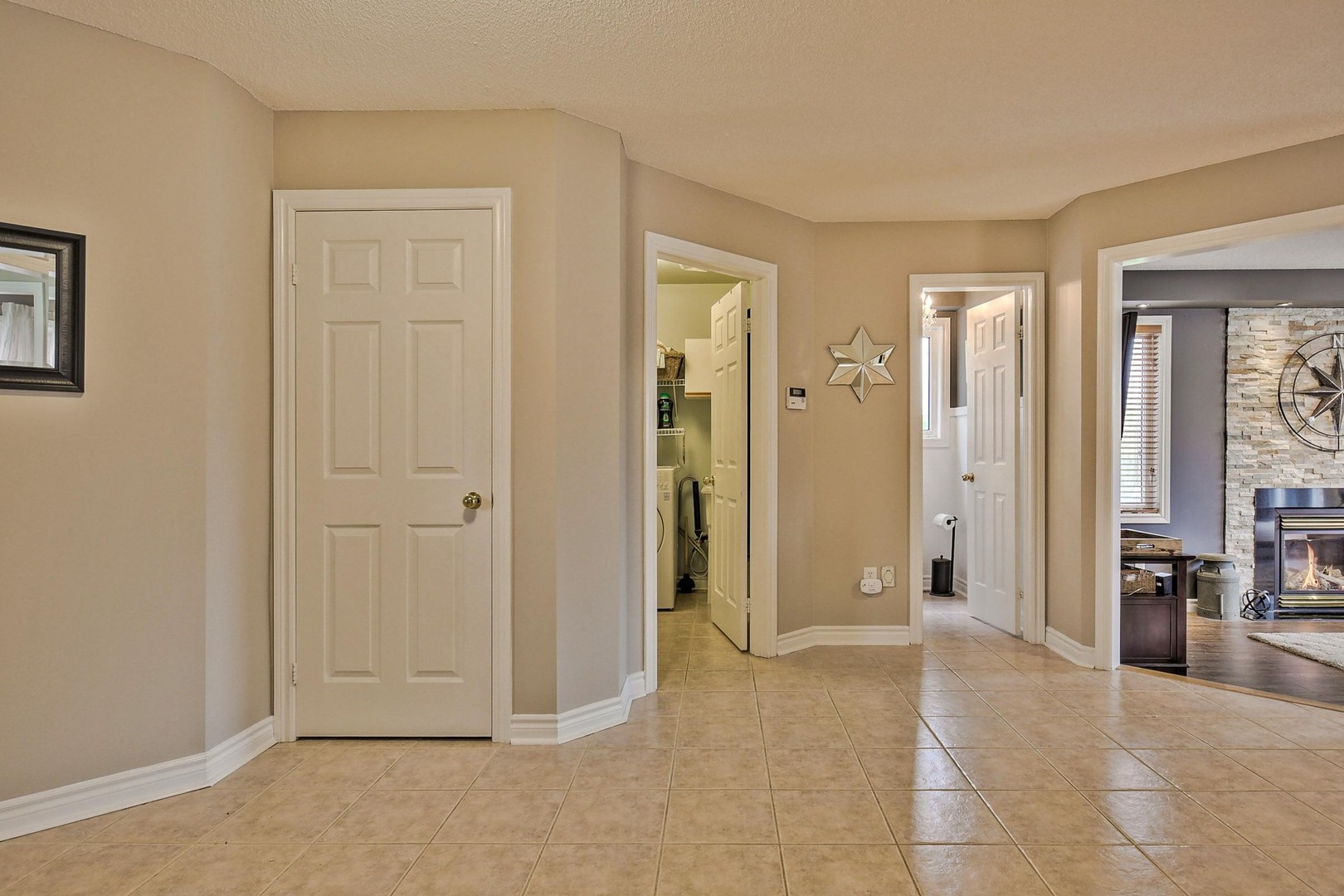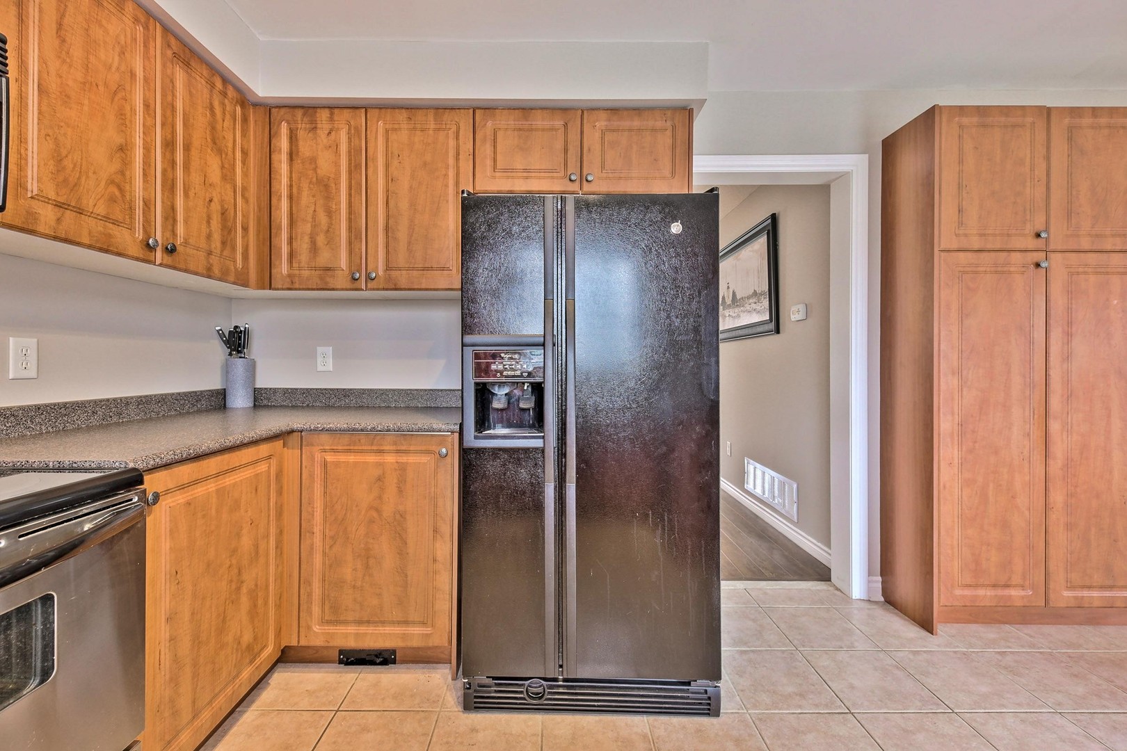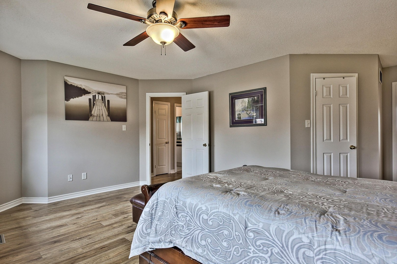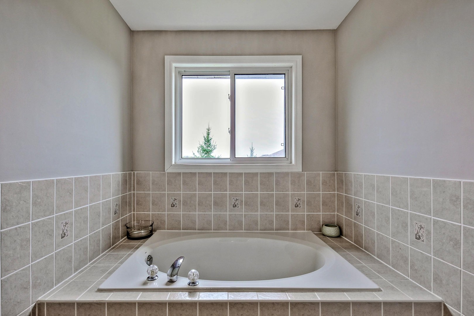 Spacious foyer, formal living room and dining room, sunken fam rm c/w gas fireplace. Kitchen with w/o to deck and private fenced yard. Hugh master suite with w/i closet and ensuite. 2 car attached garage with inside entry. Newly painted and new flooring.