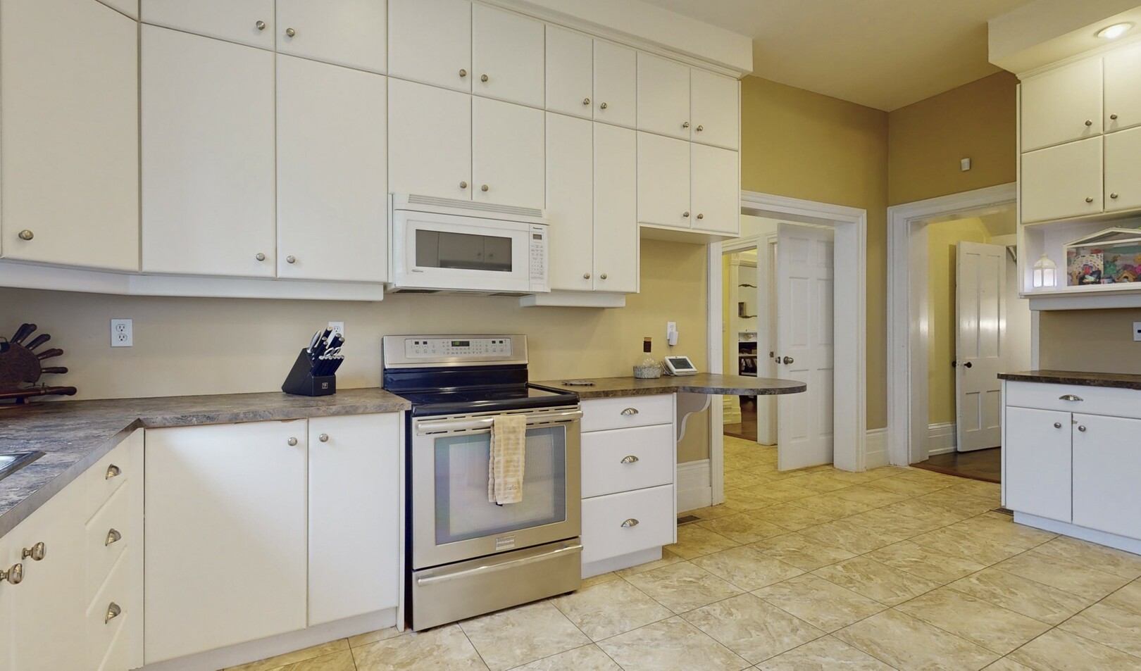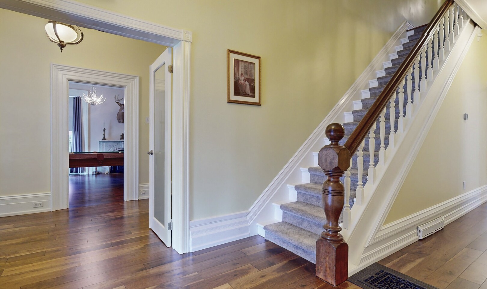 Filled with character, the home features high ceilings, large windows, 13" baseboards, crown molding, double staircases, floor to ceiling pocket doors to separate the formal dining and sitting rooms, and 2 decorative fireplaces.