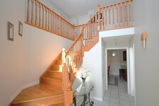 As you step inside, you're welcomed by a soaring 16-foot-high foyer an elegant and inviting introduction that sets the tone for the rest of the home. A beautiful open hardwood staircase anchors the space, framed by gleaming hardwood and ceramic flooring that flows seamlessly throughout.