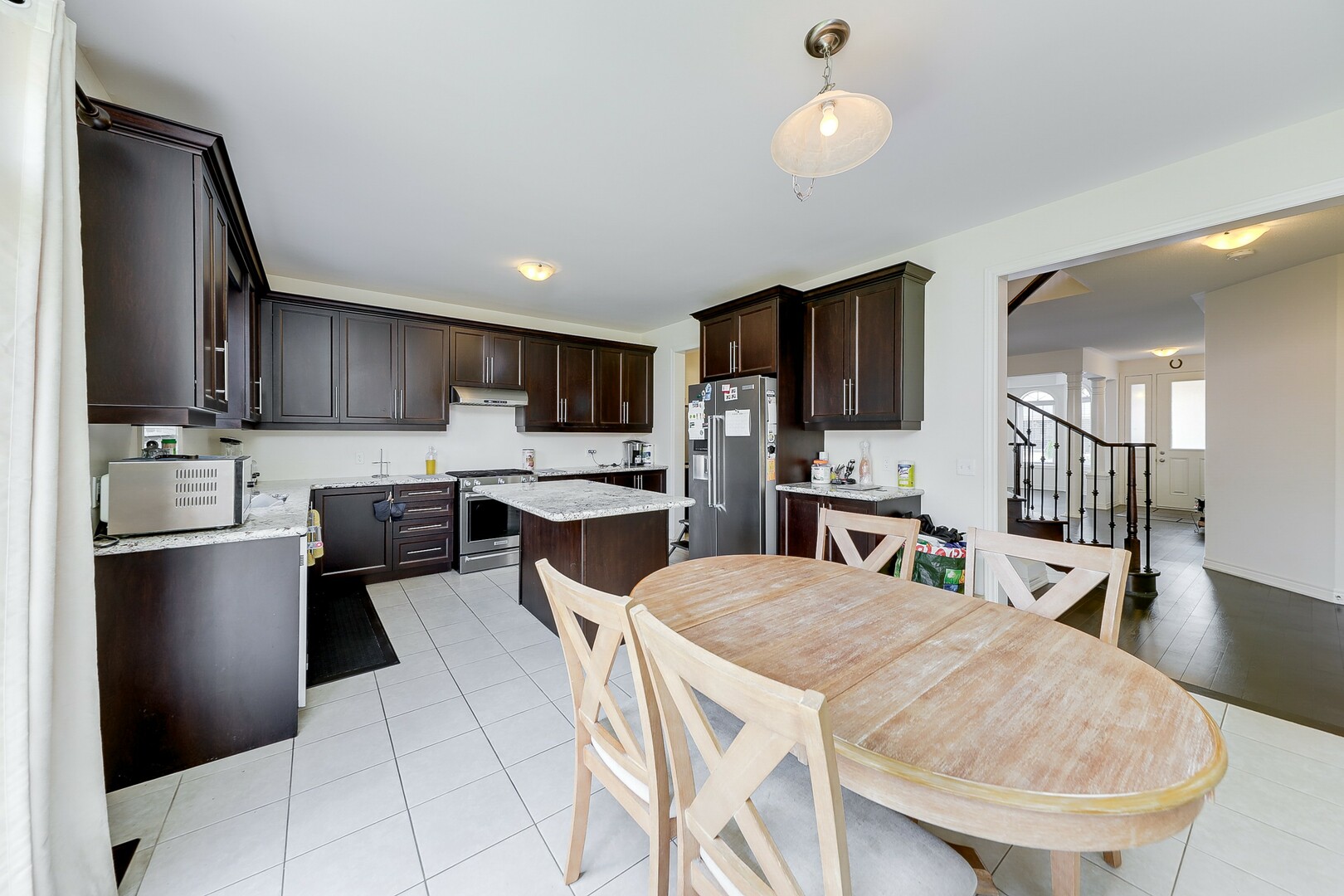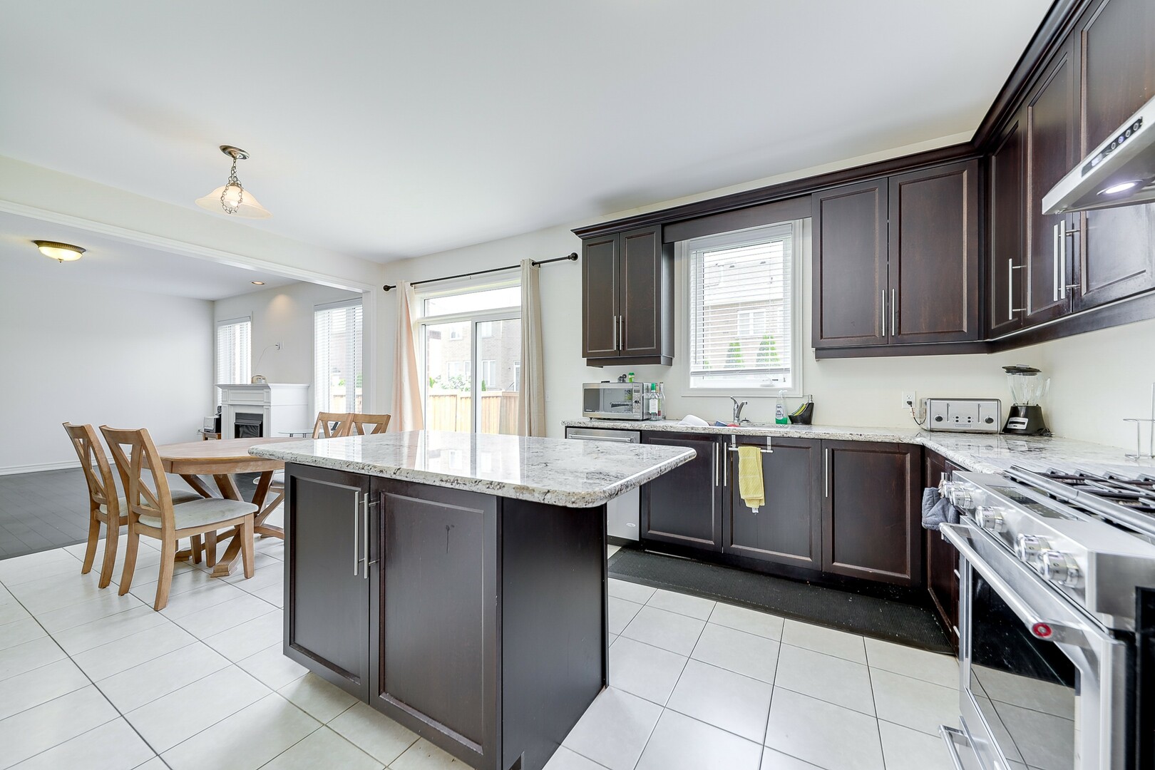 Step inside and be greeted by a warm and inviting ambiance that flows throughout the open-concept layout. The heart of the home is the large kitchen, featuring ample counter space and island, sleek cabinetry, and a convenient servery that connects seamlessly to the dining and living areas. This layout is ideal for both casual family meals and entertaining.