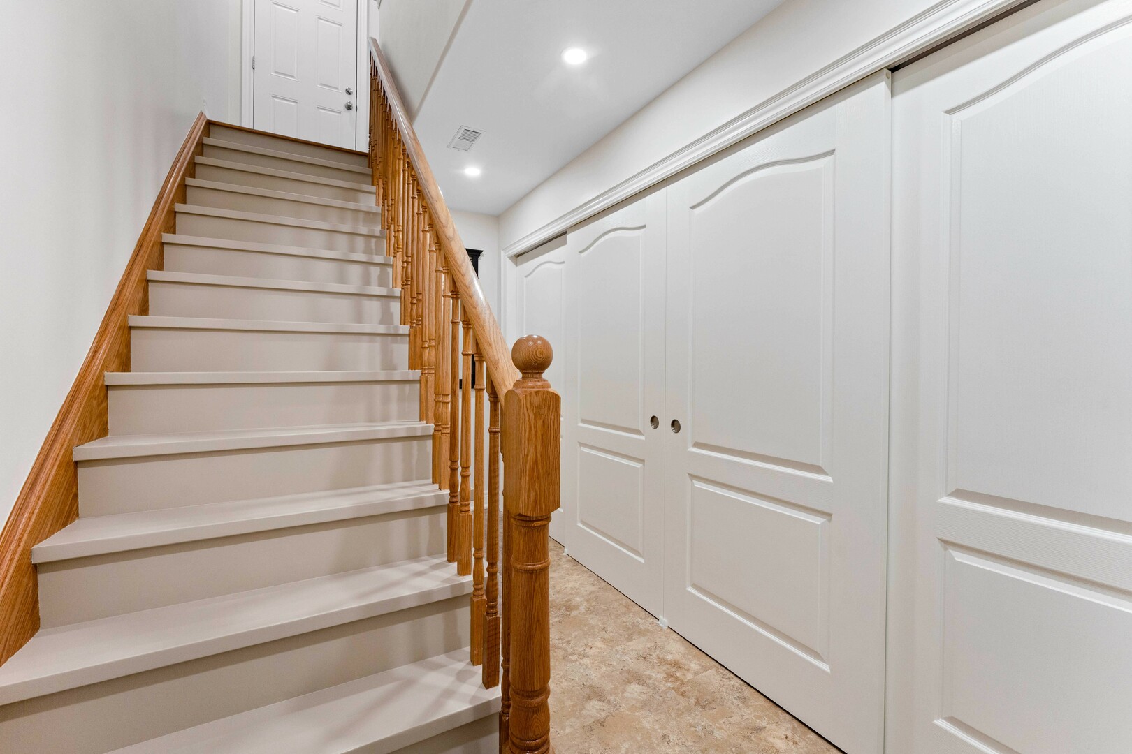 2 sets of stairs to basement, the “service” stairs can be used for a separate entrance to an in-law suite or apartment. (one with easy access to garages, the second is in the main area of the home.)