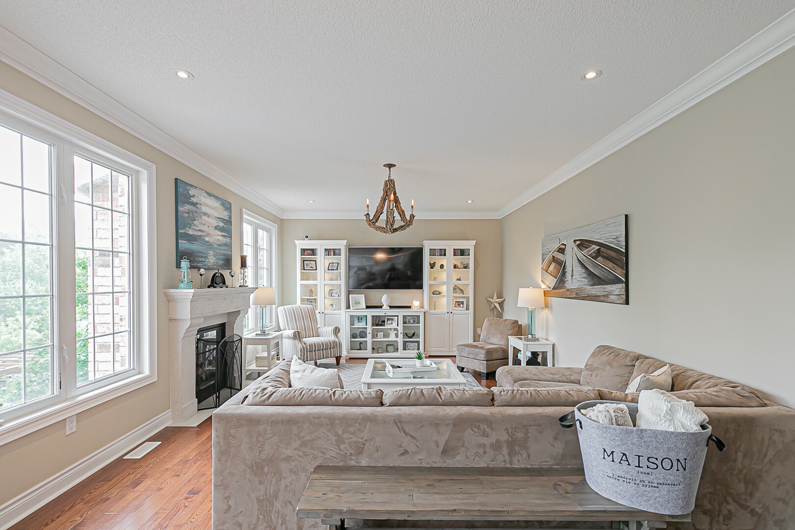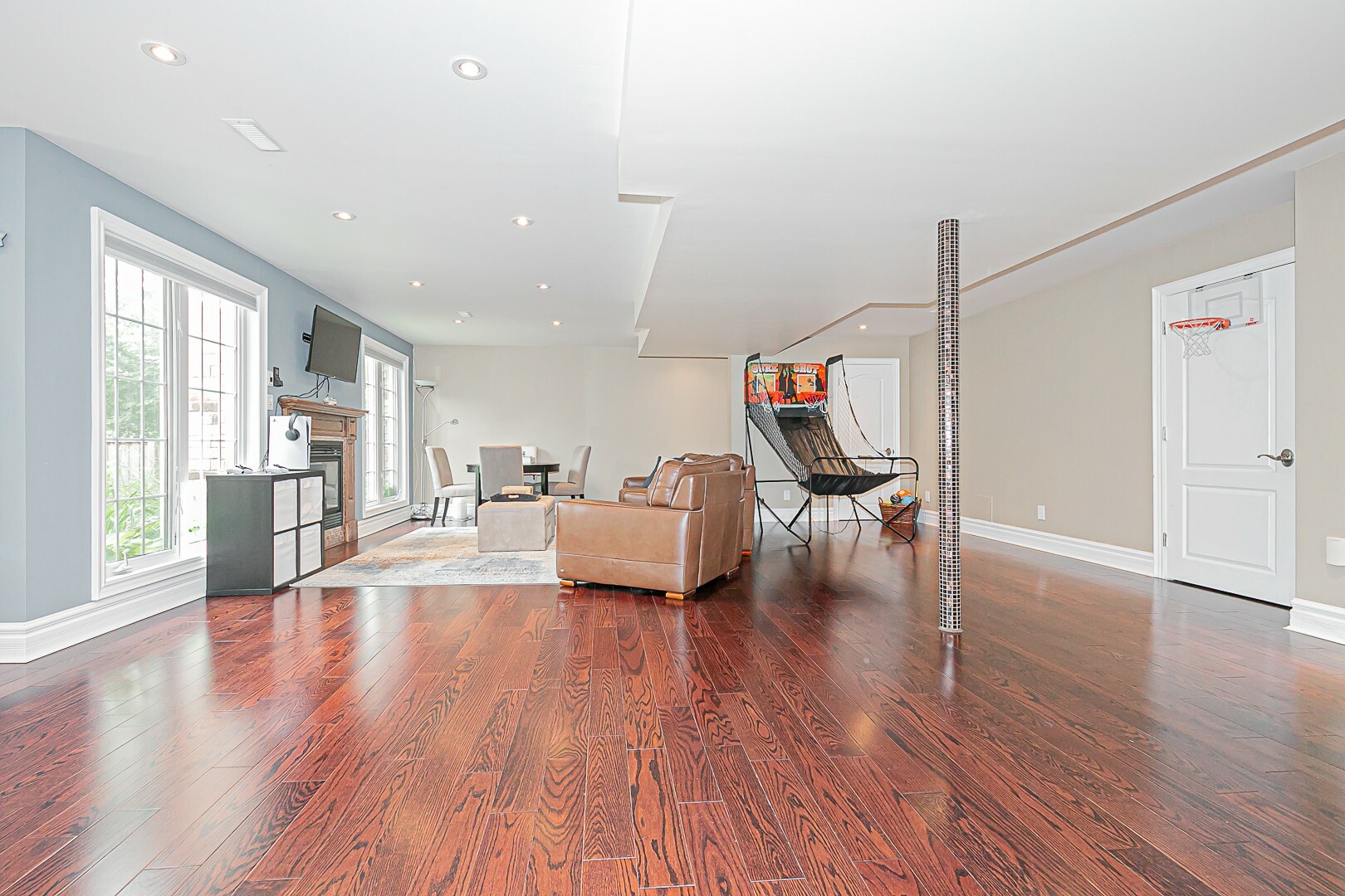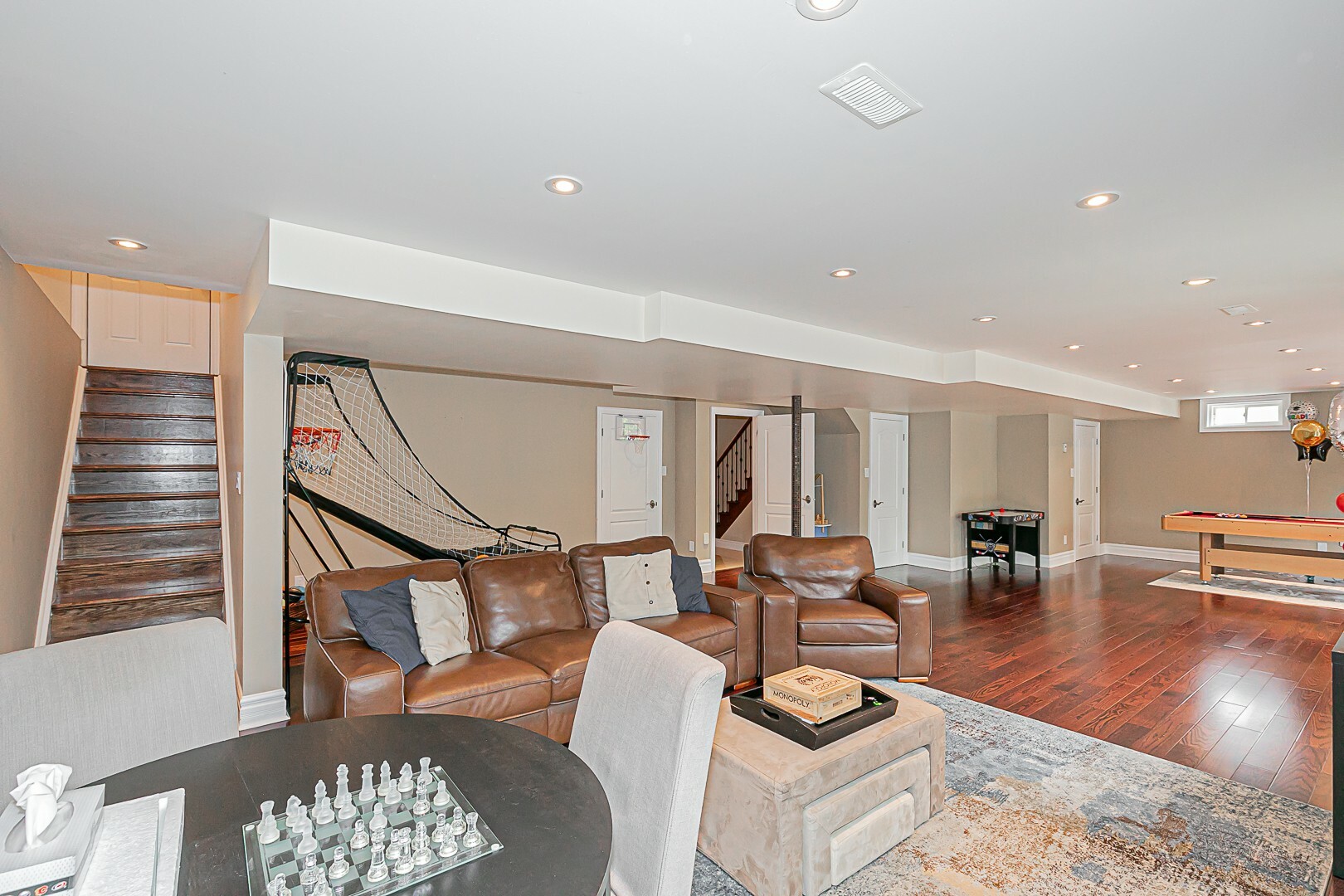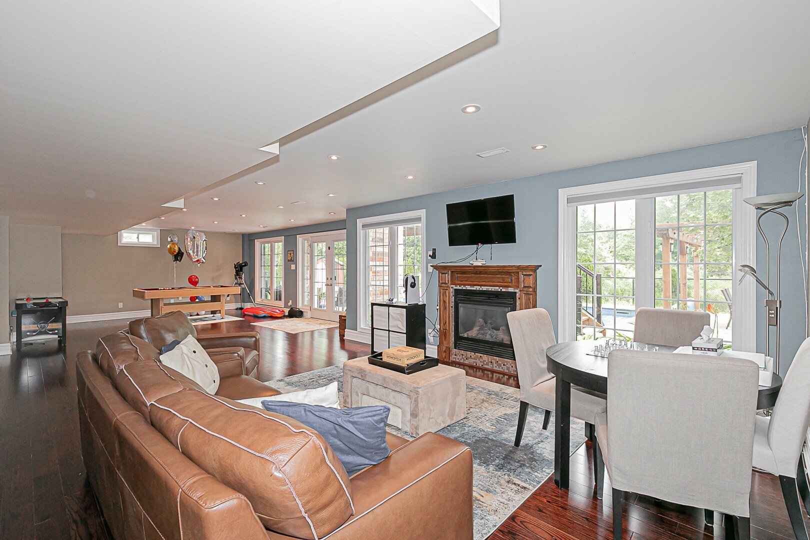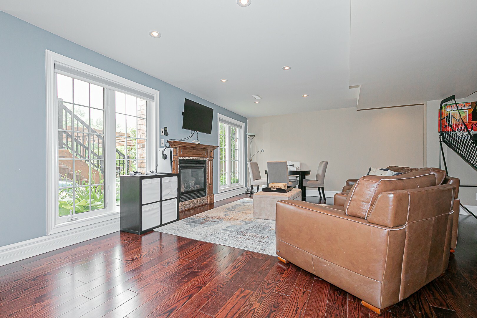 The main level boasts a four-piece bathroom, a convenient garage entry, a well-appointed laundry room, and a second staircase leading to the basement. This thoughtful design allows for potential in-law accommodations or simply provides the opportunity to enjoy the expansive living space in the basement. The lower level features a cozy gas fireplace, an exercise room, a luxurious four-piece bathroom, a sauna for indulgent relaxation, and a versatile den/office or additional bedroom. A cantina and ample storage space complete this level.