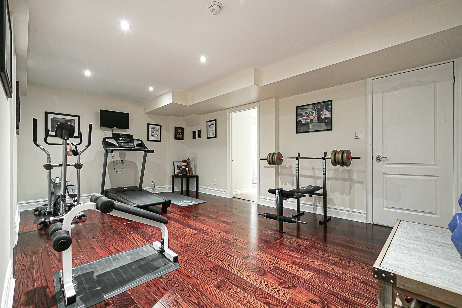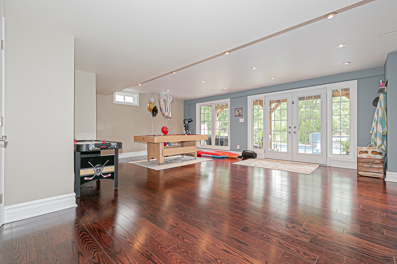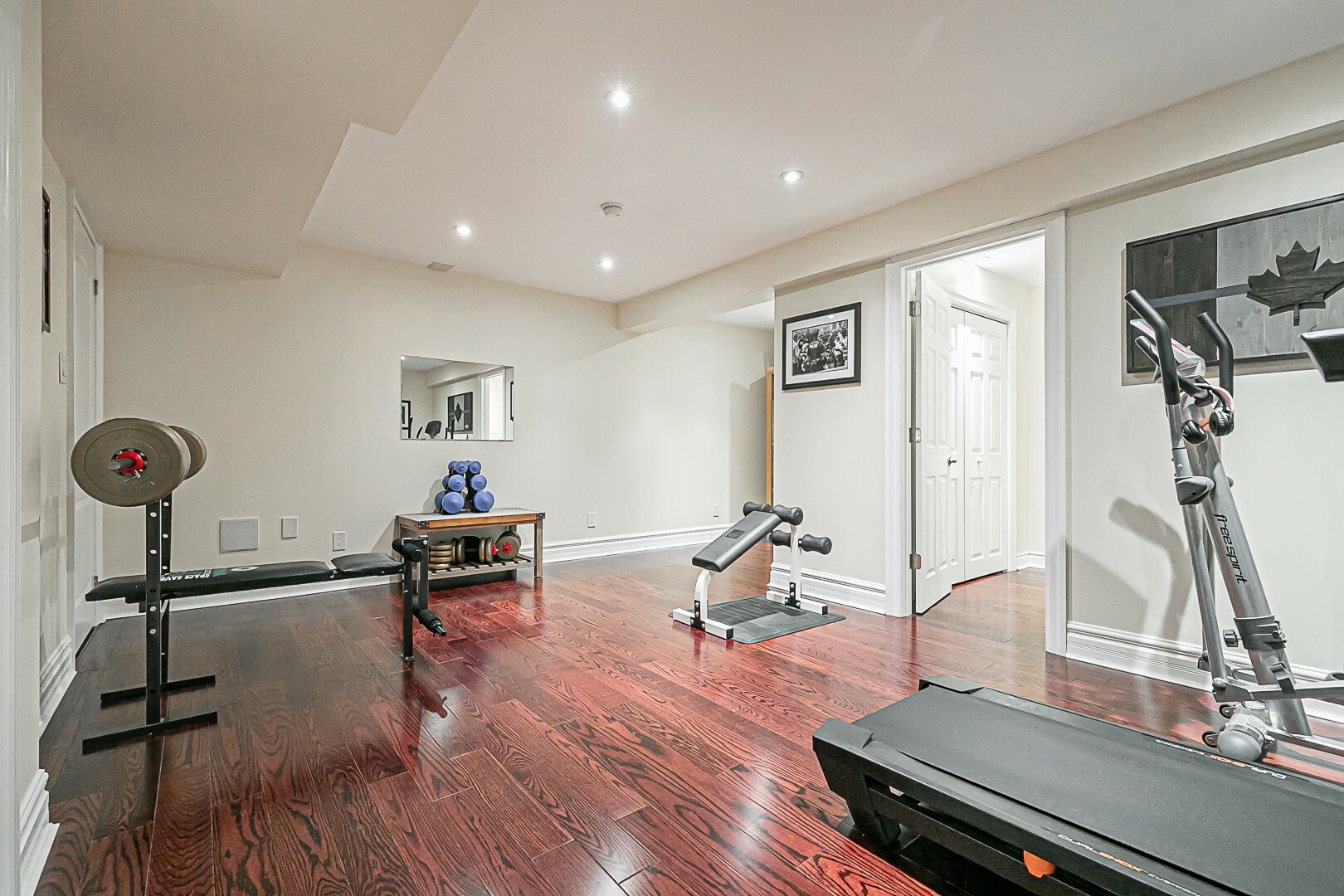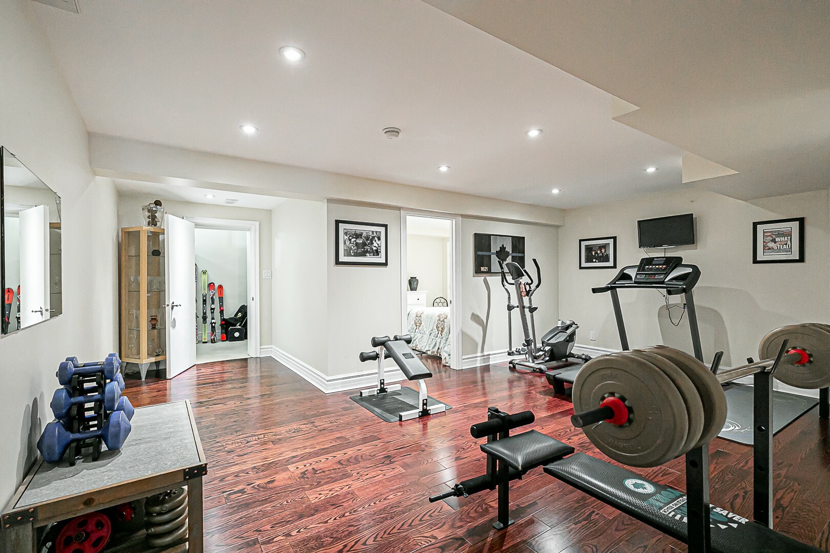 The main level boasts a four-piece bathroom, a convenient garage entry, a well-appointed laundry room, and a second staircase leading to the basement. This thoughtful design allows for potential in-law accommodations or simply provides the opportunity to enjoy the expansive living space in the basement. The lower level features a cozy gas fireplace, an exercise room, a luxurious four-piece bathroom, a sauna for indulgent relaxation, and a versatile den/office or additional bedroom. A cantina and ample storage space complete this level.