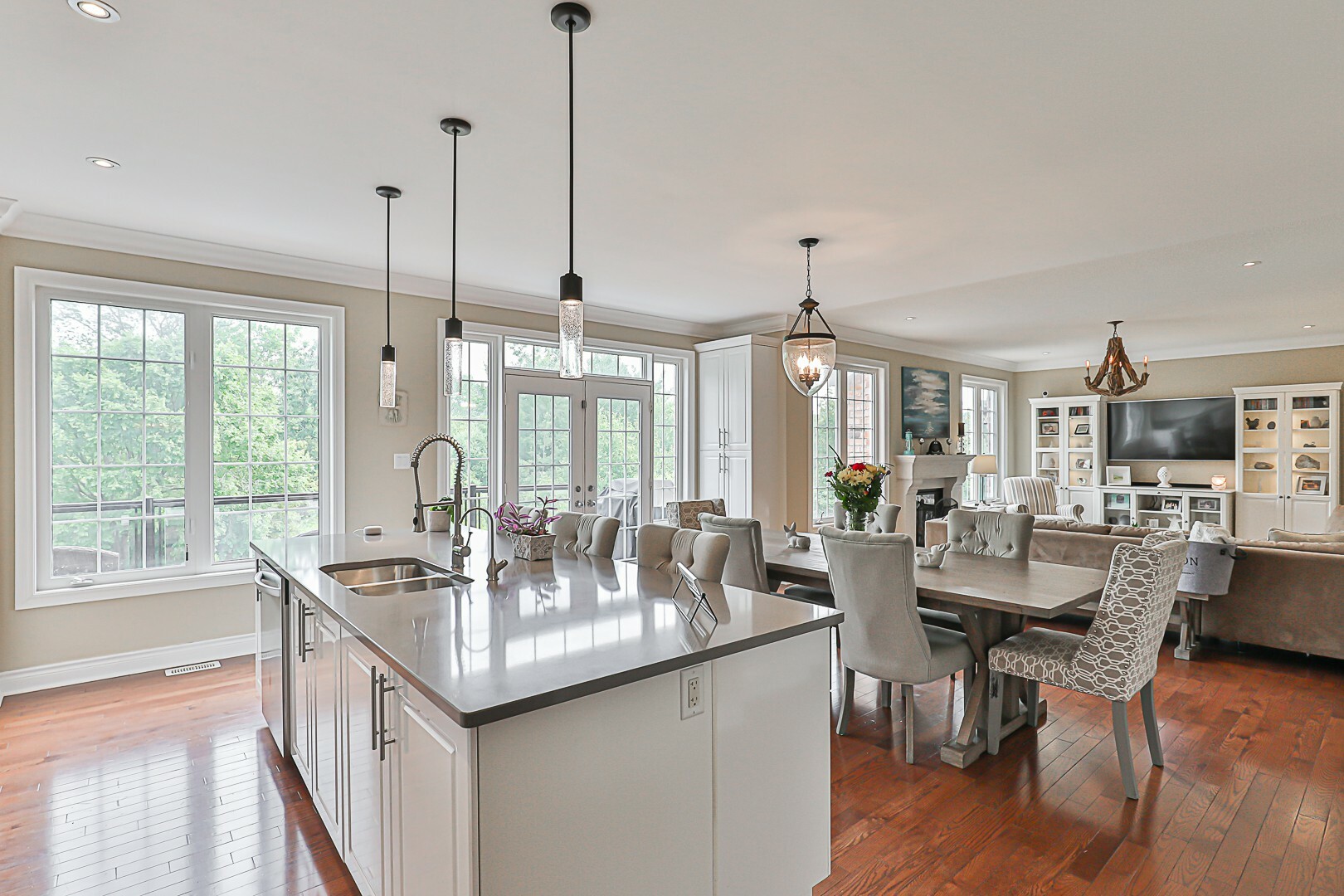 Approaching the house, you'll be greeted by a welcoming west-facing front porch, inviting you into this immaculate and contemporary residence. The open concept family area and kitchen overlook the lush green space, fostering a seamless connection with nature. On the other hand, the living, dining, and den areas exude an air of formality, creating perfect spaces for entertaining and special occasions.