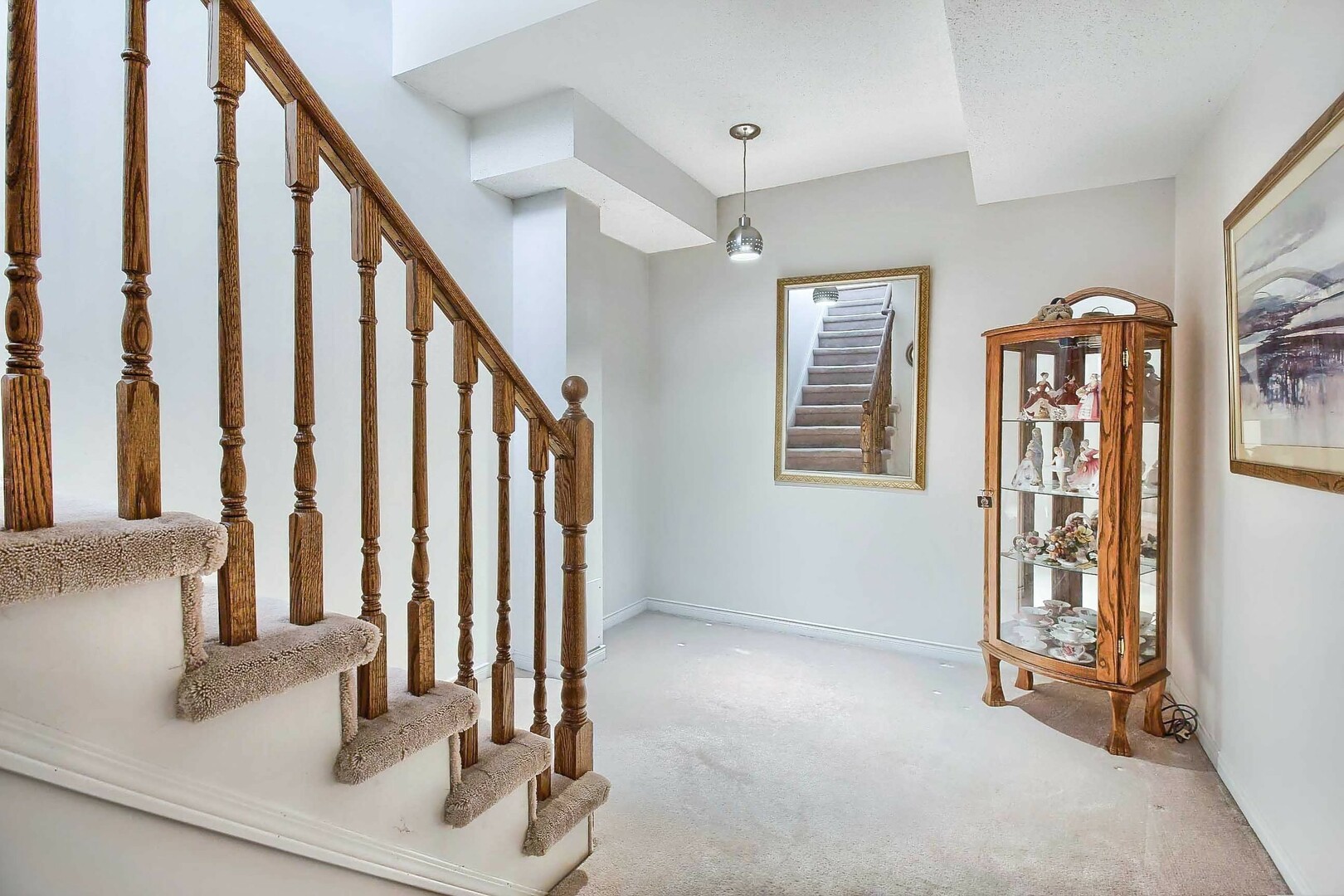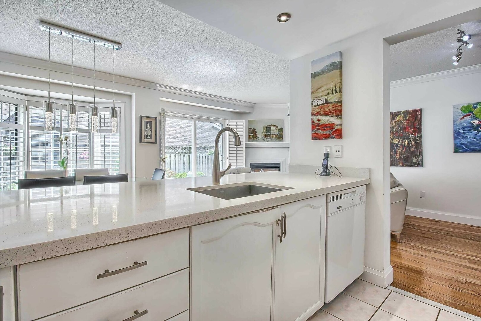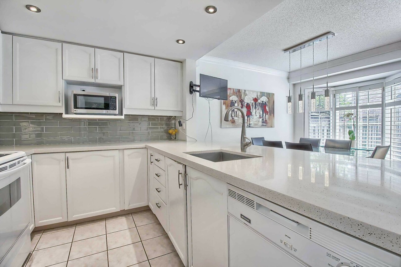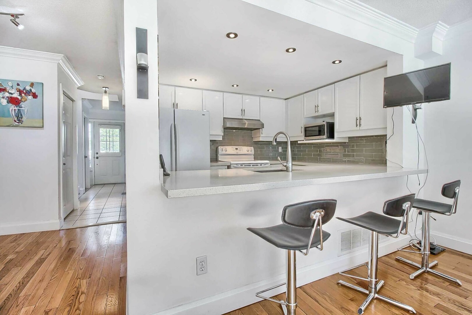 Welcome to the Prestigious Roseland Green Condo Townhouse Complex located in downtown Burlington. This open concept main floor boasts the following features an open concept kitchen with stone counter tops, backsplash, modern LED lighting, a dining room with a bay window, a living room with a gas fireplace, a two piece powder room & sliding door with access to a walkout to a private beautifully landscaped fenced-in yard. The 2nd floor boasts a skylight at the top of stairs, two full bathrooms, three bright spacious bedrooms, the primary bedroom features a three piece ensuite & a generously-sized closet. The finished basement has a good size recreation room and a separate laundry room. This home includes all the appliances, central vacuum attachments, garage door opener, all electric light fixtures, & window coverings.