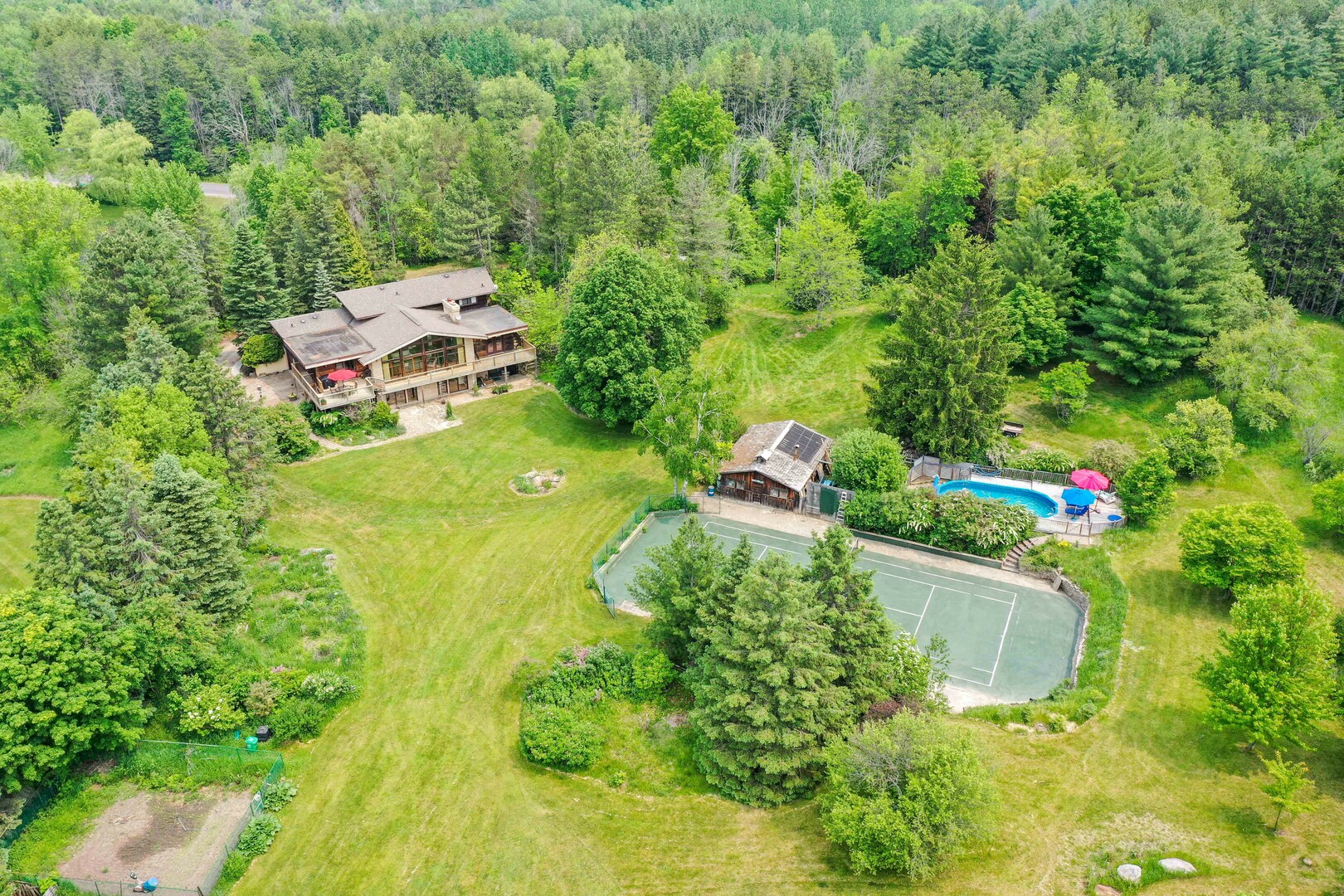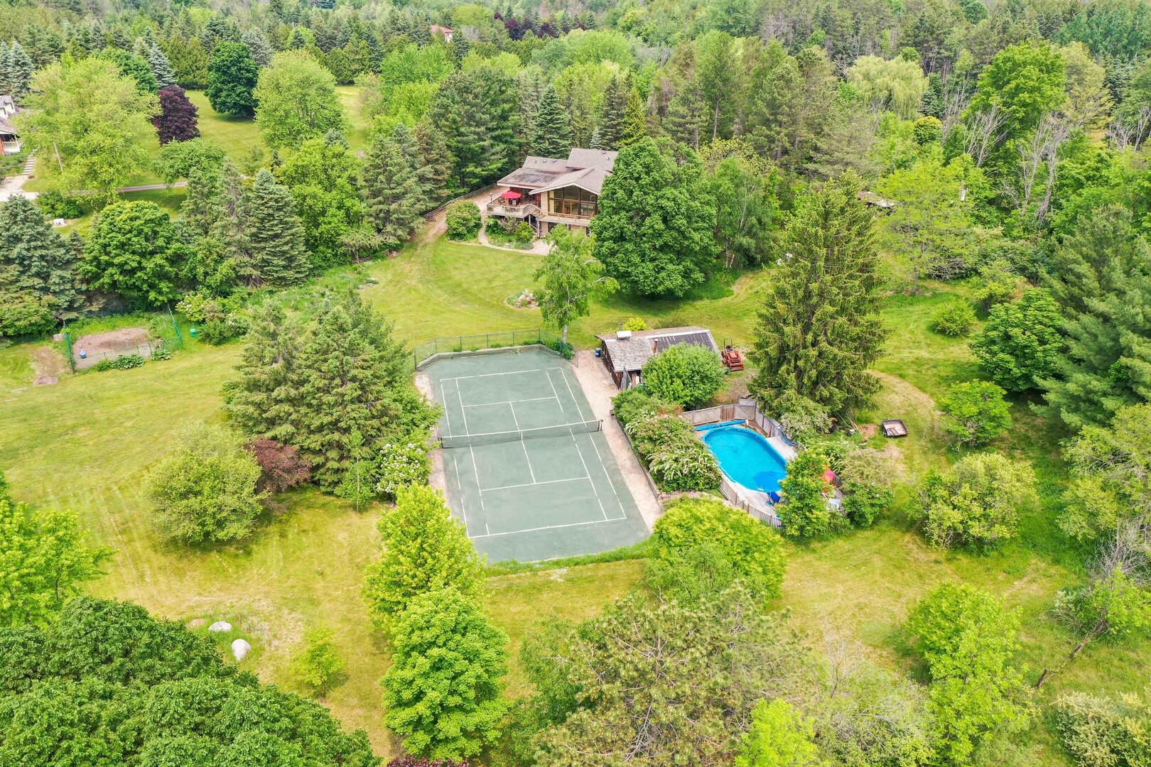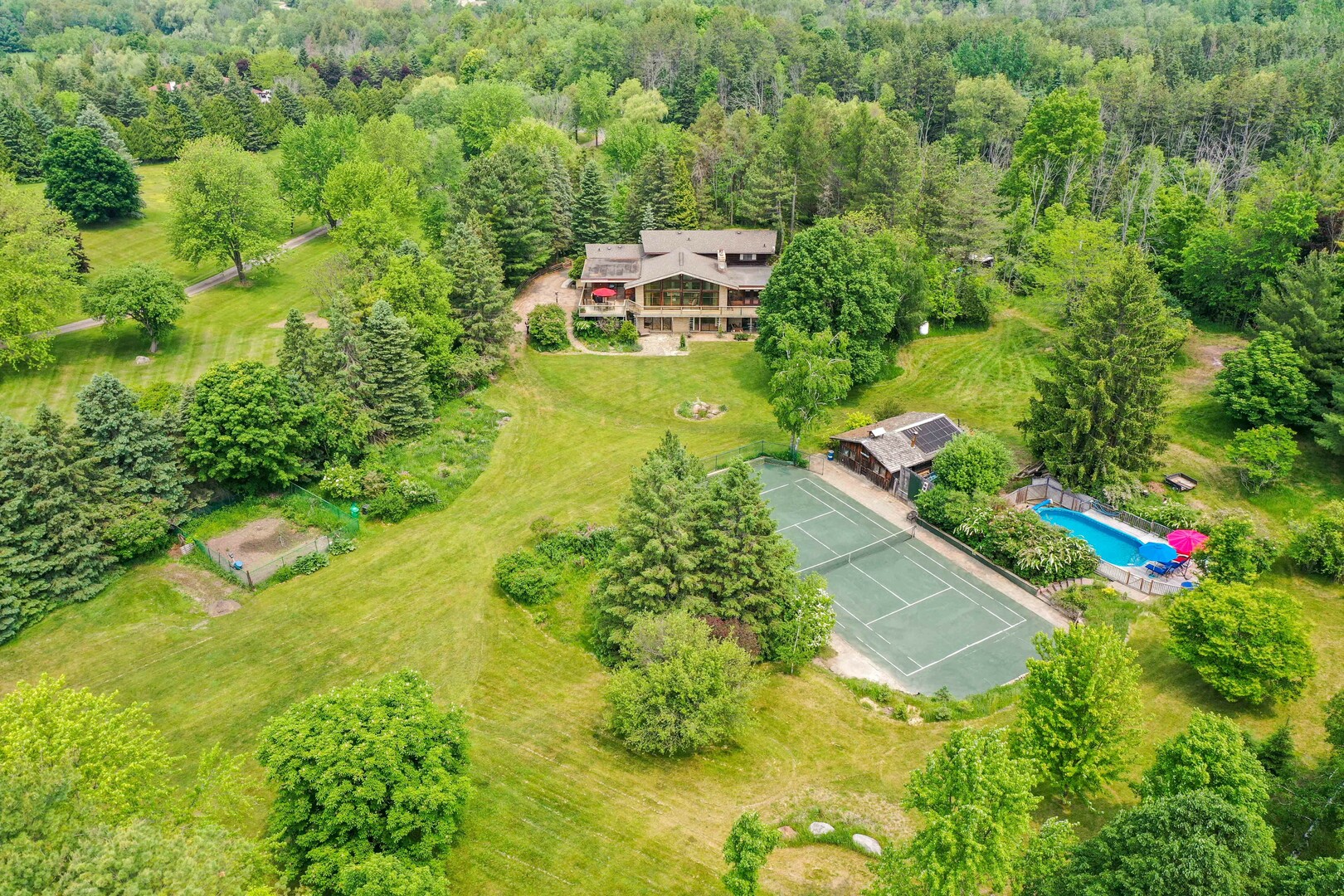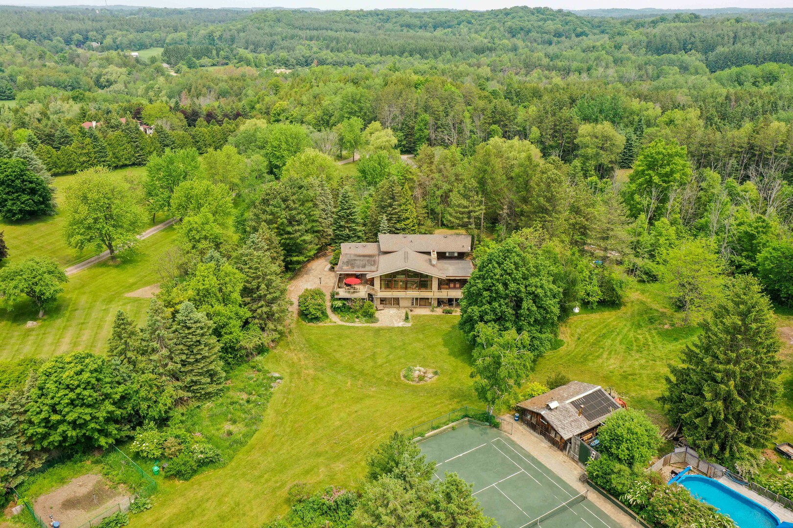 A stunning, secluded estate in one of the most desirable areas of Caledon, five minutes from Palgrave. This 7.42 acre property boasts two large, spring-fed ponds and extensive landscaped grounds with dozens of specimen trees, shrubbery and gardens. It also includes a tennis court, large golf green and pool. The European-designed, custom-built home has a spacious open-concept floor plan featuring a spectacular great room with a 16-ft. cathedral ceiling, a wall of south-facing windows and sliding glass doors overlooking the grounds, and a towering fieldstone fireplace on the main level. This level also includes the dining room, kitchen, and cozy library with a gas fireplace. On the upper level, the large principal bedroom has a beautiful ensuite with a walk-in marble shower and garden doors to a rear patio. Lower level with full walkouts features a large recreation room with a wood-burning fireplace and a spa with hot tub and sauna. Do Not Miss Out on viewing this Gem!