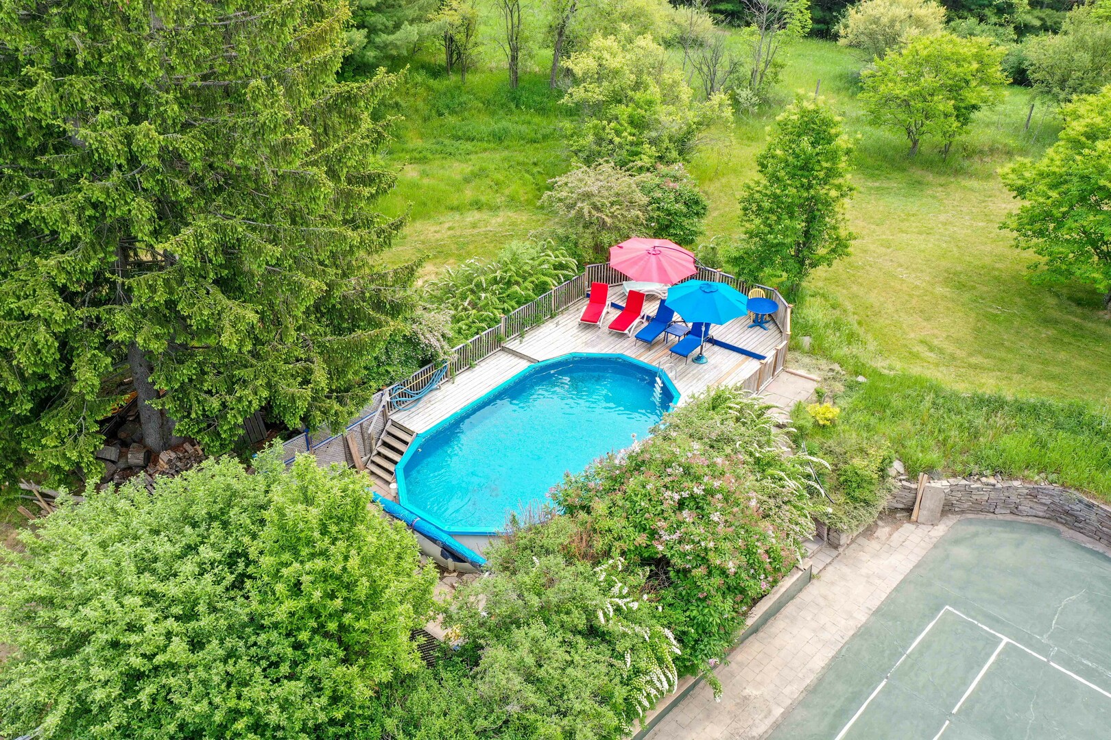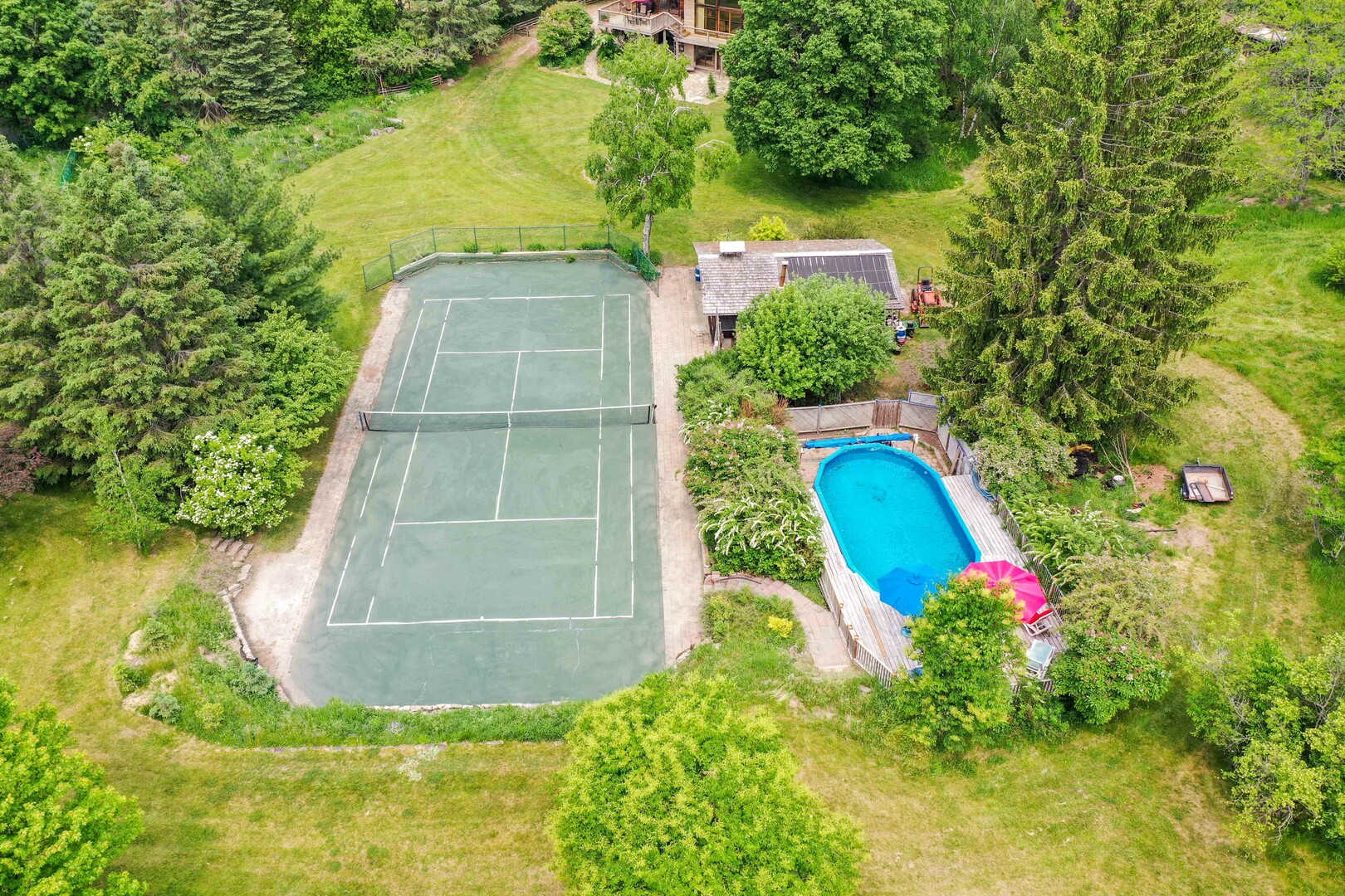 A stunning, secluded estate in one of the most desirable areas of Caledon, five minutes from Palgrave. At 7.42 acres, this property boasts two large, spring-fed ponds and extensive landscaped grounds with dozens of specimen trees, shrubbery and gardens. It also includes a tennis court, large golf green and pool. The European-designed, custom-built home with over 5000squft of finished living space has a spacious open-concept floor plan featuring a spectacular great room with a 16-ft. cathedral ceiling, a wall of south-facing windows and sliding glass doors overlooking the grounds, and a towering fieldstone fireplace on the main level. This level also includes the dining room, kitchen, and cozy library with a gas fireplace. On the upper level, the large principal bedroom has a beautiful ensuite with a walk-in marble shower and garden doors to a rear patio. Lower level with full walkouts features a large recreation room with a wood-burning fireplace and a spa with hot tub and sauna. Do Not Miss Out on viewing this Gem!