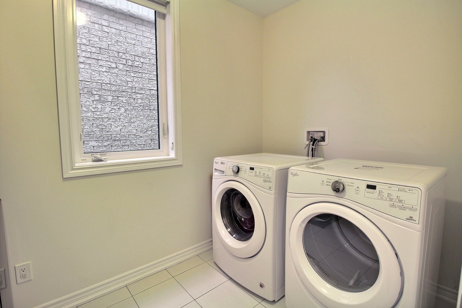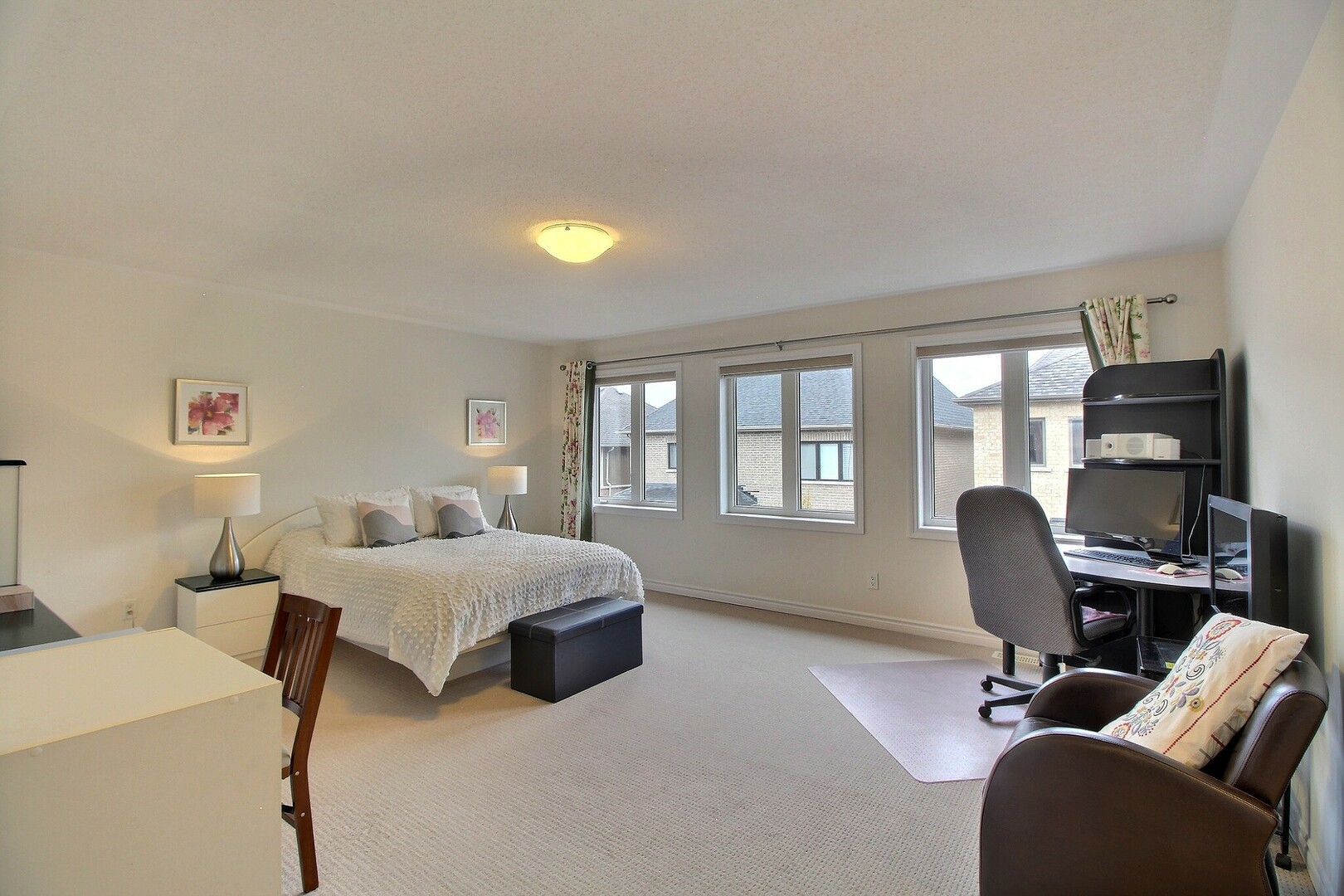 The chef’s kitchen boasts a large island, modern backsplash, a powerful commercial-style 8-inch exhaust range hood, quartz countertops, a slide-in KitchenAid gas stove, and pot lights. Relax in the expansive family room with a gas fireplace, zebra roller blinds, and views of the professionally landscaped and fully fenced backyard. There are four bedrooms and three bathrooms upstairs. The master suite includes two walk-in closets and a luxurious ensuite with a half-wall frameless glass shower, soaker tub, and double sinks. The second bedroom enjoys a private four-piece bathroom, while the other two bedrooms share a semi-ensuite; every bedroom has access to a washroom. A central vacuum system helps you clean your home with ease.