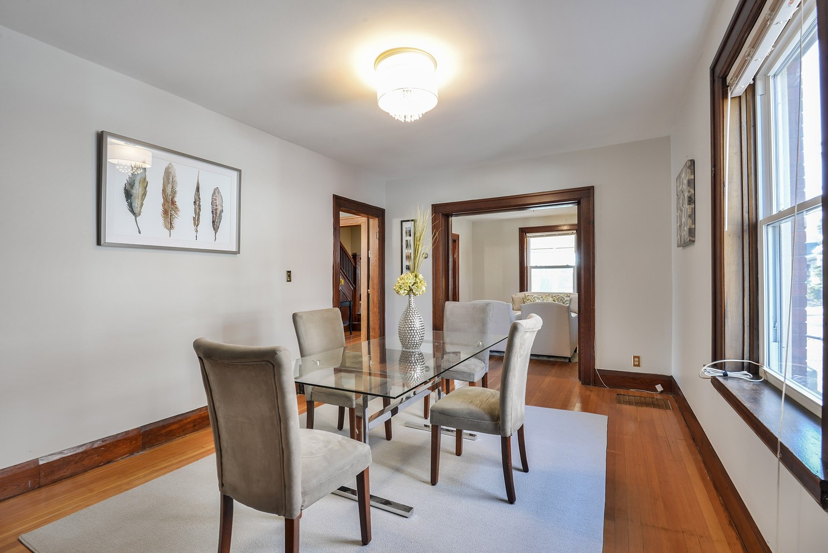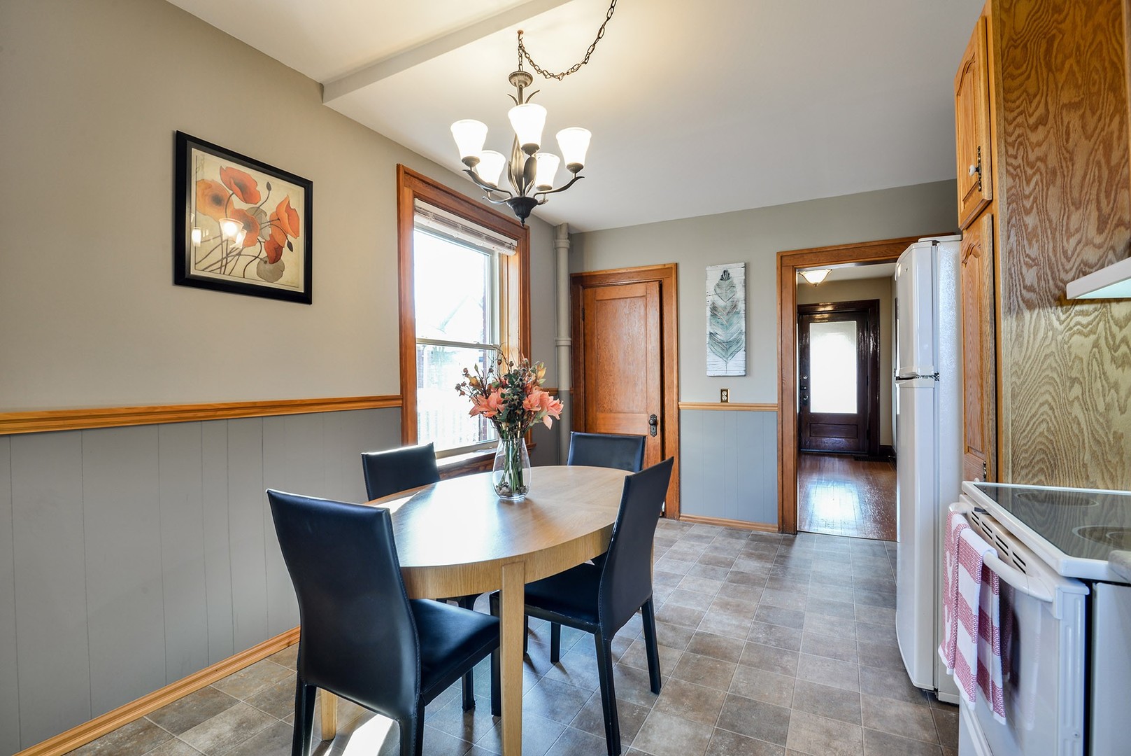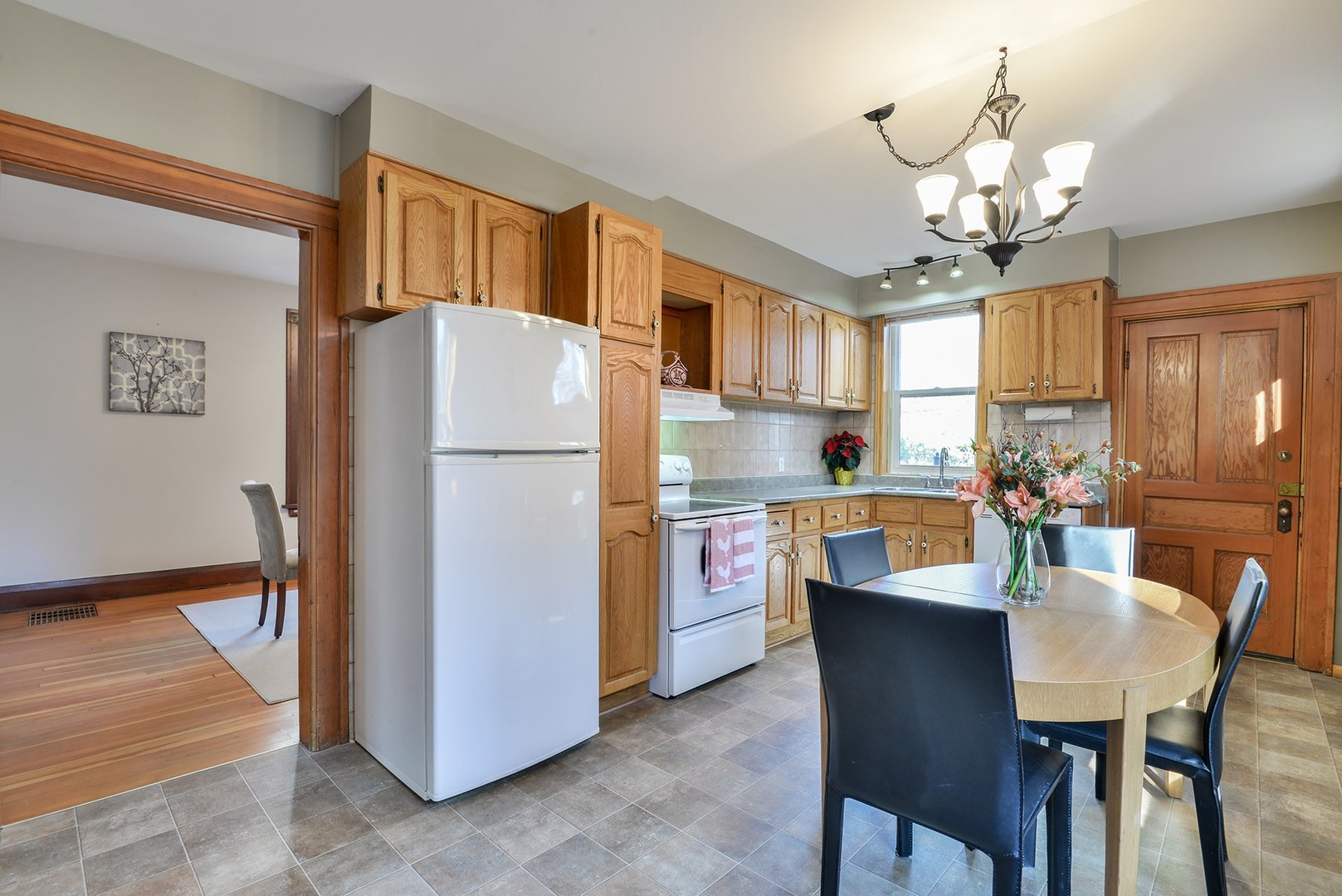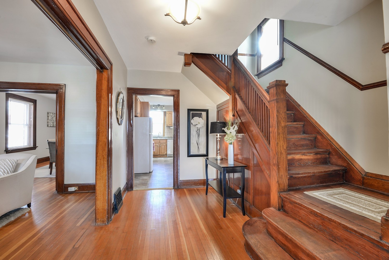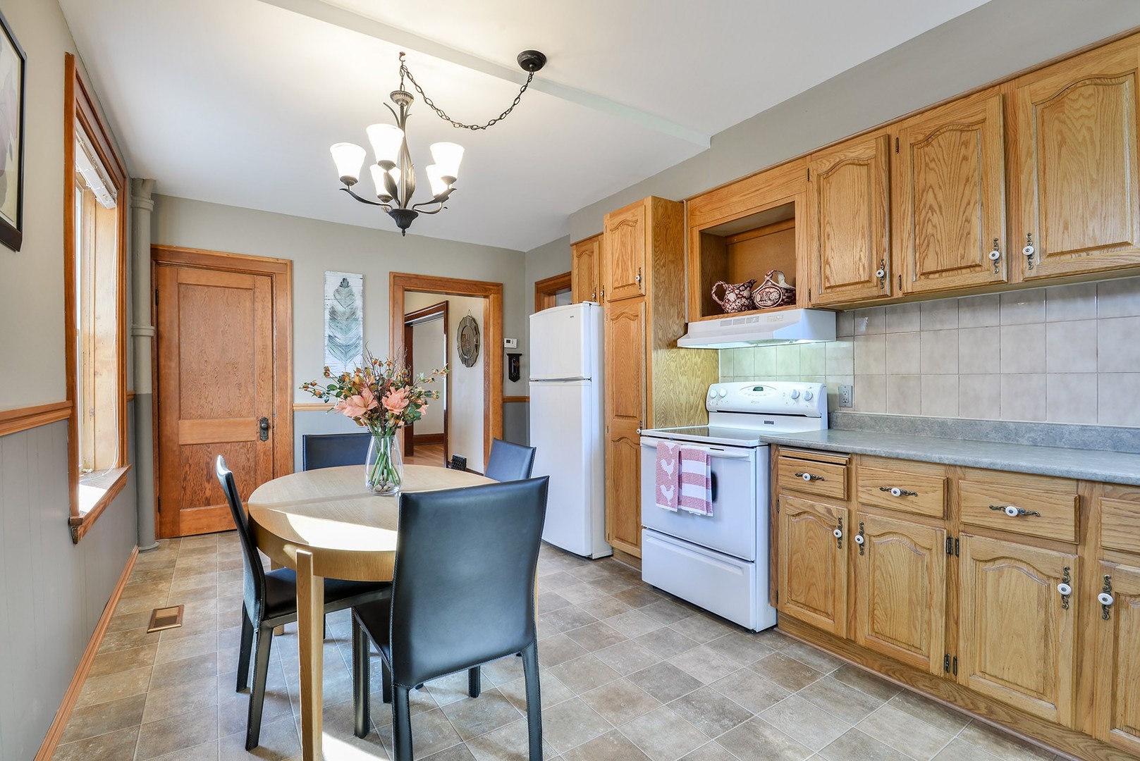 Huge foyer, wide main hall entry, open concept living and dining room combination with original pocket doors. Country size eat-in kitchen with solid oak cabinetry and walk-out to mud room.
