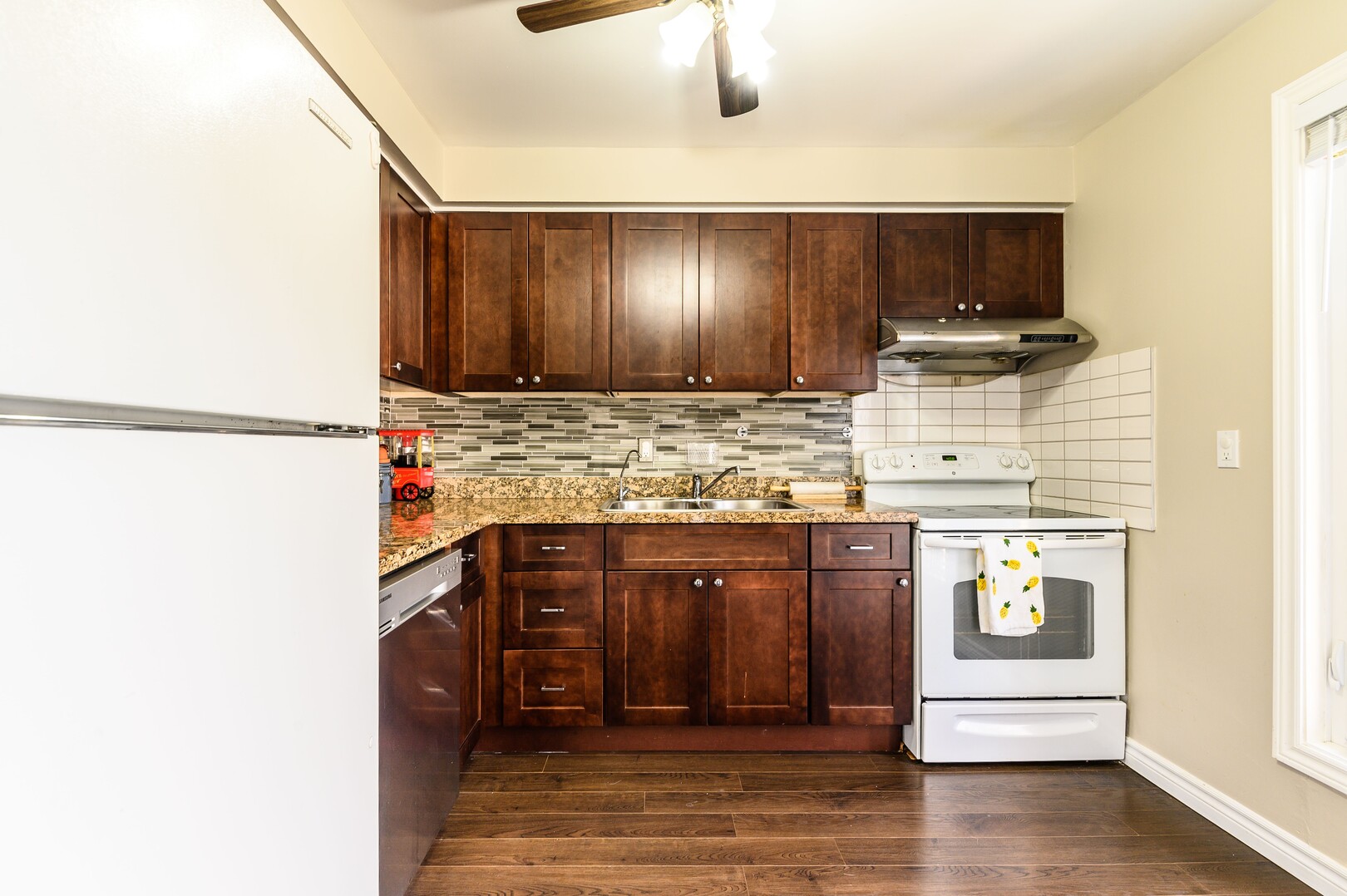 The Main floor boasts a great layout, closet at the entry, Powder room, Dining room, Kitchen and Living-room each with their own Upgrades. Two Glass walkouts From the Dining and Living-room pour on the Sunlight that bounces off Pristine Dark laminate Floors throughout, Large Dining room with Ceiling fan is off the Kitchen adorned Granite counters and beautiful Backsplash!