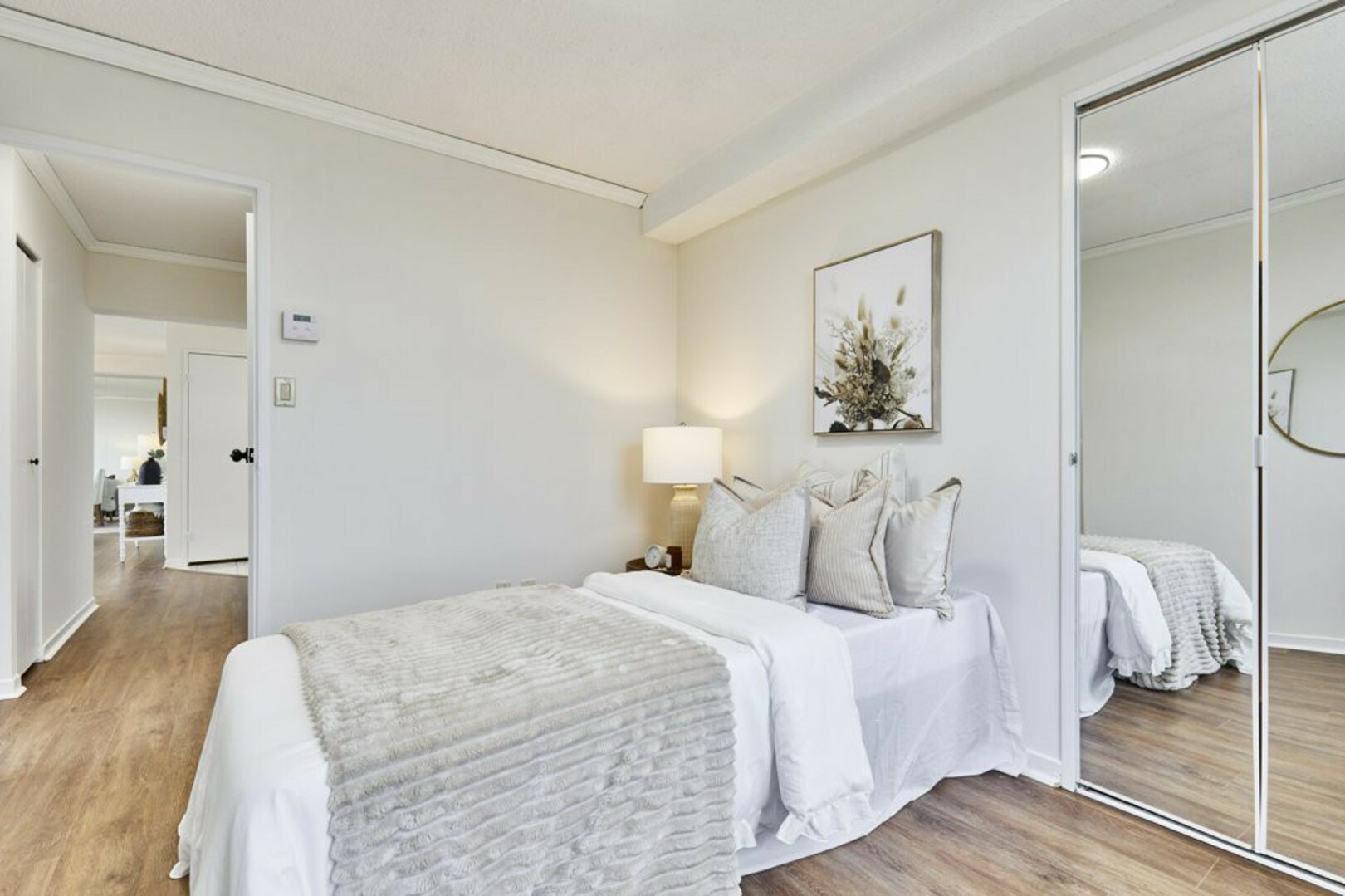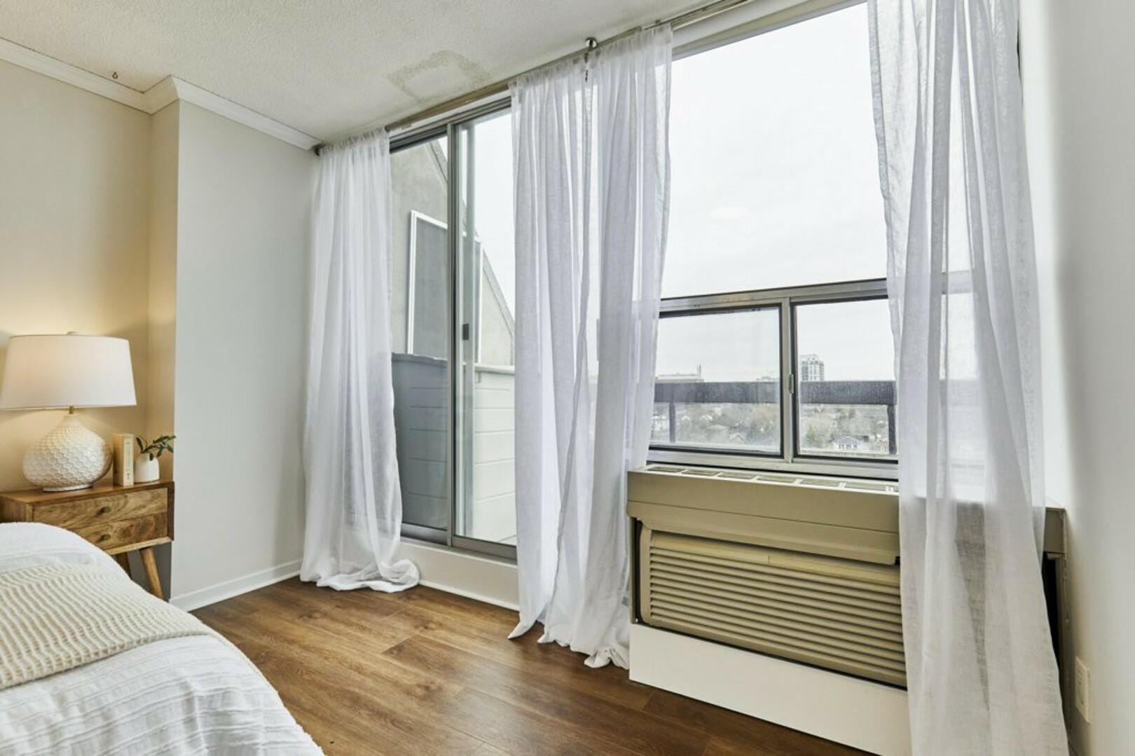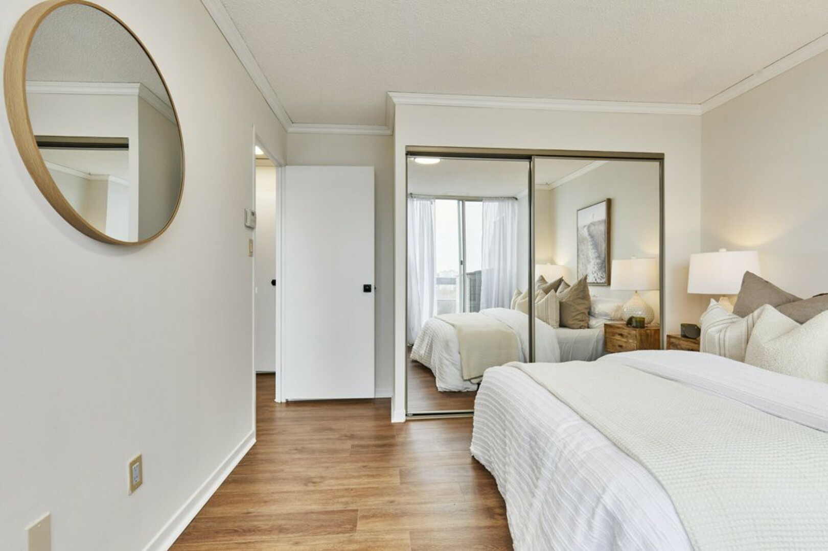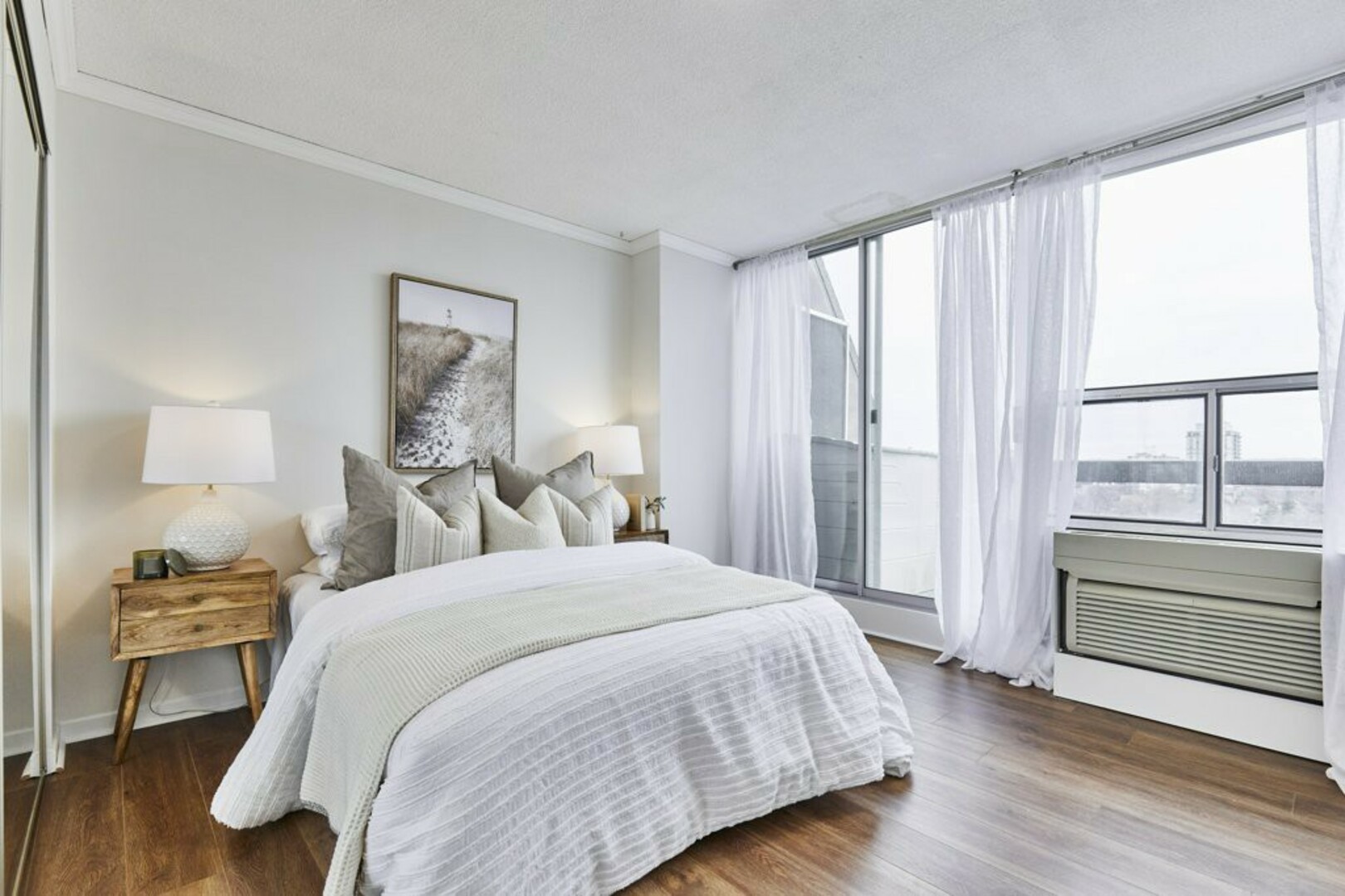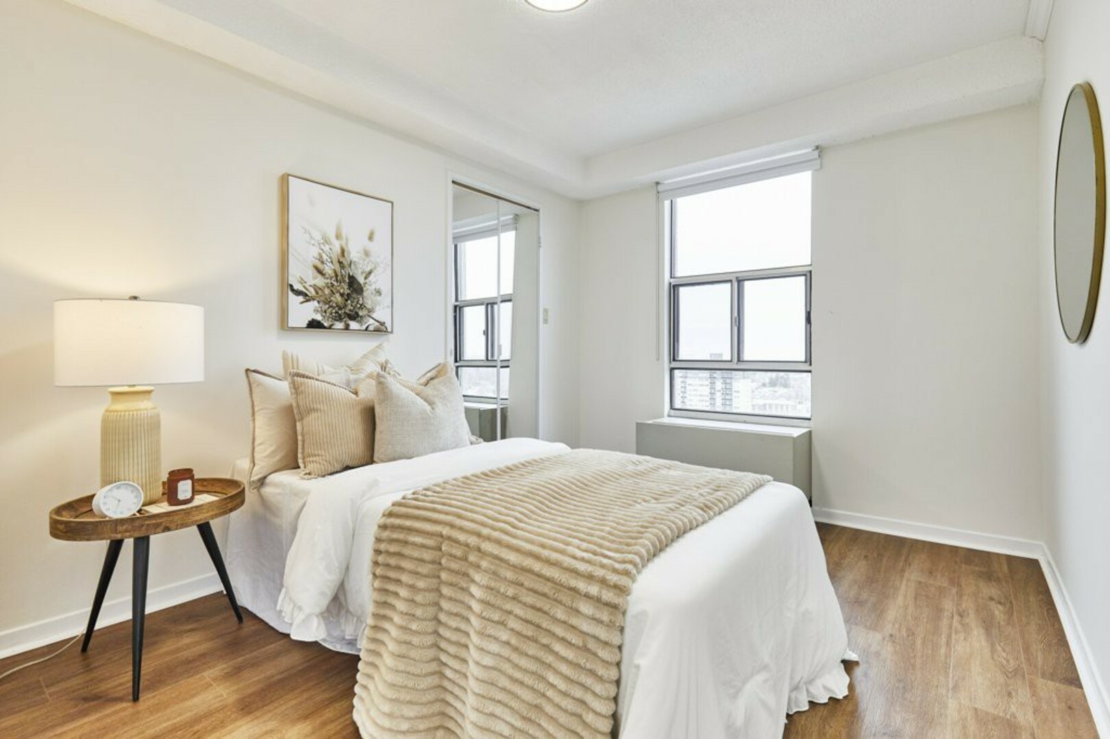 The First bedroom is a bright and welcoming space, featuring extra large windows with serene views of the terrace, lush green space and the city beyond. The brand-new vinyl flooring adds warmth, while the double closet ensures ample storage for all your essentials.