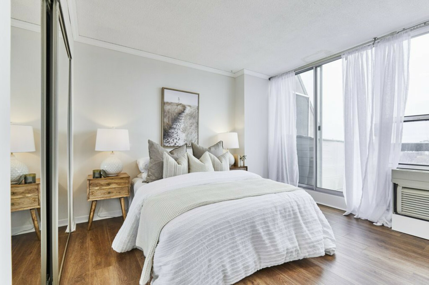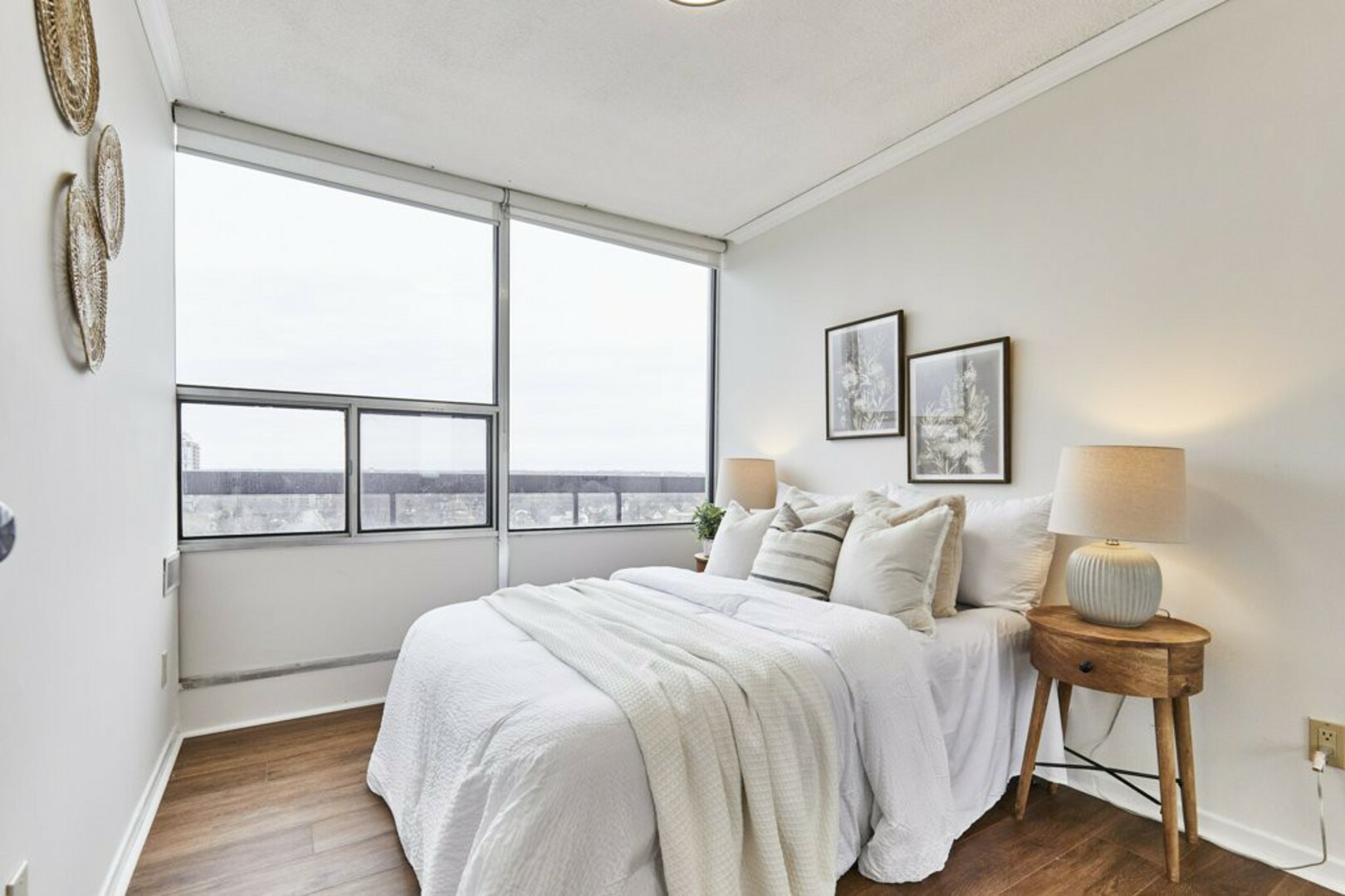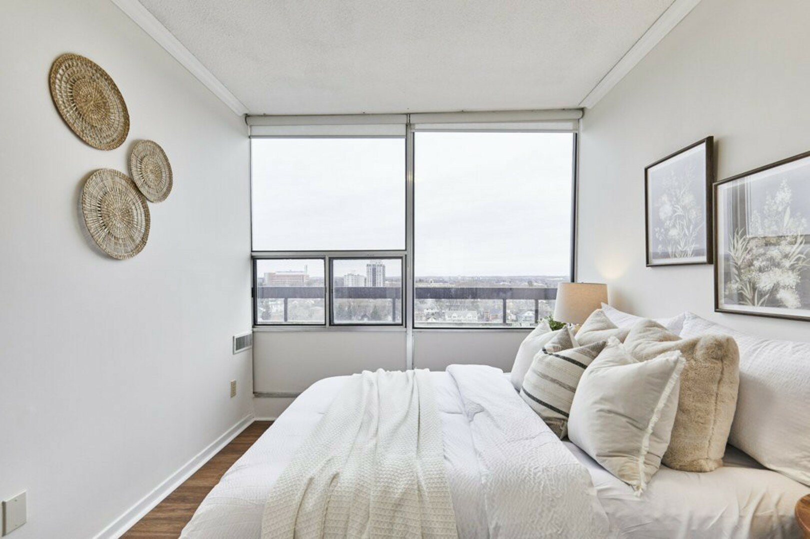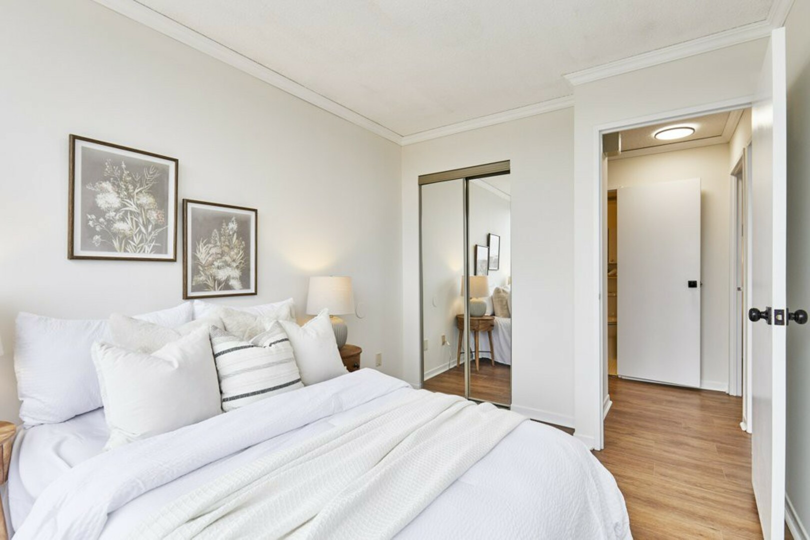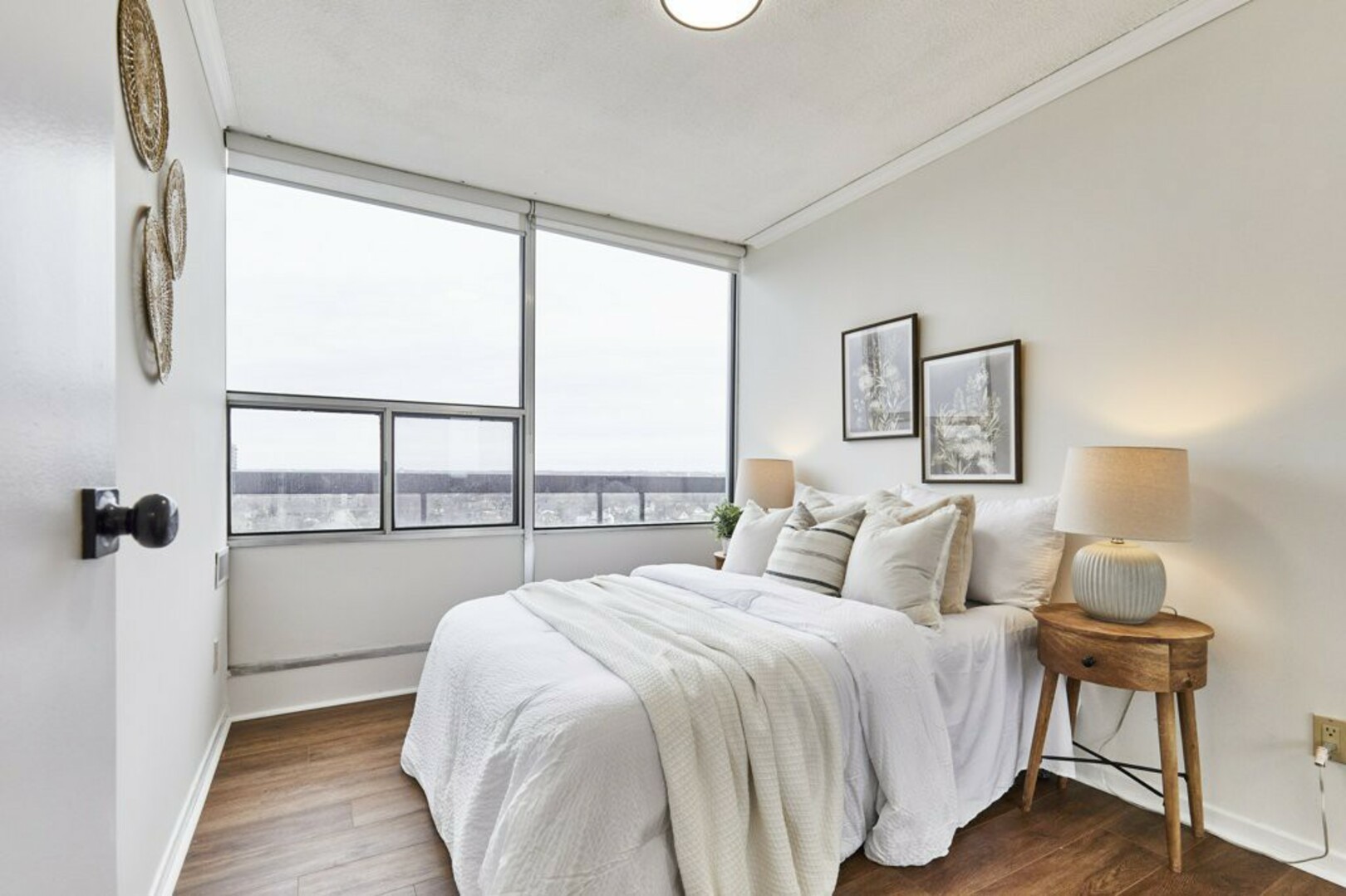 The First bedroom is a bright and welcoming space, featuring extra large windows with serene views of the terrace, lush green space and the city beyond. The brand-new vinyl flooring adds warmth, while the double closet ensures ample storage for all your essentials.