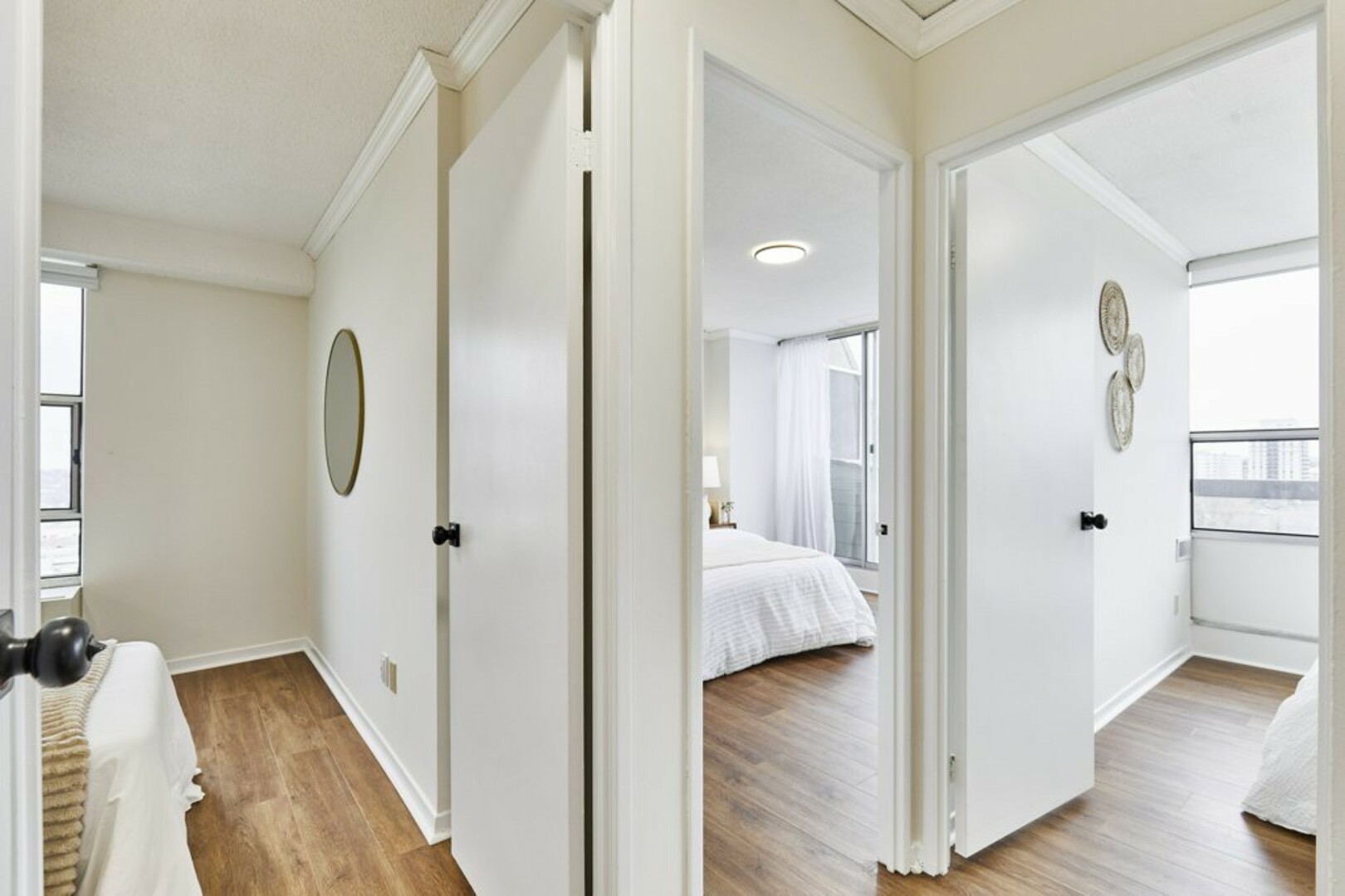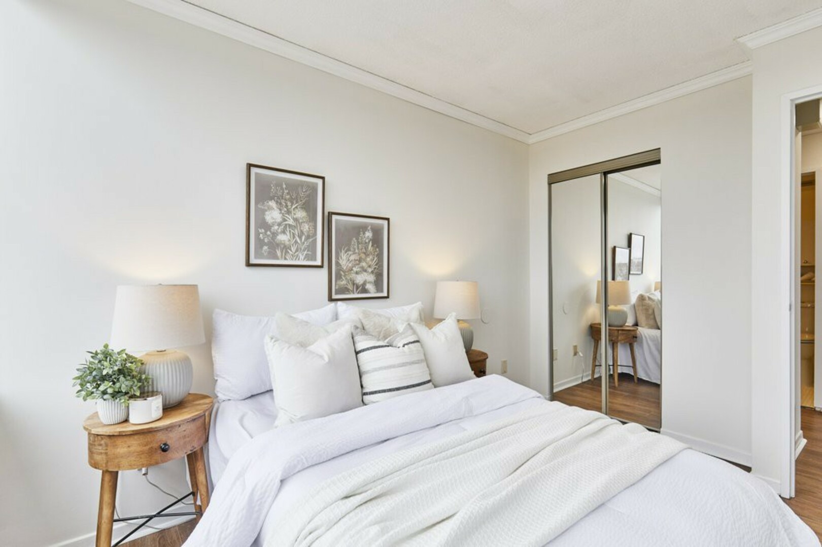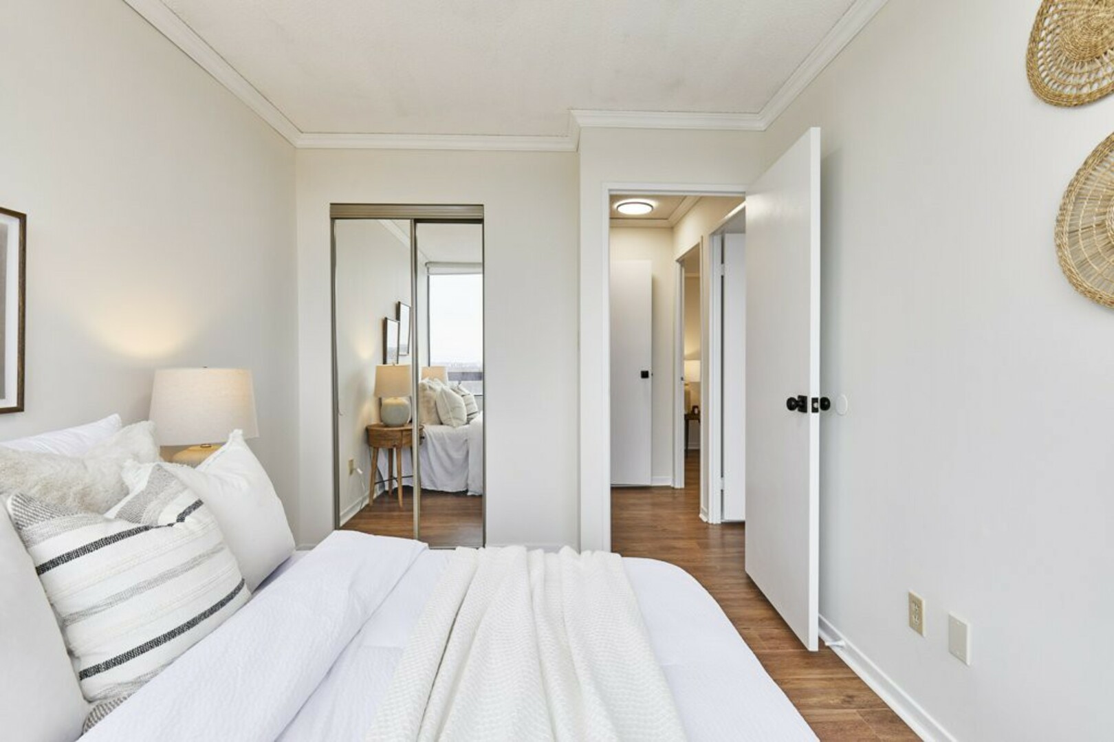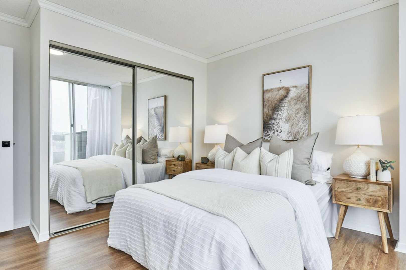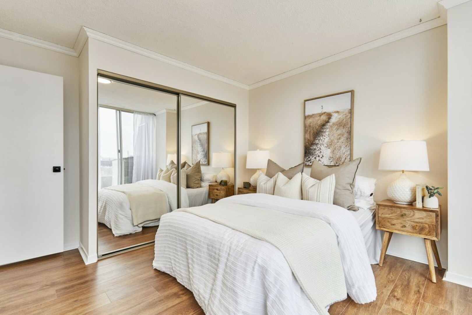 The First bedroom is a bright and welcoming space, featuring extra large windows with serene views of the terrace, lush green space and the city beyond. The brand-new vinyl flooring adds warmth, while the double closet ensures ample storage for all your essentials.