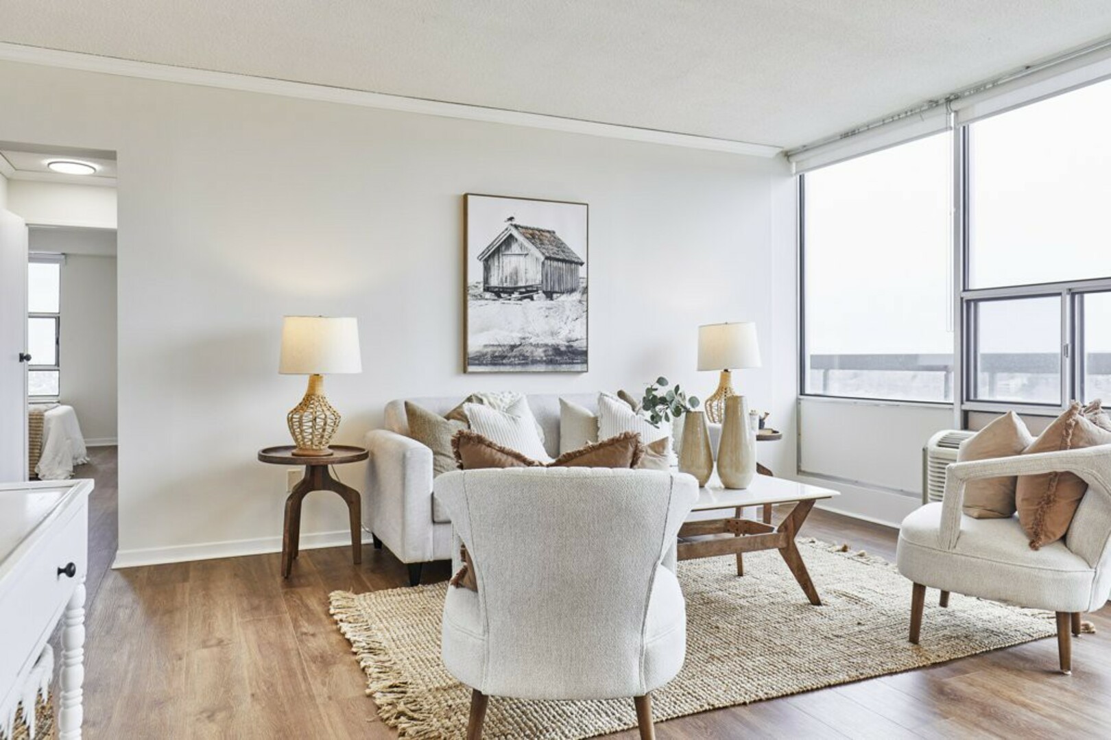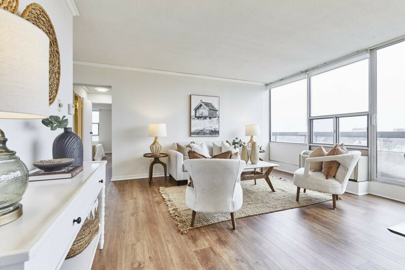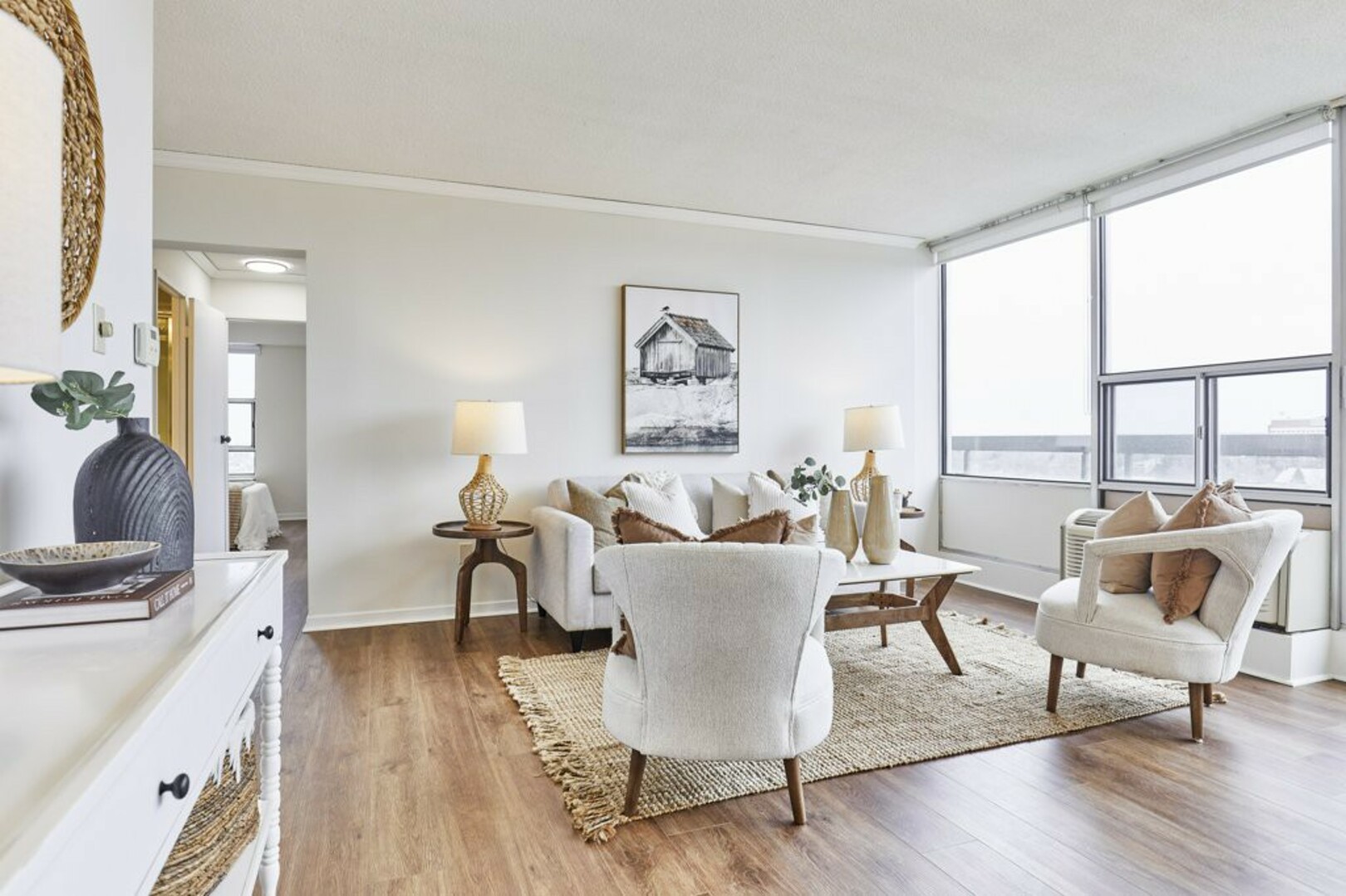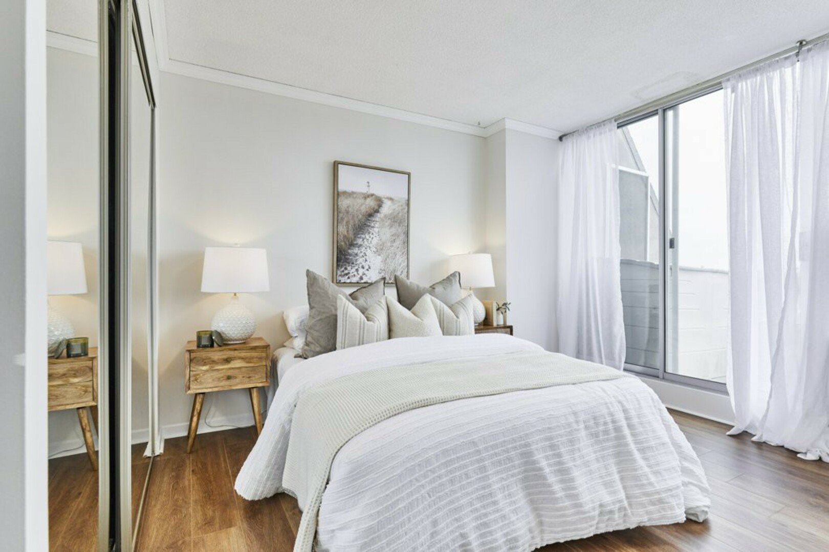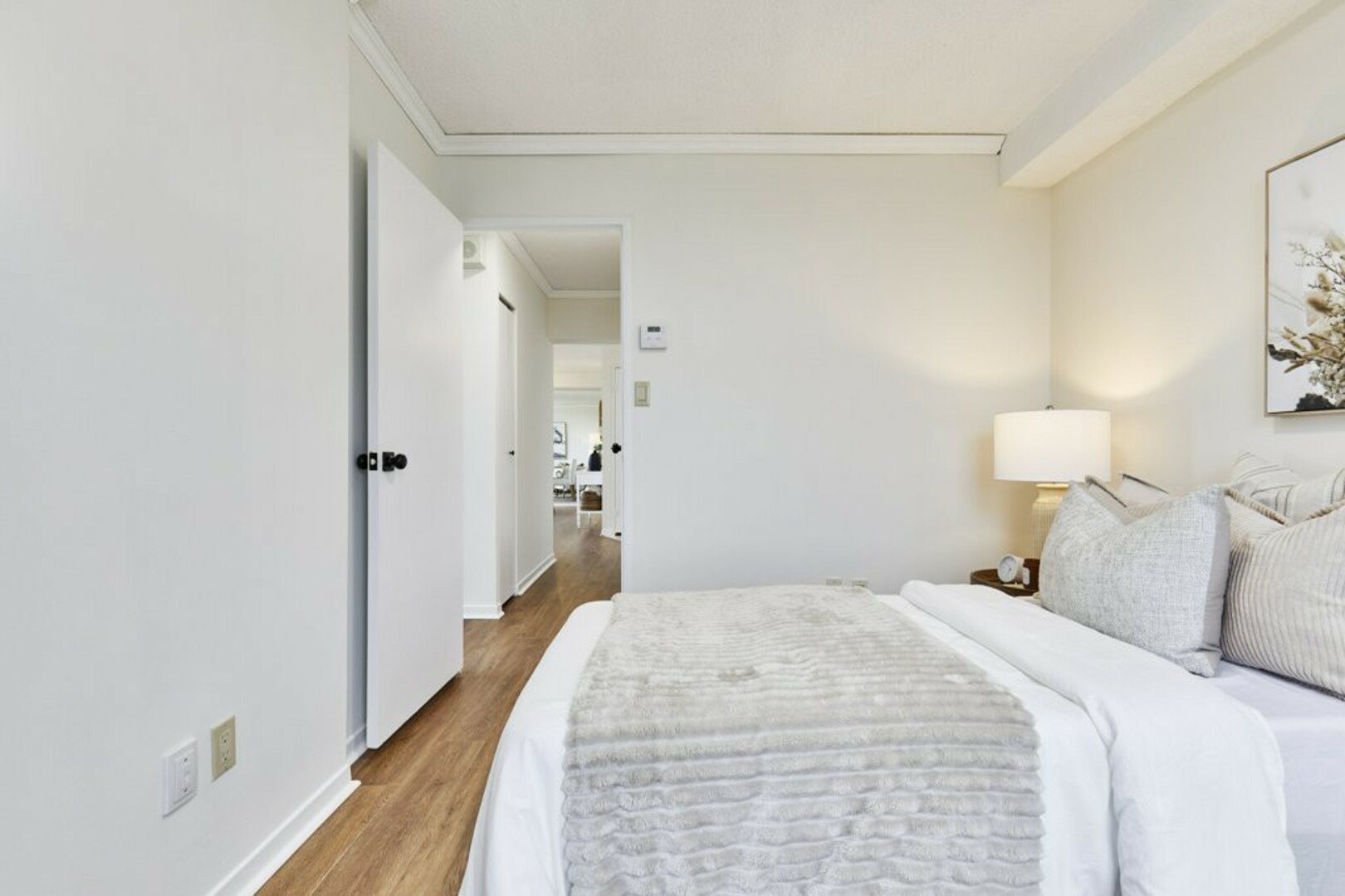 The First bedroom is a bright and welcoming space, featuring extra large windows with serene views of the terrace, lush green space and the city beyond. The brand-new vinyl flooring adds warmth, while the double closet ensures ample storage for all your essentials.