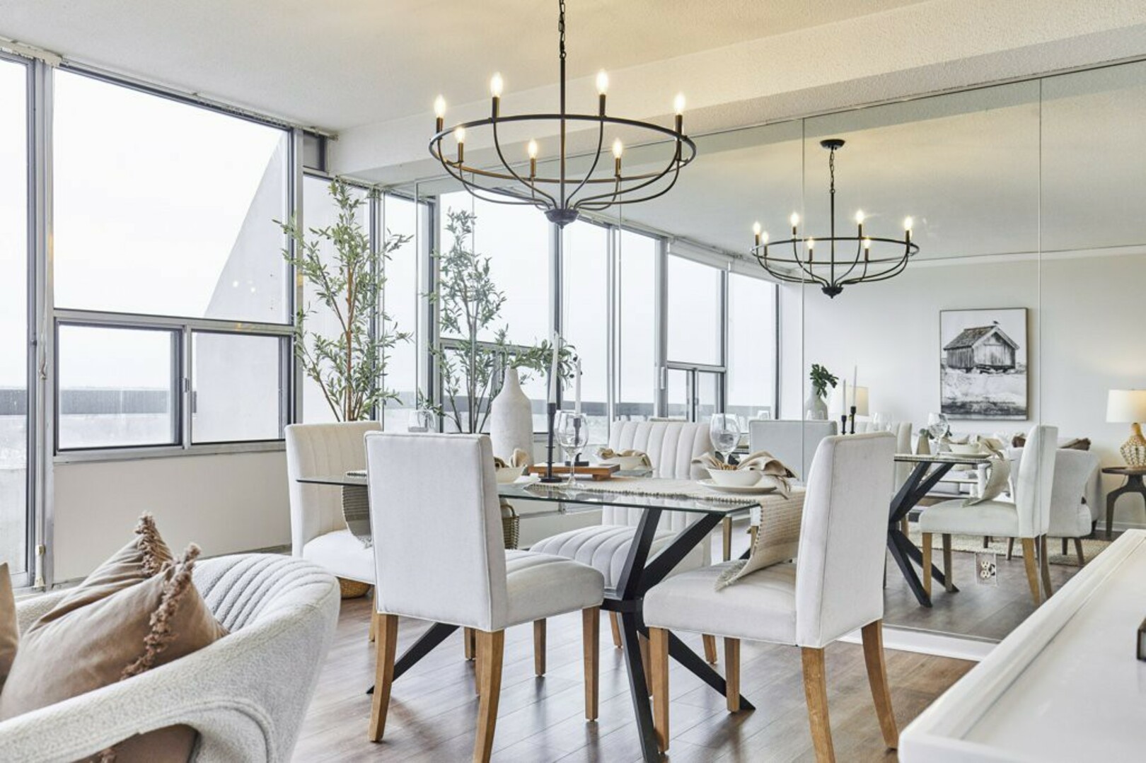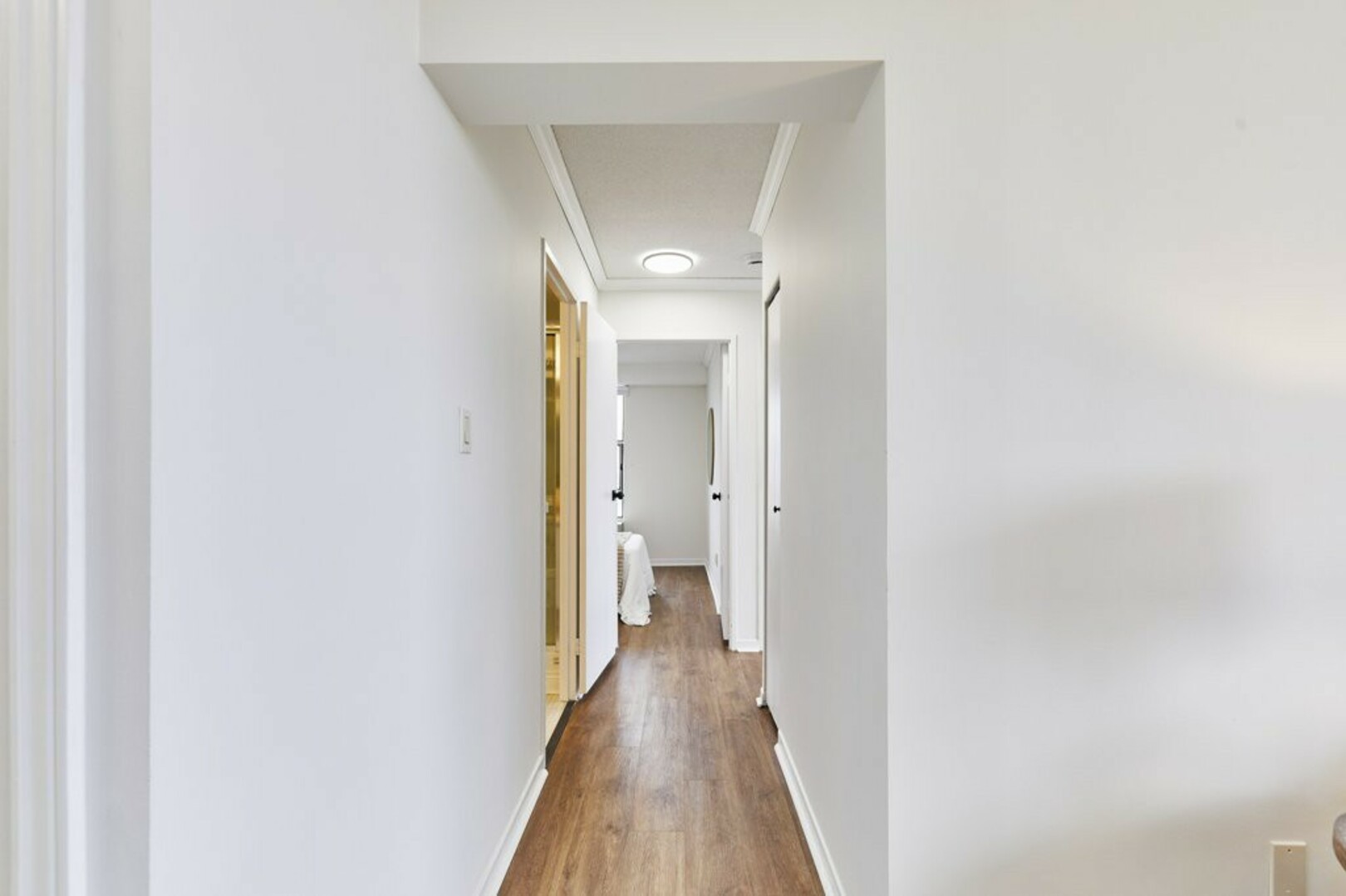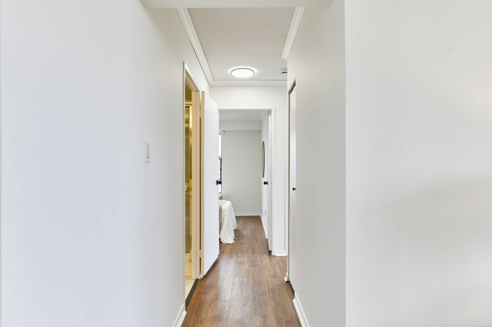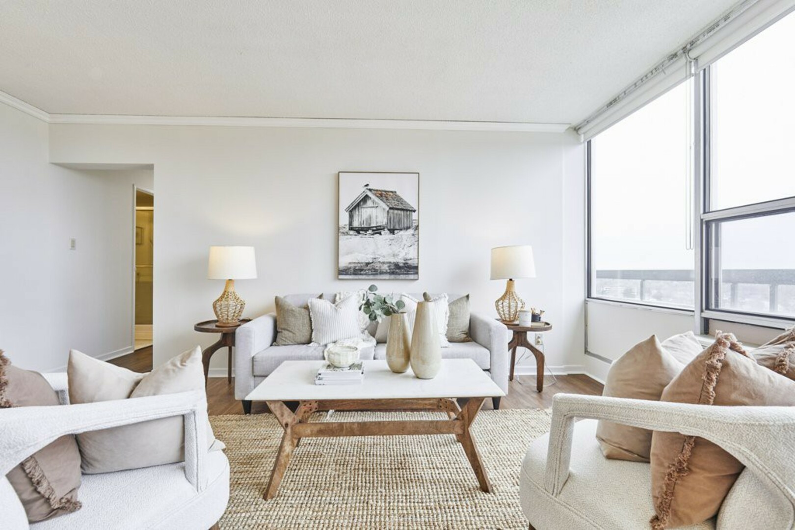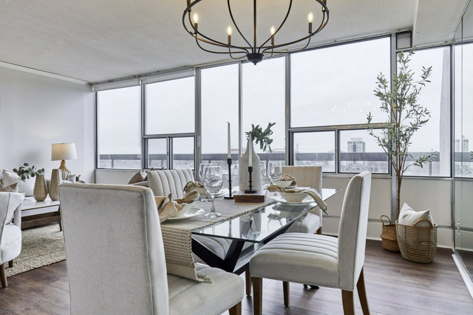 The First bedroom is a bright and welcoming space, featuring extra large windows with serene views of the terrace, lush green space and the city beyond. The brand-new vinyl flooring adds warmth, while the double closet ensures ample storage for all your essentials.