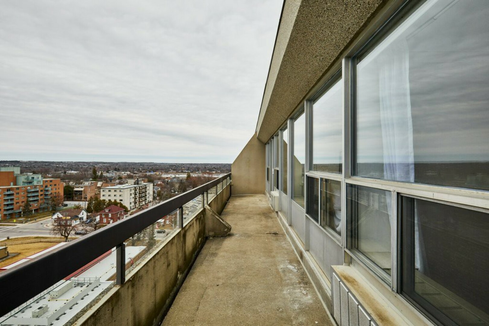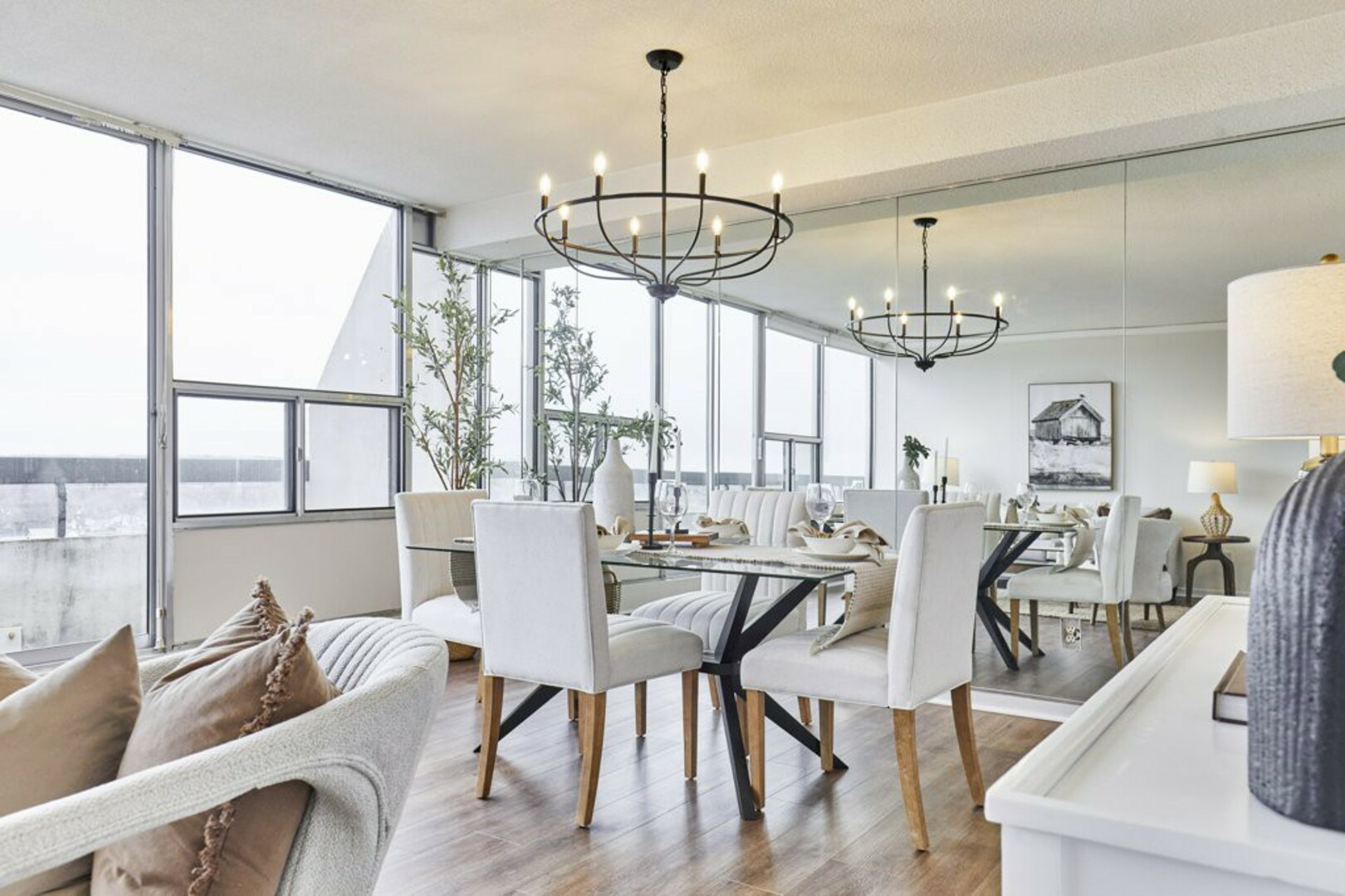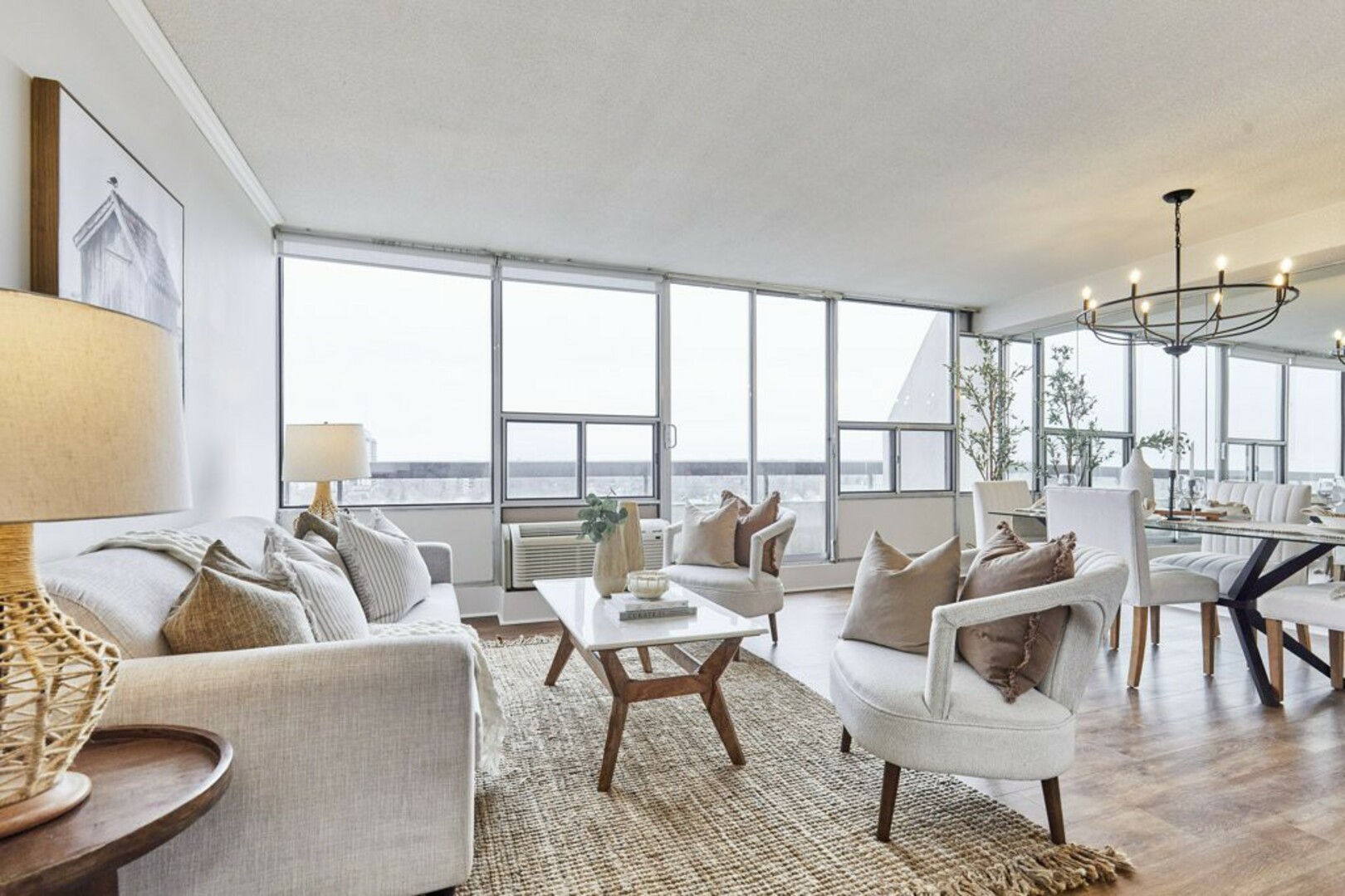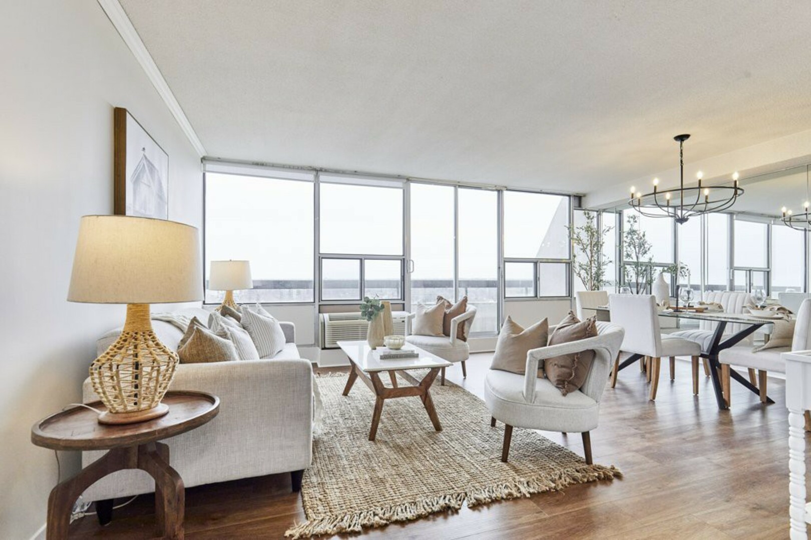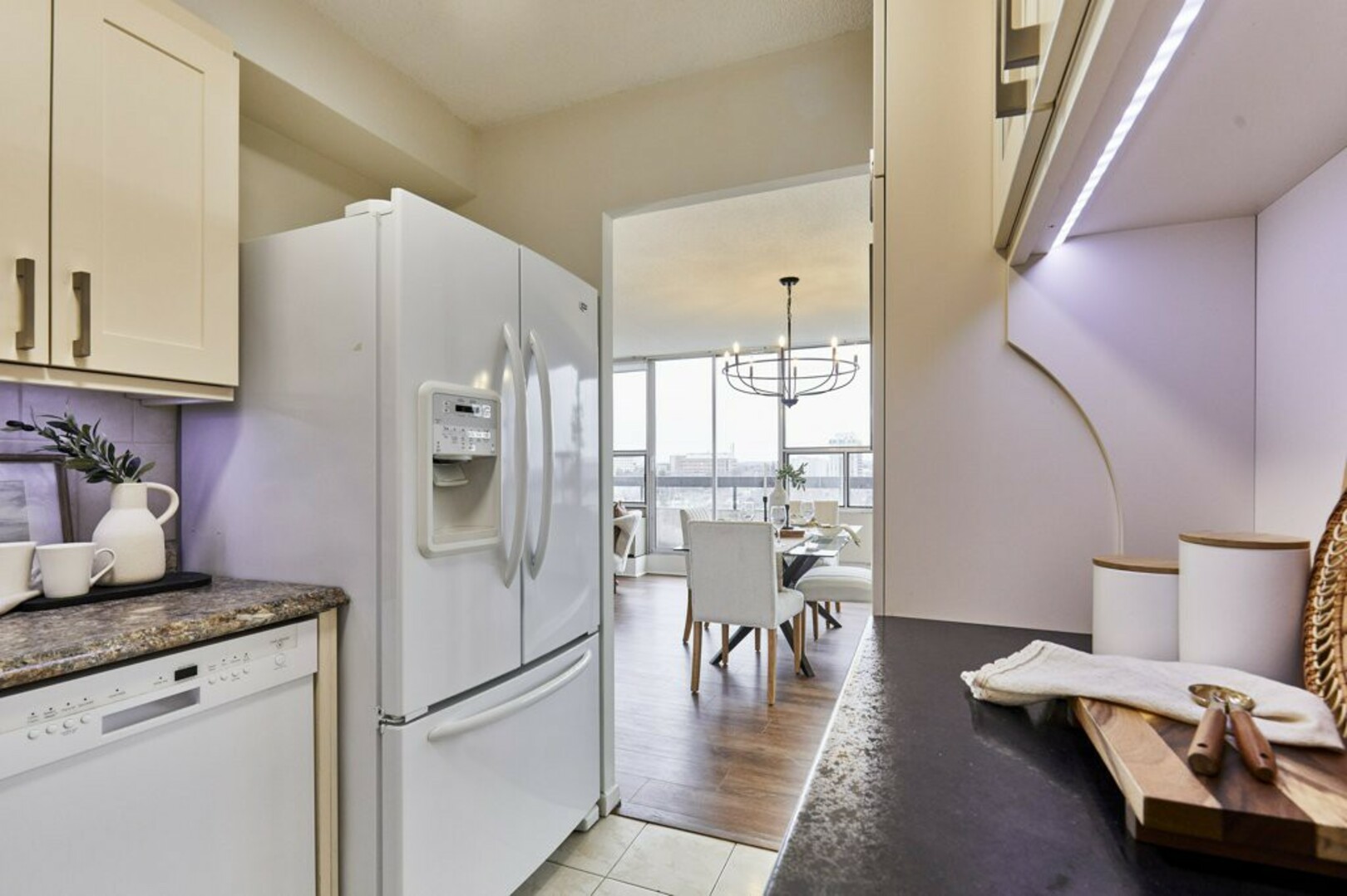 The Open Concept living and dining area is bathed in natural light from stunning floor-to-ceiling windows. Fresh laminate flooring and modern lighting add a contemporary touch. Step through the sliding doors onto your extra-large terrace with breathtaking views of the city. It acts as your backyard in the sky and stretches almost 40 feet by 6 feet wide, making it a great space for your outdoor furniture.