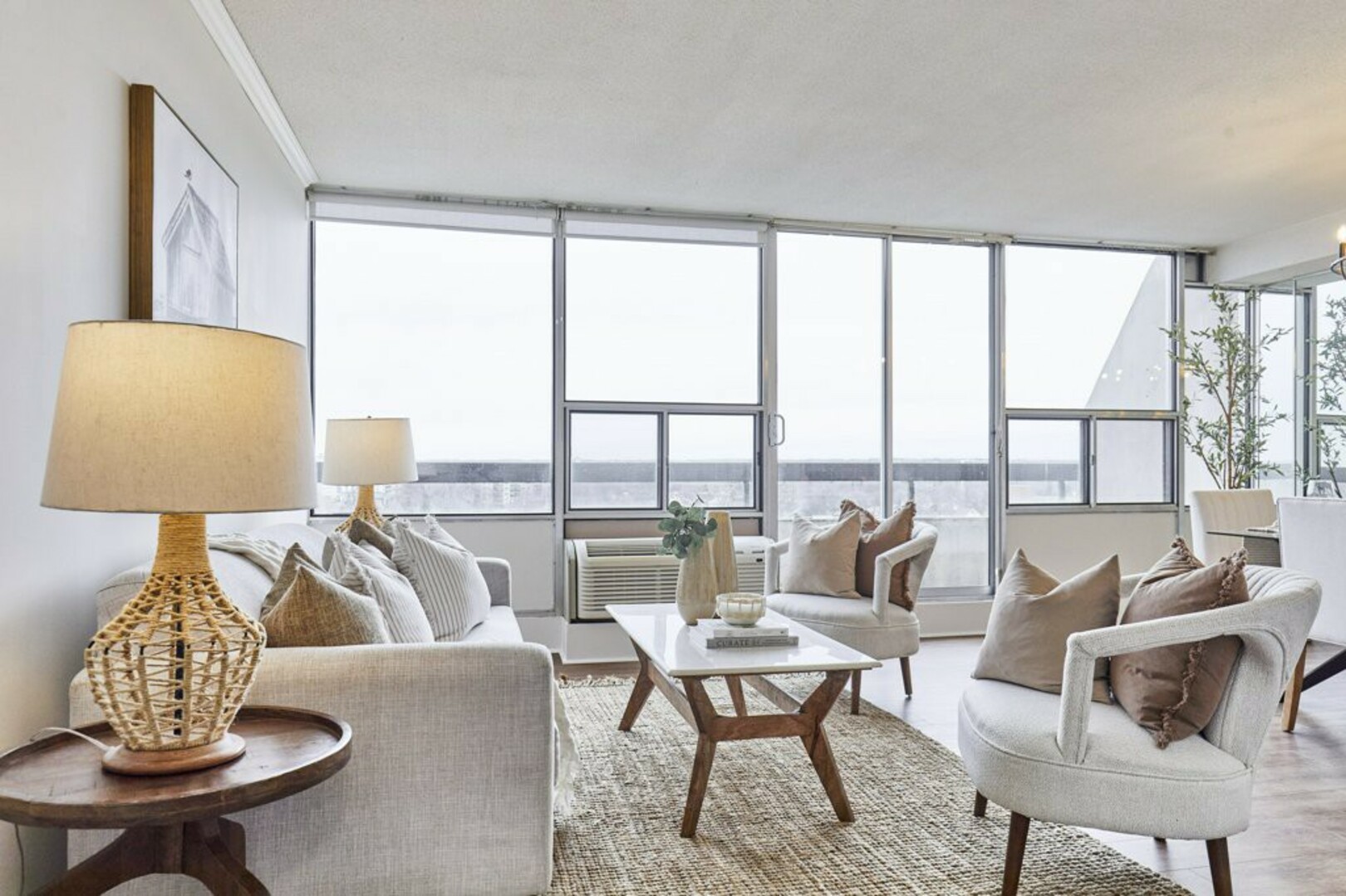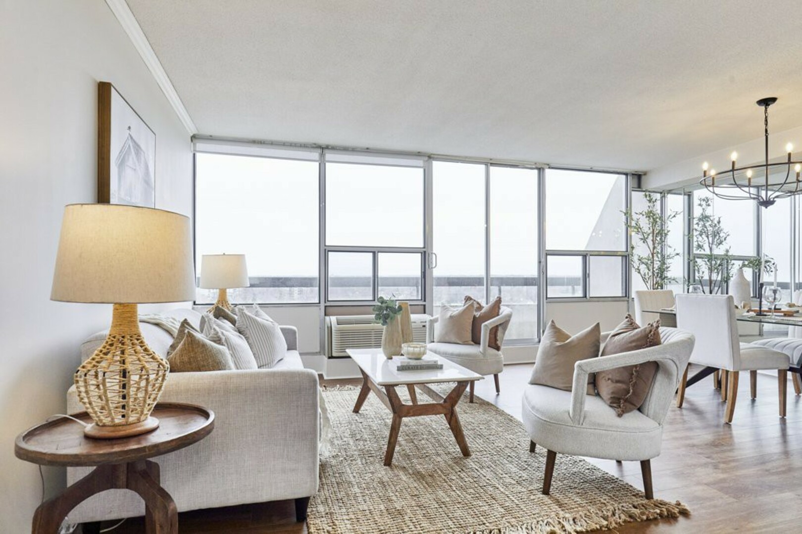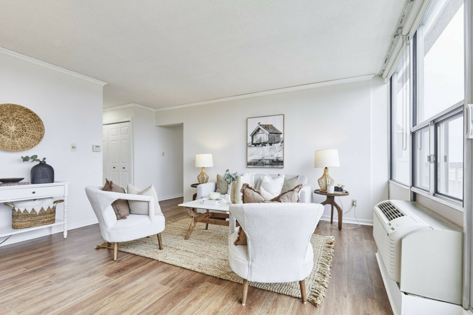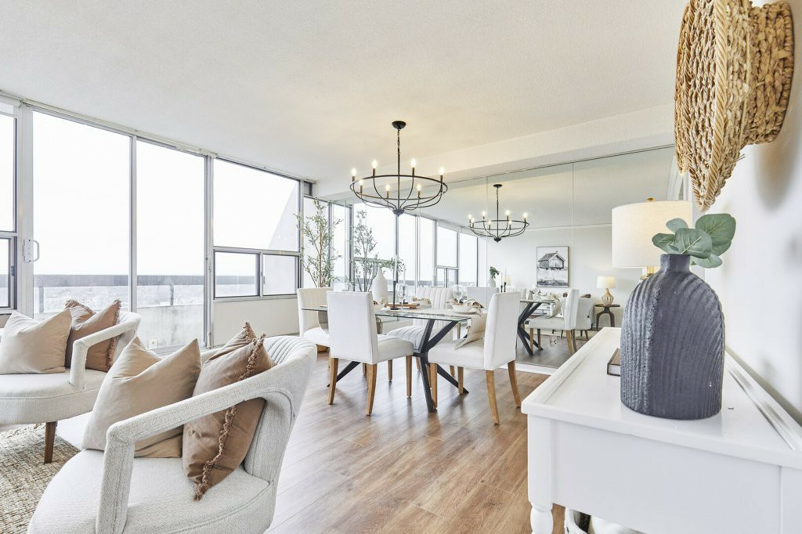 Step inside to a welcoming foyer with ceramic tile flooring and an oversized coat closet. The open-concept living and dining area boasts floor-to-ceiling windows, contemporary Luxury Vinyl flooring, and modern lighting. Sliding glass doors lead to an expansive, nearly 40-foot-long terrace; your "backyard in the sky," perfect for outdoor furniture, storage, and alfresco dining.