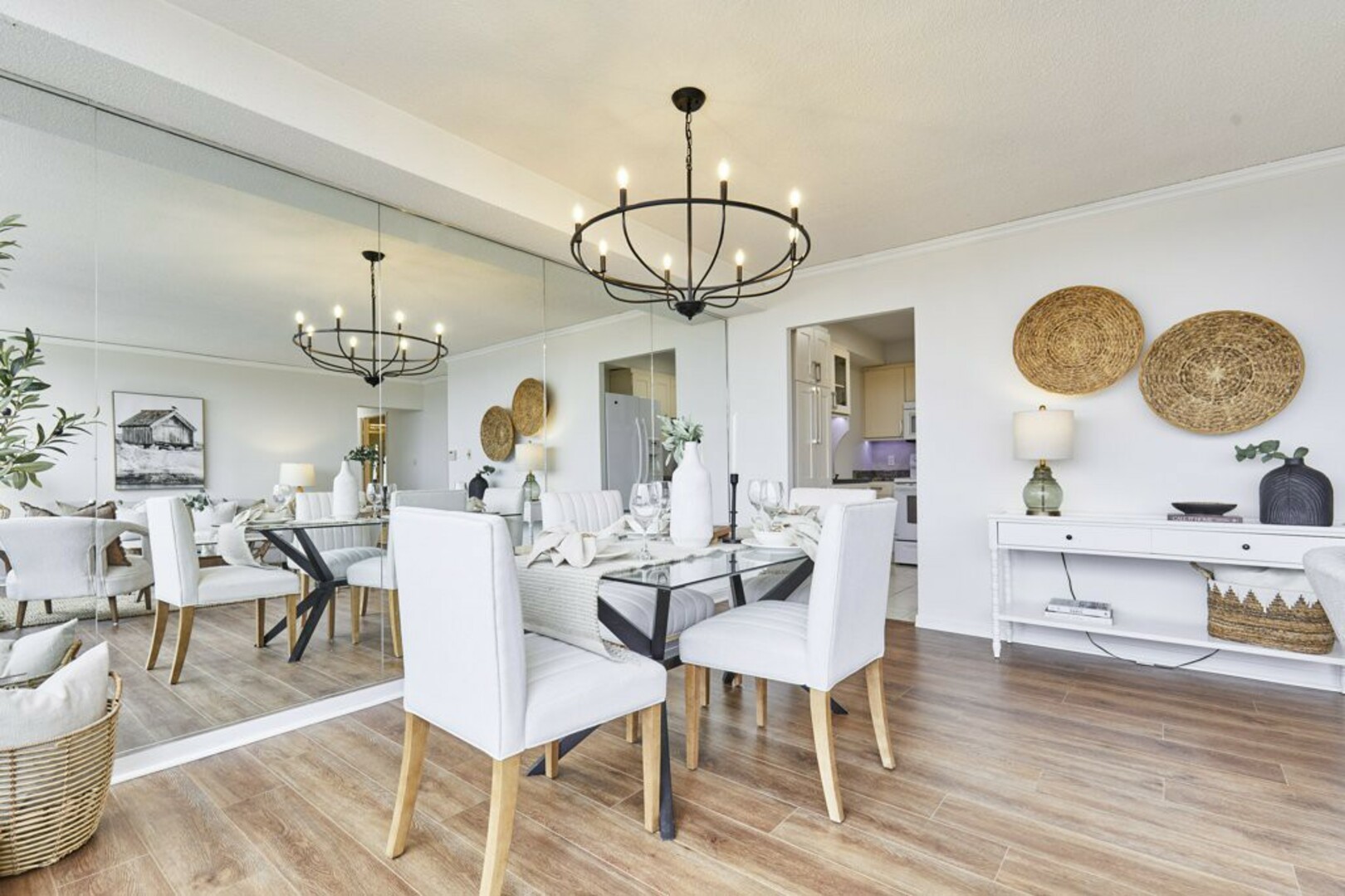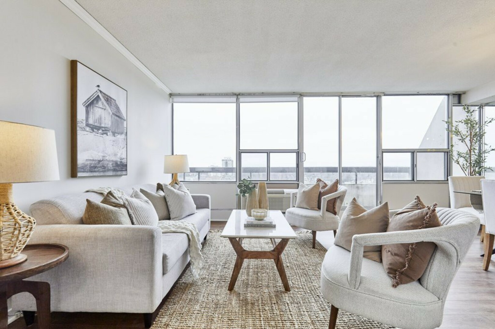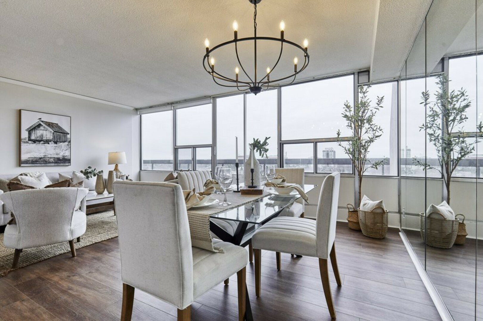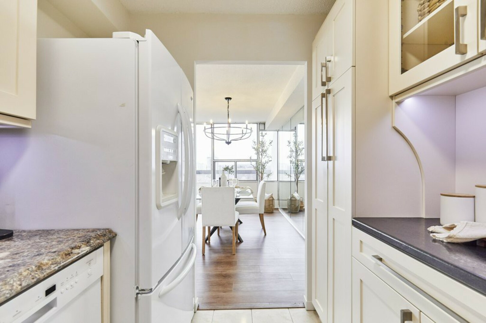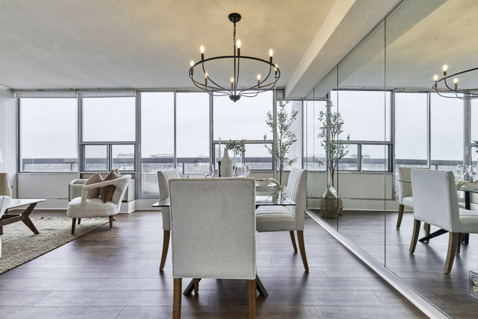 Step inside to a welcoming foyer with ceramic tile flooring and an oversized coat closet. The open-concept living and dining area boasts floor-to-ceiling windows, contemporary Luxury Vinyl flooring, and modern lighting. Sliding glass doors lead to an expansive, nearly 40-foot-long terrace; your "backyard in the sky," perfect for outdoor furniture, storage, and alfresco dining.