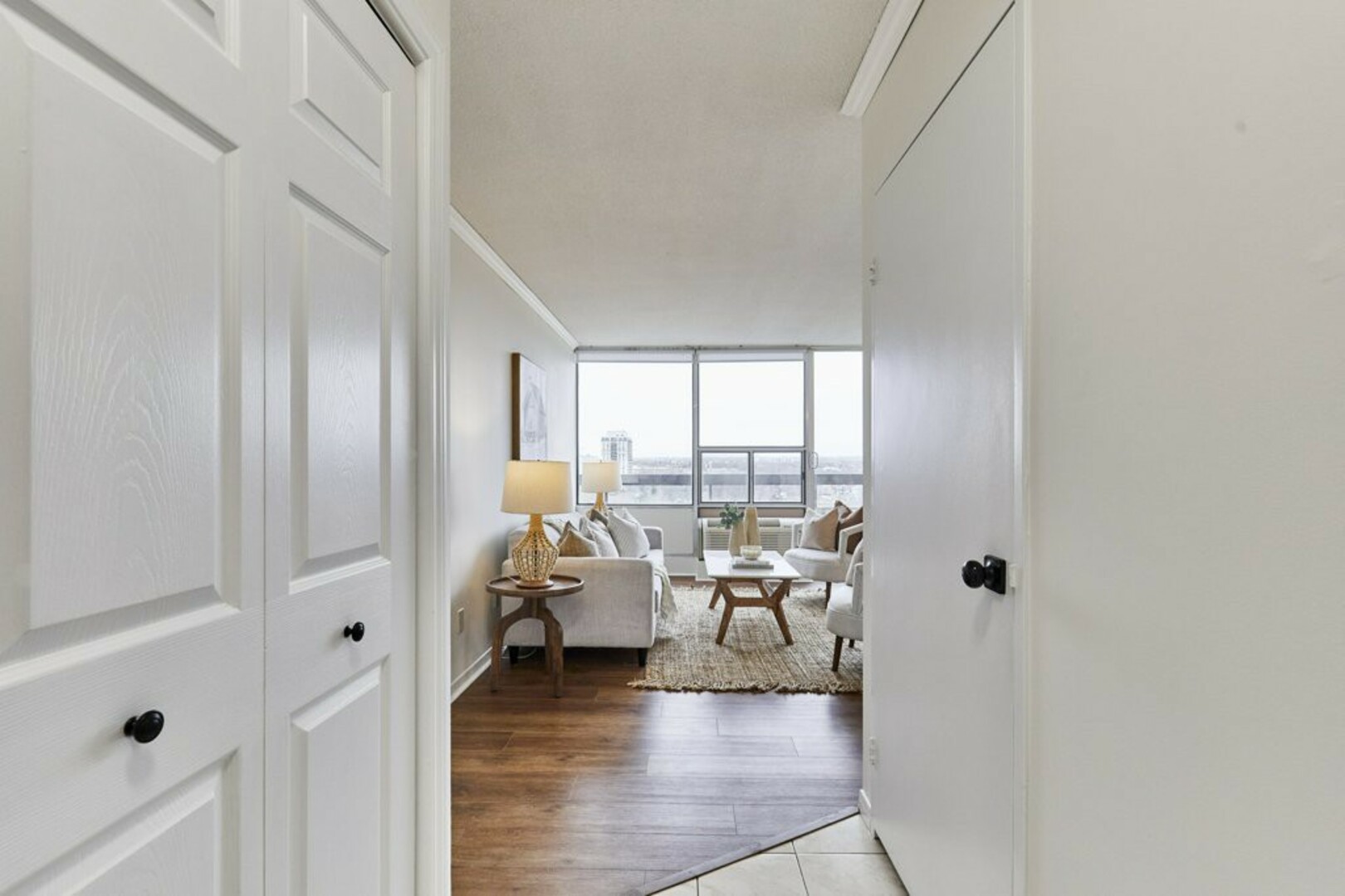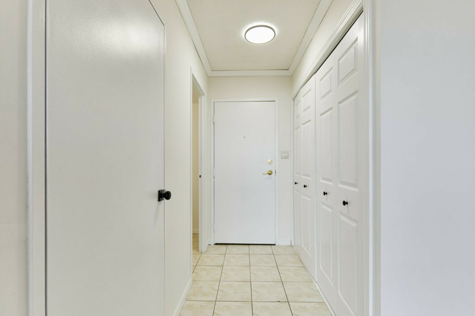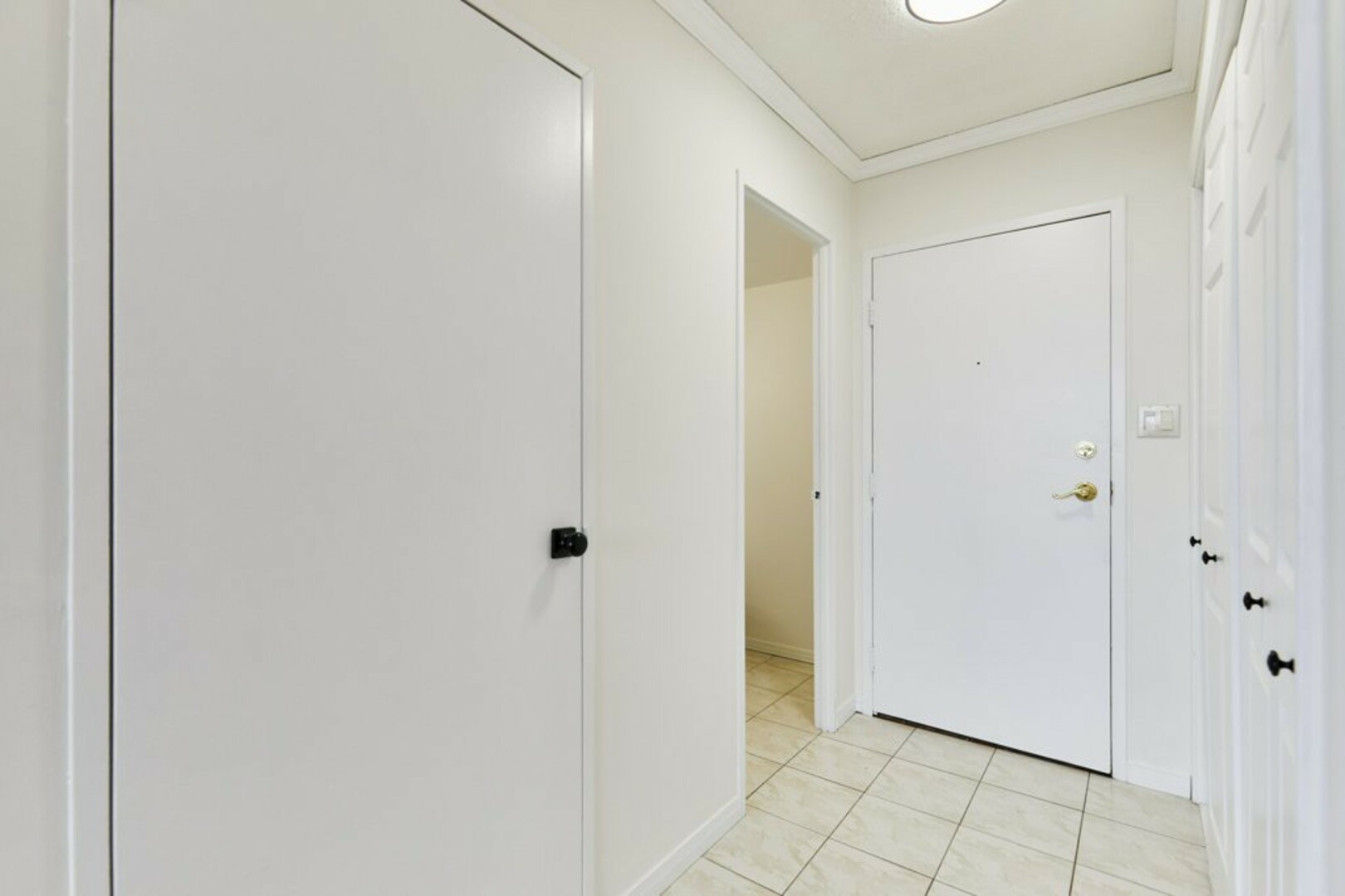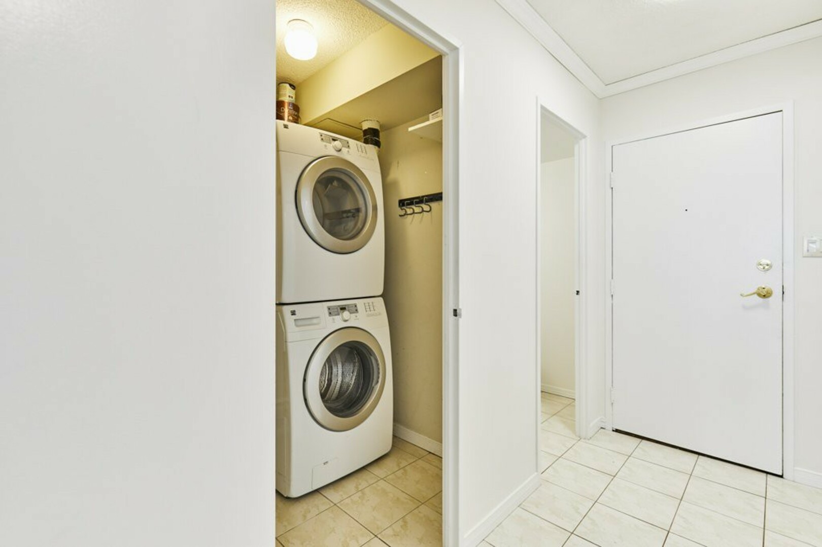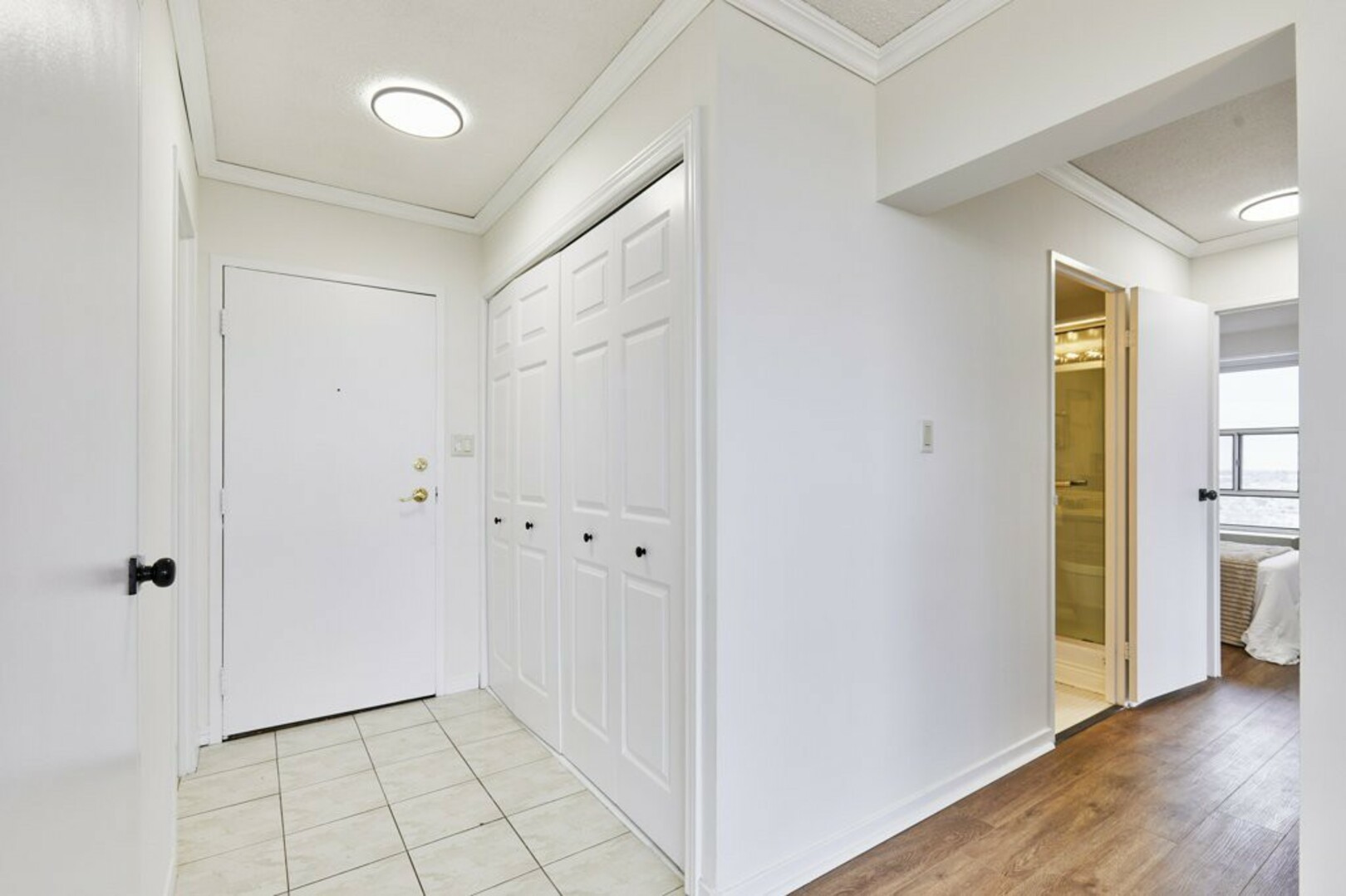 Step into your front foyer, where ceramic tile flooring meets an oversized coat closet, perfect for keeping everything organized. The updated lighting casts a warm, inviting glow, setting the tone for this stylish penthouse.