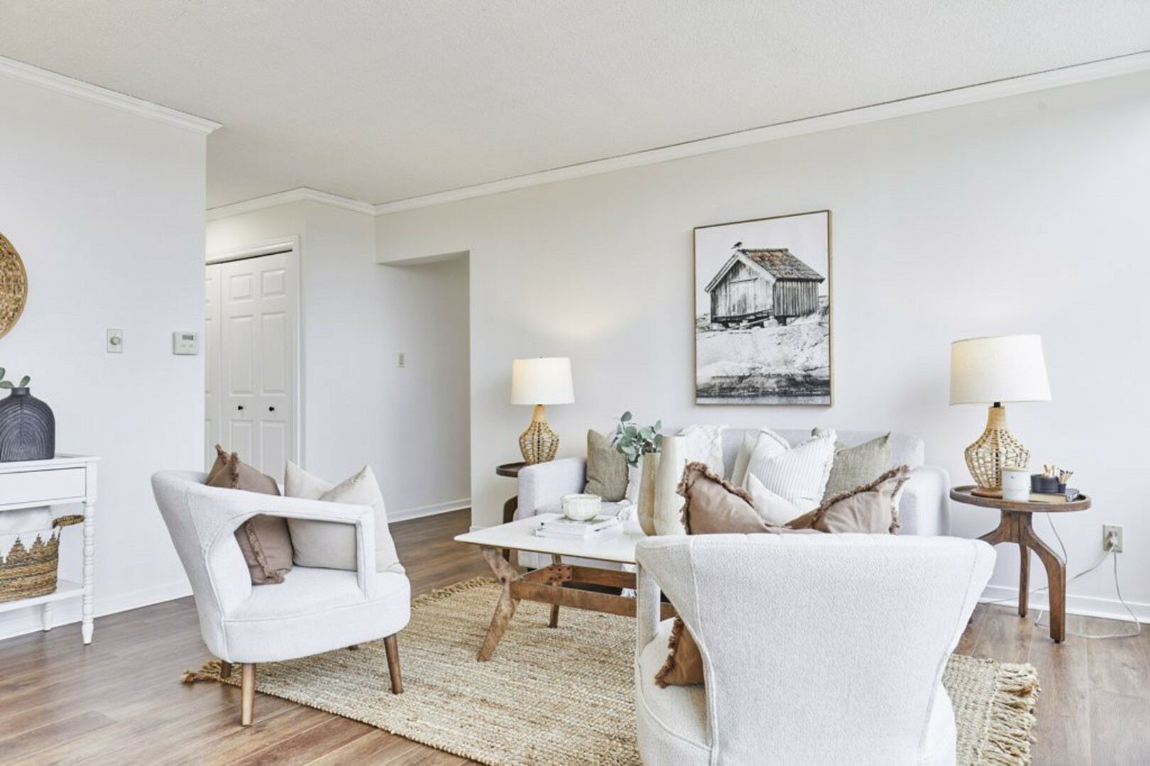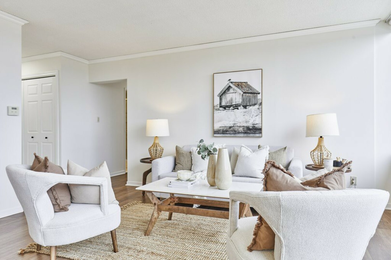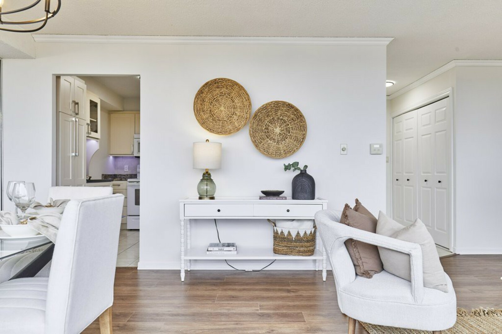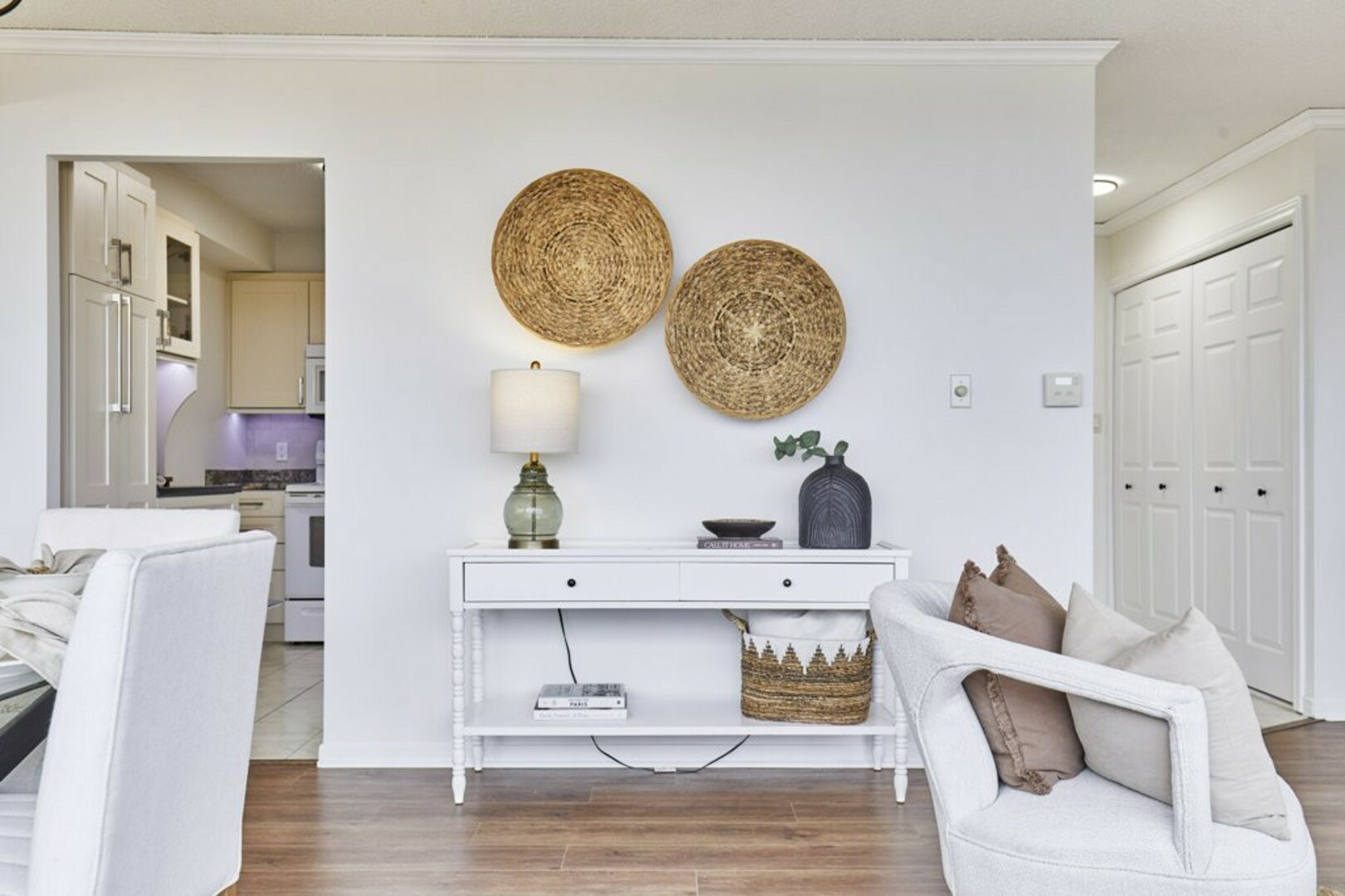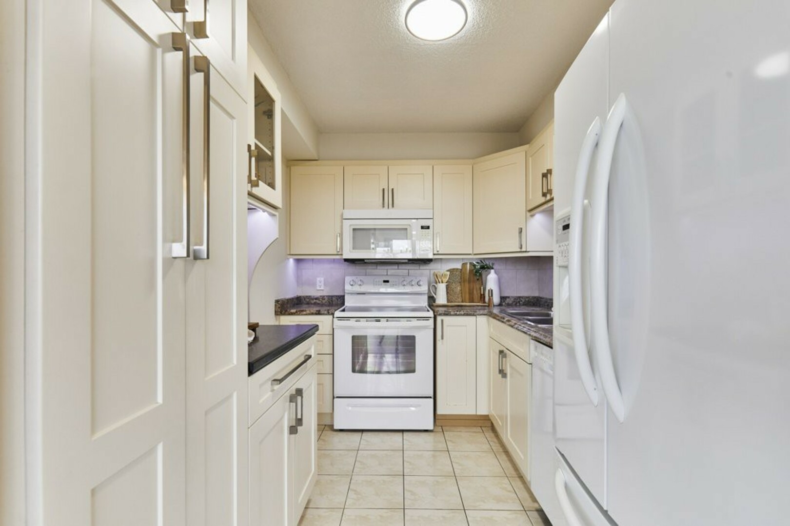 Step into your front foyer, where ceramic tile flooring meets an oversized coat closet, perfect for keeping everything organized. The updated lighting casts a warm, inviting glow, setting the tone for this stylish penthouse.