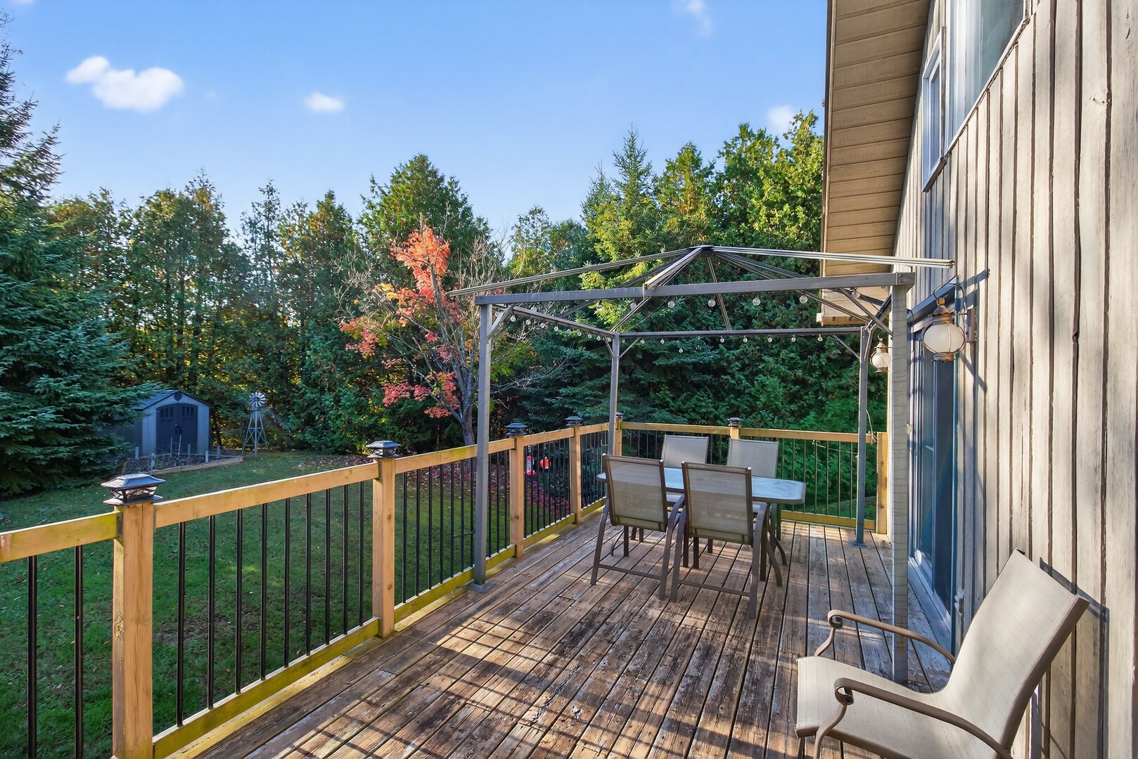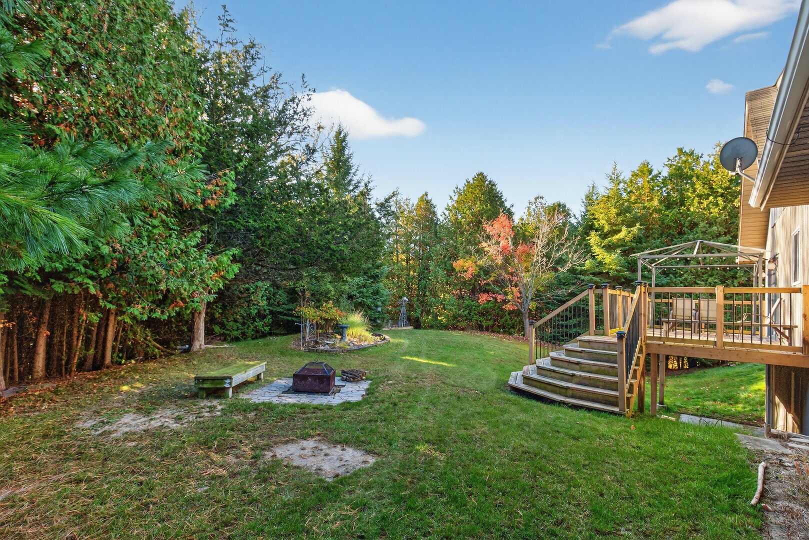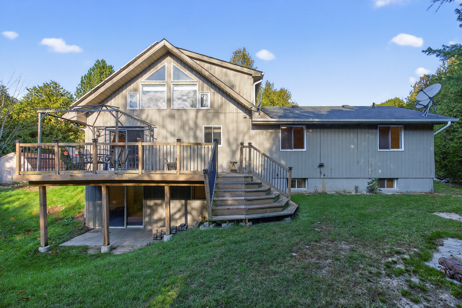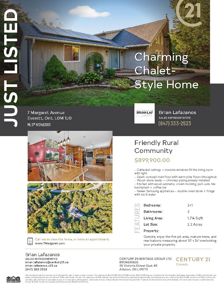 Welcome to 7 Margaret Avenue in Rural Tosorontio! Tucked away on a quiet street in a friendly rural community, this 2.3-acre (180'x420') property offers peace, privacy, and natural surroundings. Towering trees frame this charming chalet-style home, perched on a gentle hilltop with an eastern slope and open yard areas to enjoy the outdoors. Inside, you'll love the bright open-concept main floor featuring cathedral ceilings, large windows, and warm pine floors throughout the living and dining areas. The living room is wood-stove ready, with chimney piping already in place. The adjoining dining room includes a sliding walkout to the rear balcony perfect for morning coffee or evening sunsets. The kitchen features wood cabinetry with crown moulding, undercabinet lighting, pull-out organizers, a tile backsplash, and a convenient coffee bar nook, plus newer Samsung appliances including a double-oven stove and a fridge with ice and water. Two main-floor bedrooms offer comfortable space and closets, while the main bath includes a double-sink vanity, corner soaker tub, and separate shower. Upstairs, a versatile loft bedroom overlooks the living area and includes a 2-piece ensuite and walk-in closet. ~1714 sqft. The walk-out basement adds valuable living space with a large rec room, second kitchen setup, fourth bedroom, 4-piece bath, and laundry area with two sets of washer/dryers ideal for extended family or guests. Practical features include a geothermal heating system (2013) for efficient comfort and solar panels generating approximately ~$2,700 per year in income fully transferrable for another 10 years. Outside, enjoy the fire-pit area, mature trees, and rear balcony measuring about 10ft x 24ft, overlooking your private property. A rare opportunity to enjoy rural living with sustainable energy and timeless charm all within a welcoming community setting.