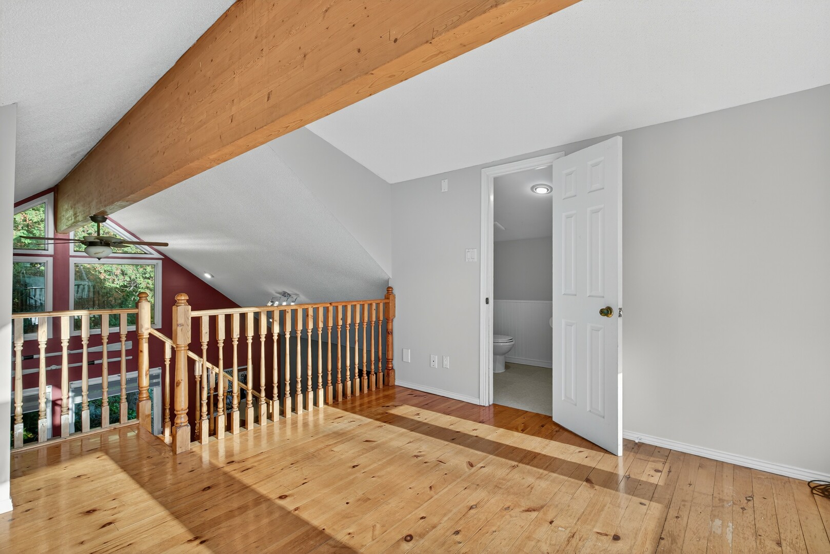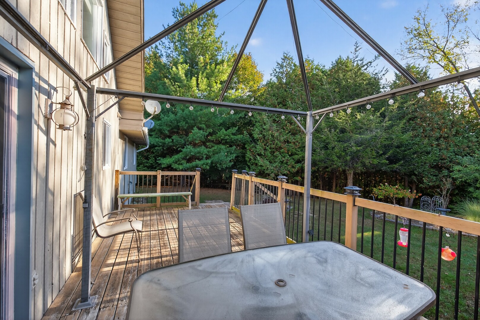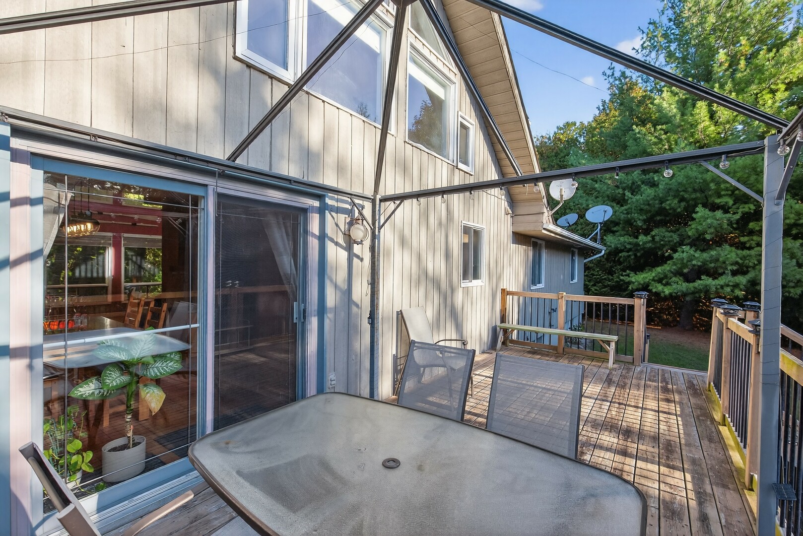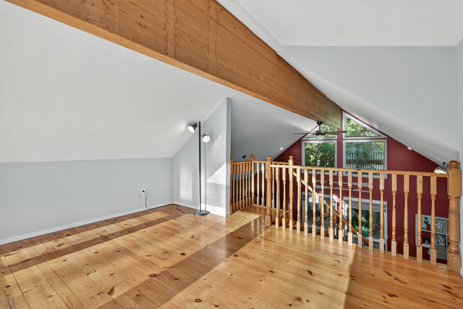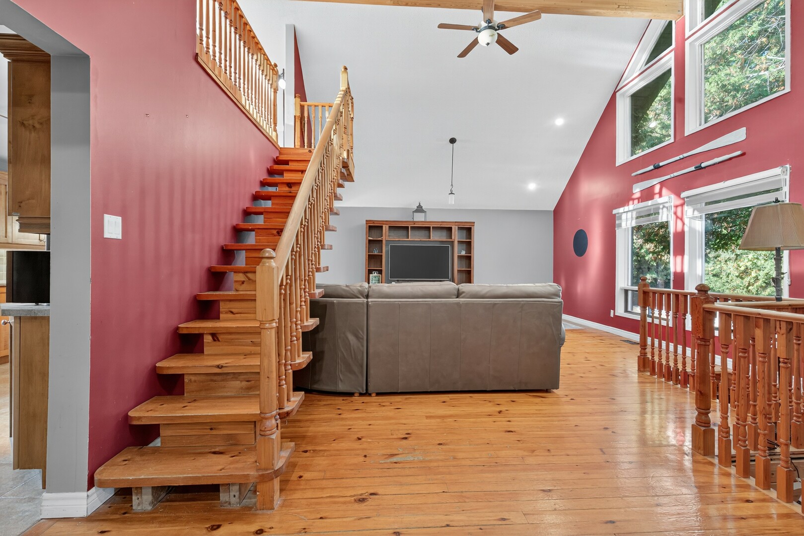 Welcome to 7 Margaret Avenue in Rural Tosorontio! Tucked away on a quiet street in a friendly rural community, this 2.3-acre (180'x420') property offers peace, privacy, and natural surroundings. Towering trees frame this charming chalet-style home, perched on a gentle hilltop with an eastern slope and open yard areas to enjoy the outdoors. Inside, you'll love the bright open-concept main floor featuring cathedral ceilings, large windows, and warm pine floors throughout the living and dining areas. The living room is wood-stove ready, with chimney piping already in place. The adjoining dining room includes a sliding walkout to the rear balcony perfect for morning coffee or evening sunsets. The kitchen features wood cabinetry with crown moulding, undercabinet lighting, pull-out organizers, a tile backsplash, and a convenient coffee bar nook, plus newer Samsung appliances including a double-oven stove and a fridge with ice and water. Two main-floor bedrooms offer comfortable space and closets, while the main bath includes a double-sink vanity, corner soaker tub, and separate shower. Upstairs, a versatile loft bedroom overlooks the living area and includes a 2-piece ensuite and walk-in closet. ~1714 sqft. The walk-out basement adds valuable living space with a large rec room, second kitchen setup, fourth bedroom, 4-piece bath, and laundry area with two sets of washer/dryers ideal for extended family or guests. Practical features include a geothermal heating system (2013) for efficient comfort and solar panels generating approximately ~$2,700 per year in income fully transferrable for another 10 years. Outside, enjoy the fire-pit area, mature trees, and rear balcony measuring about 10ft x 24ft, overlooking your private property. A rare opportunity to enjoy rural living with sustainable energy and timeless charm all within a welcoming community setting.