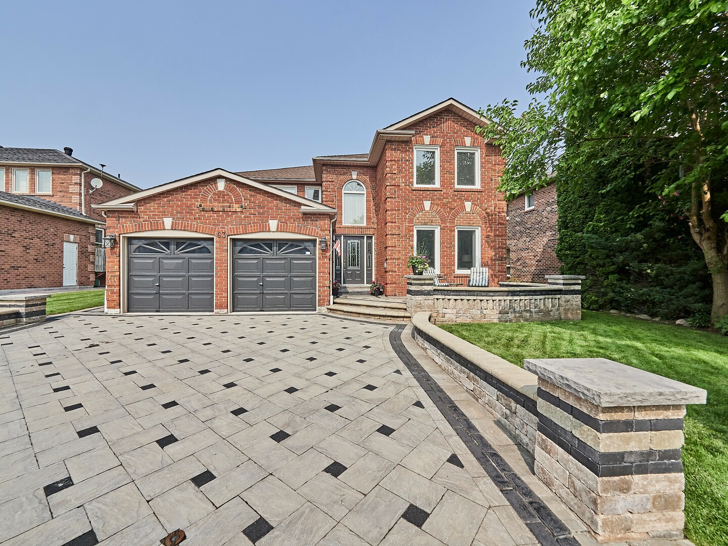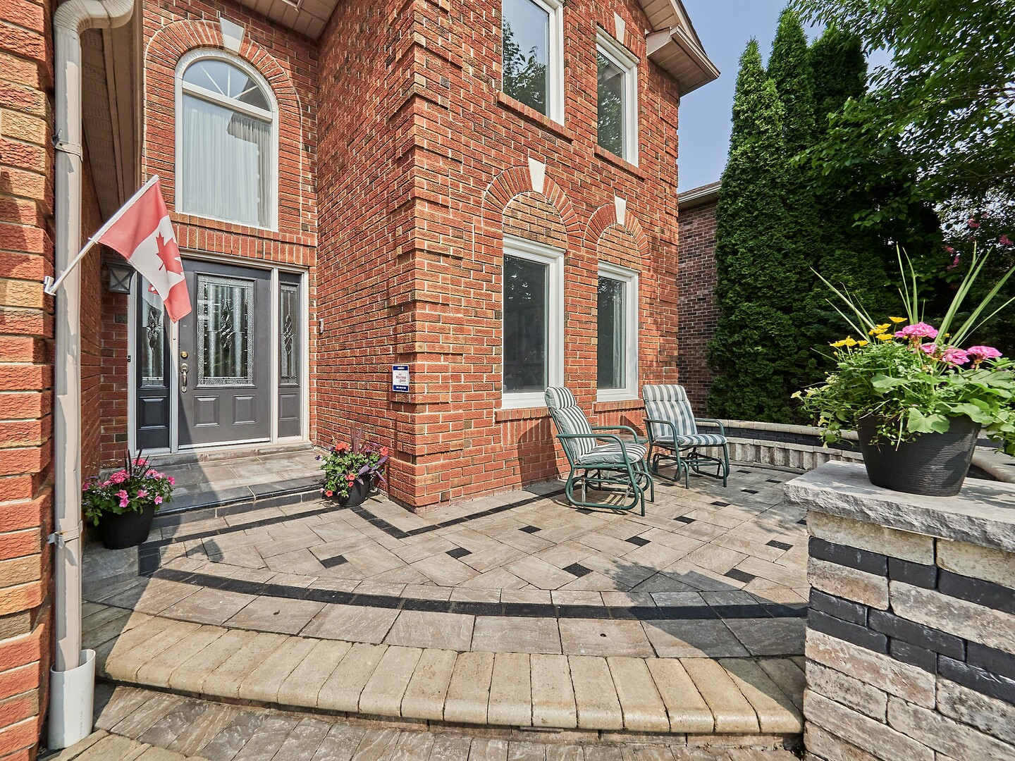 An immaculately maintained property showcasing interlocking stone walkways on the north and south sides to a beautiful backyard retreat - stone landscaping is also extensively used in the front yard, enhancing both the curb appeal and stately presence of this home. The geometric patterned interlocking driveway, its surrounding accent border, and its accompanying walls are finished with an aesthetically pleasing colour contrast of light and dark stone - all which is carried over to a spacious west-facing front terrace overlooking front yard greenery and mature trees.