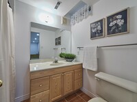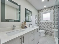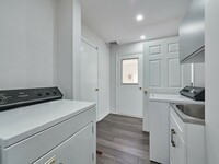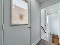 The main level additionally features a powder room with upgraded tiles and a vanity with quartz counter; a private den; and a laundry room with washer and dryer, a stainless steel sink, as well as access to both the garage and to the lower level - and curving to the upper level is a staircase with updated hardwood treads and a railing with wrought iron pickets.
