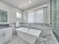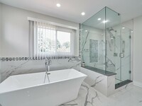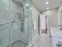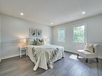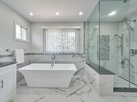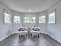 The impeccable master suite showcases a lovely sitting area by its turret wall - and daily views of greenery visible through its windows. Also featuring a double door entry and a large walk-in closet - its ensuite washroom showcases a vanity with quartz counter; a freestanding tub; a glass shower with a quartz-topped shower seat; as well as upgraded tiled finishes throughout, including basketweave accents.