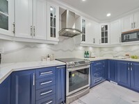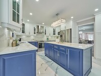 Fully open to the family room - the kitchen showcases a chandelier above the island; upgraded polished floor tiles; quartz counters and back splashes; a stainless steel double under mount sink, oven, range hood, and French door fridge; and cabinetry that features valance lighting, crown molding, glass-panelled accent doors, and storage that includes a separate wall pantry.