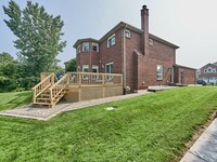 The sliding door walk-out in the breakfast area opens onto a large entertaining deck overlooking a backyard lined with mature trees and a meticulously maintained lawn.