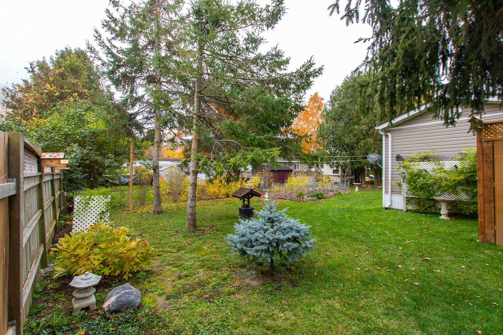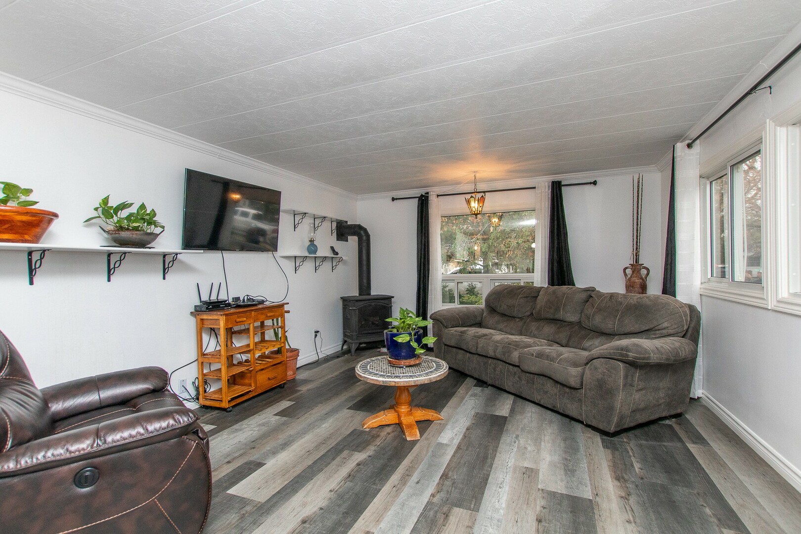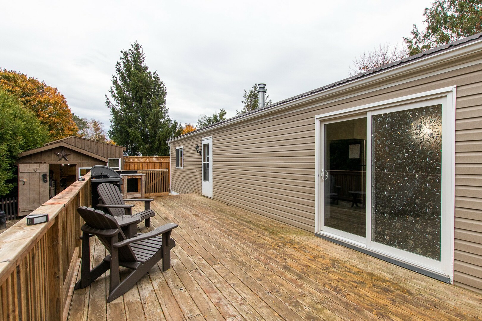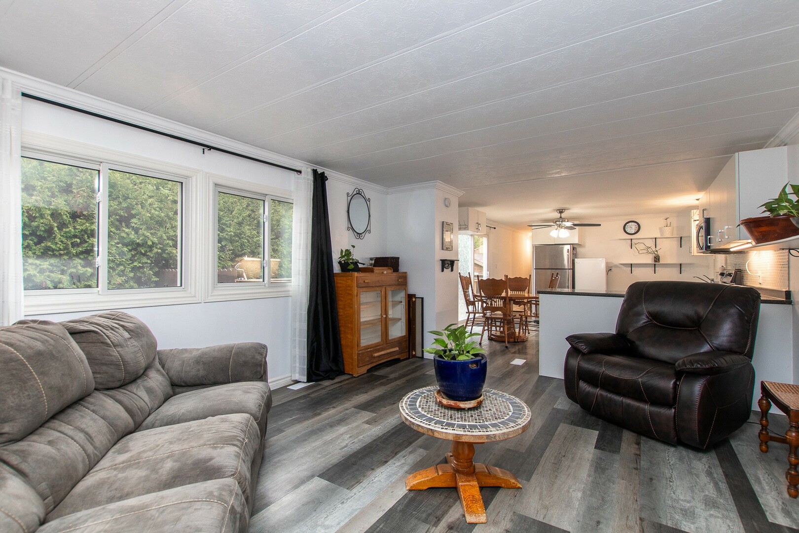 This fresh two-bedroom one bath open concept living bungalow mobile home is situated on a large lot with gardens, trees, a large deck, private patio, large double work shed with power and covered parking for your lawn tractor. There is a fenced in area for the dog to run.