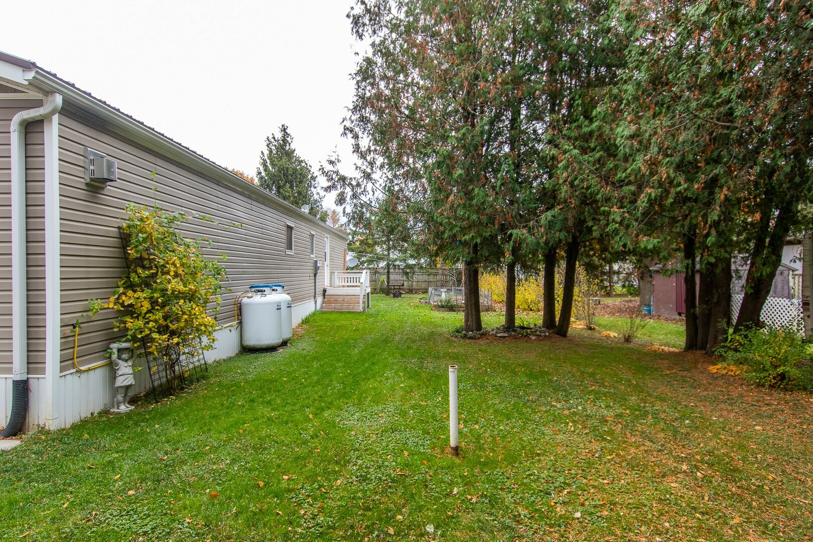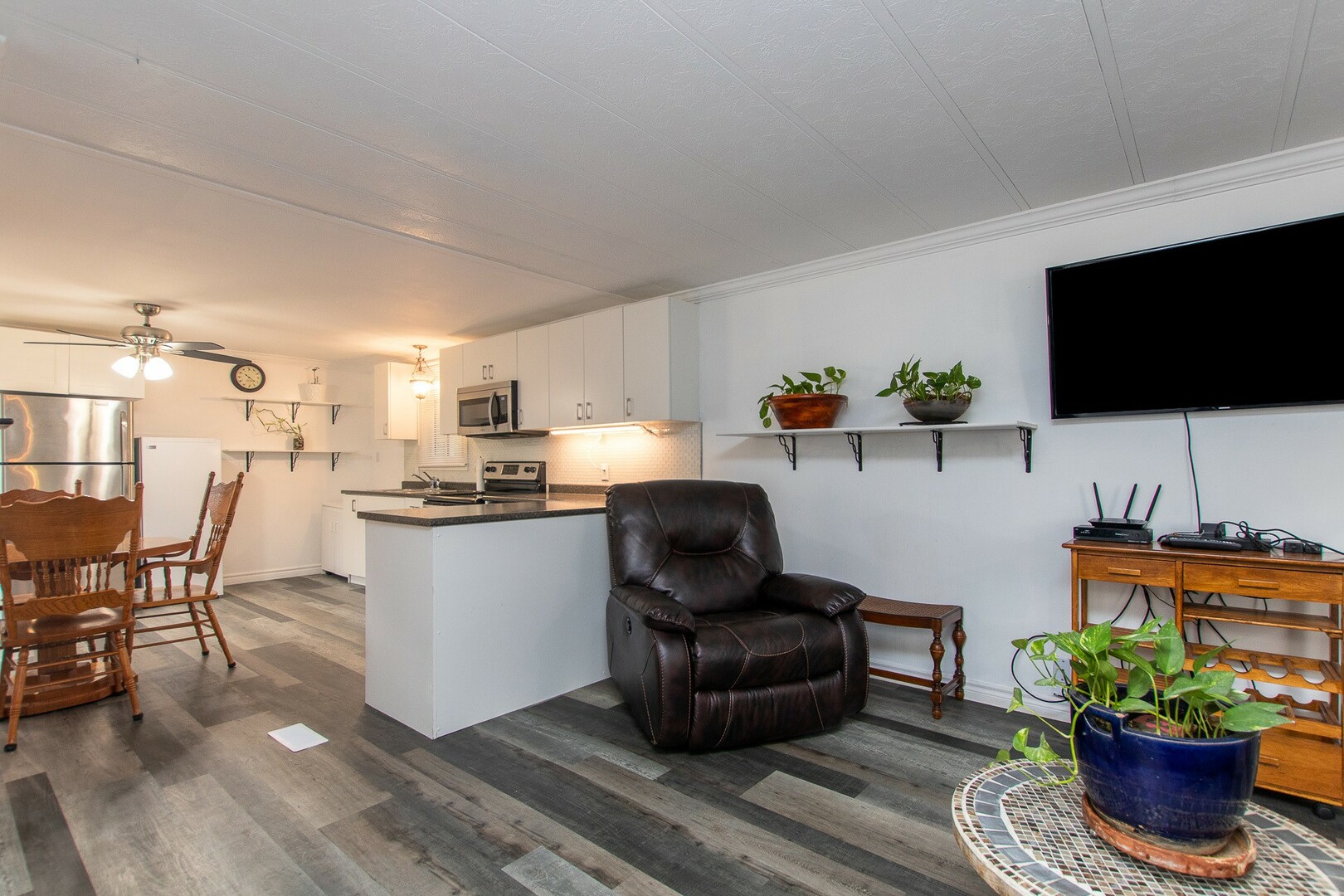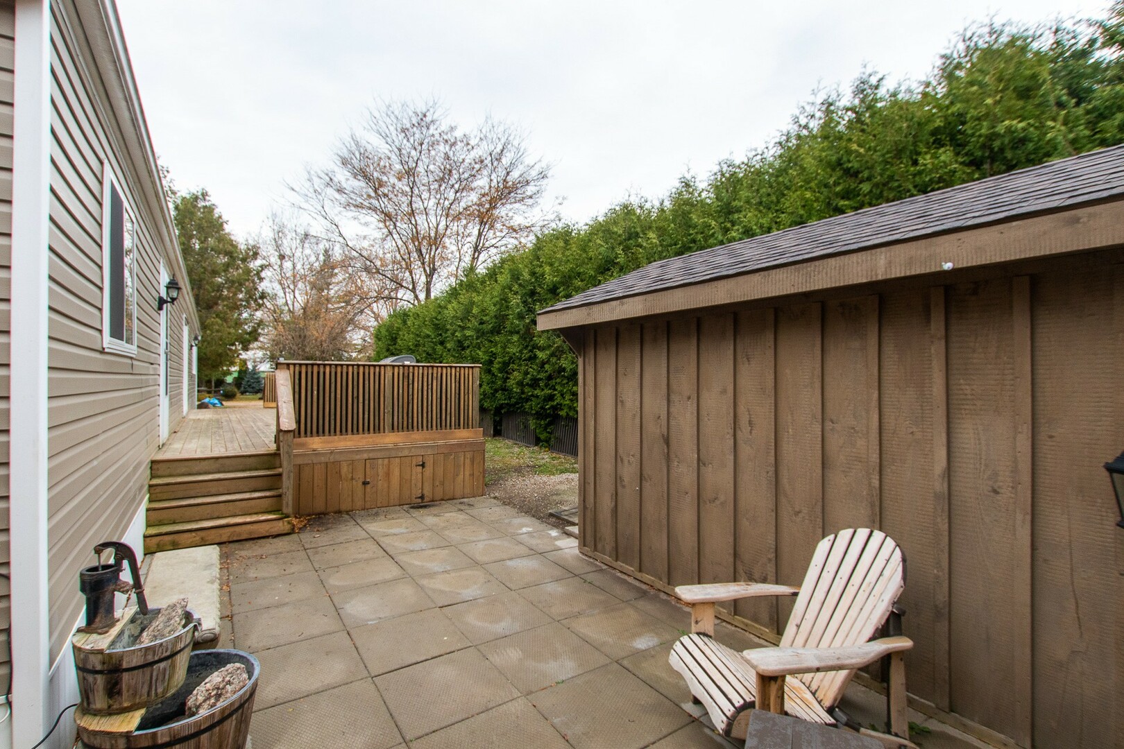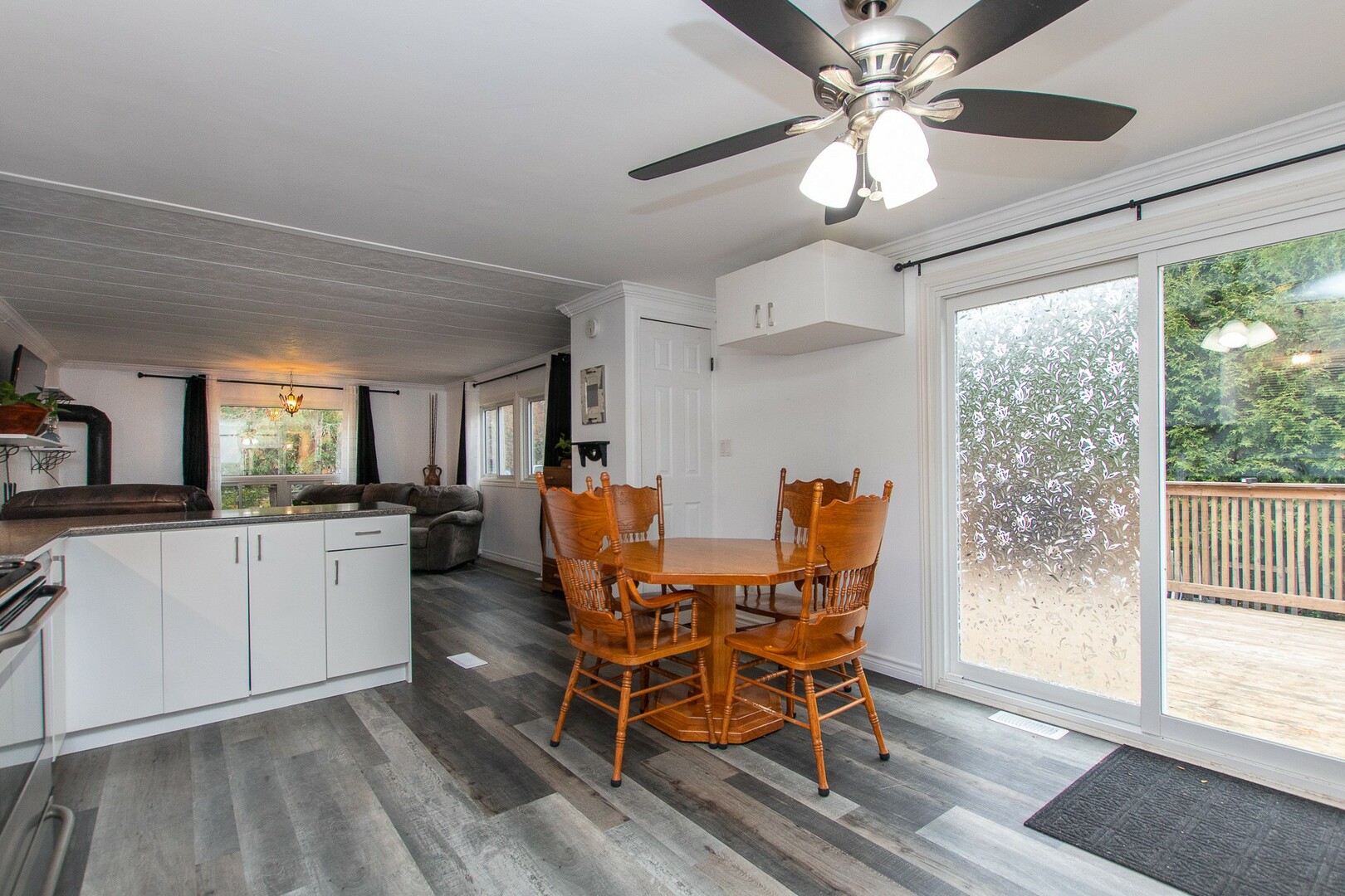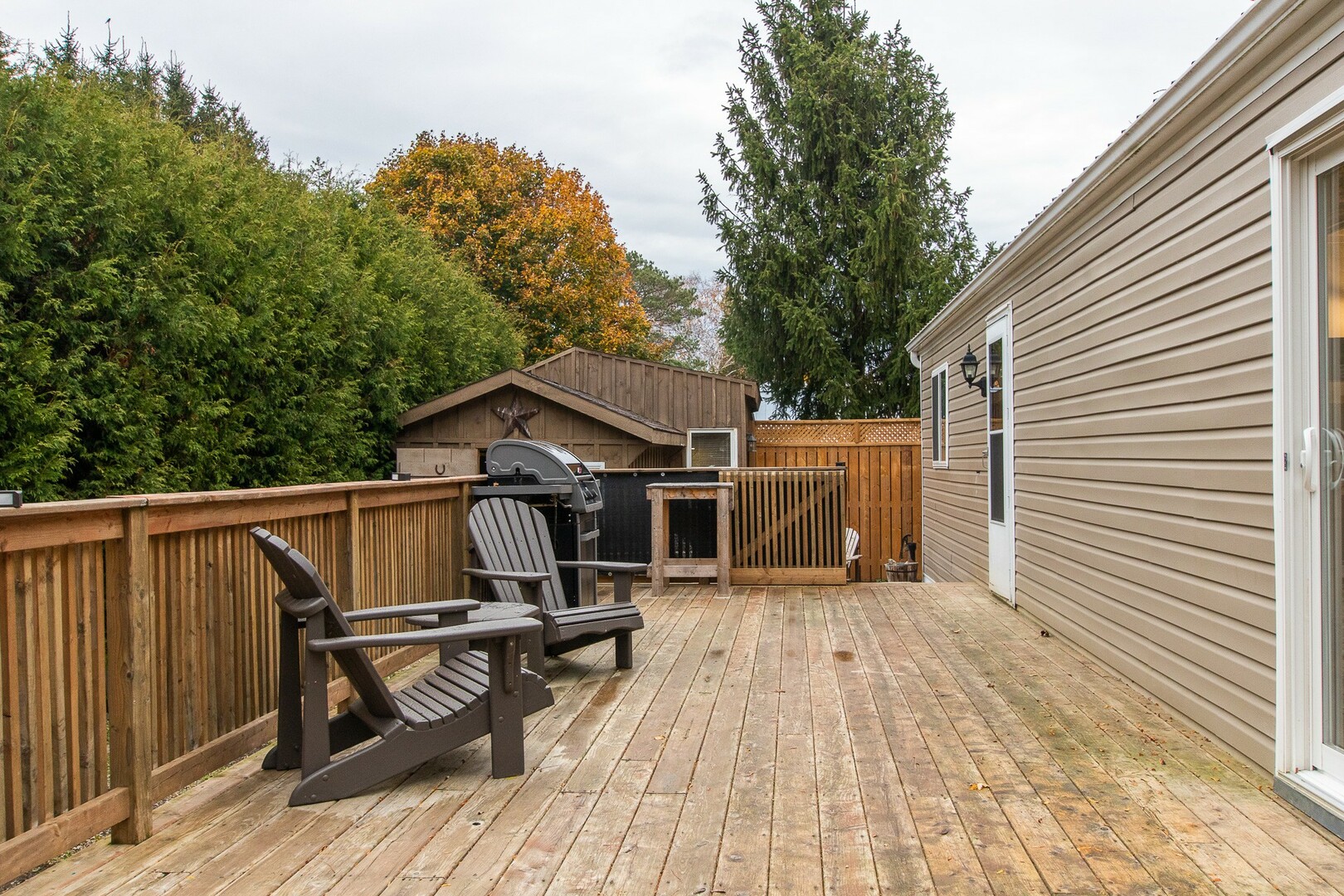 This fresh two-bedroom one bath open concept living bungalow mobile home is situated on a large lot with gardens, trees, a large deck, private patio, large double work shed with power and covered parking for your lawn tractor. There is a fenced in area for the dog to run.
