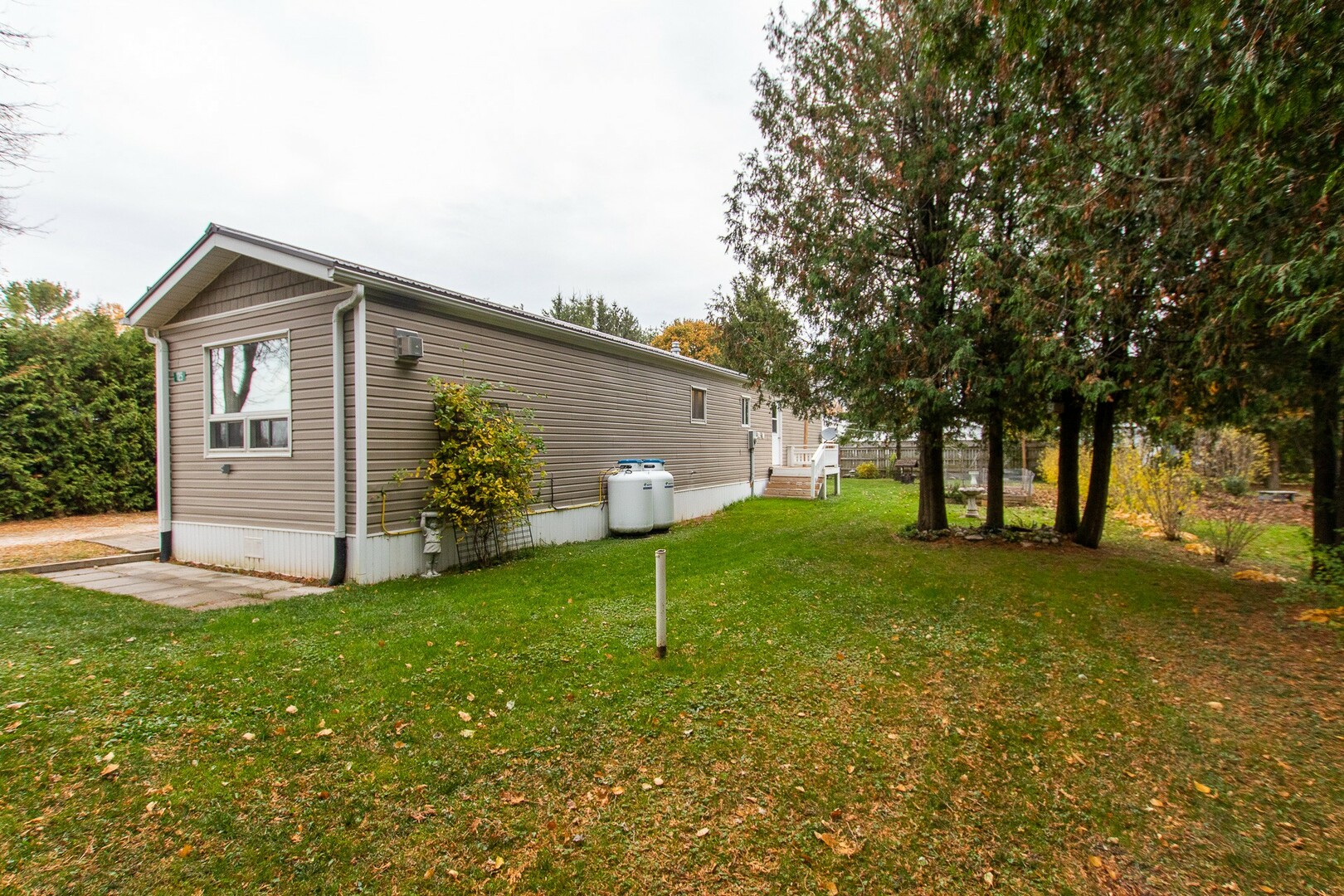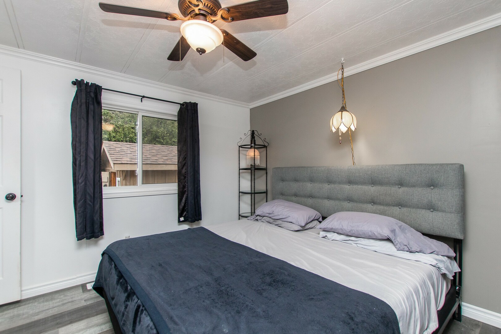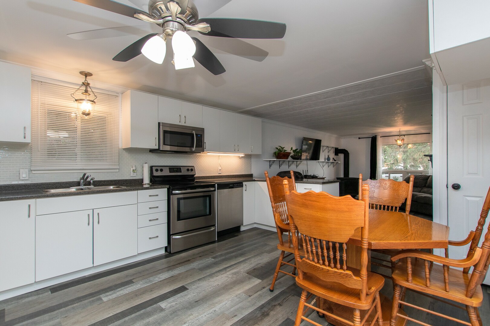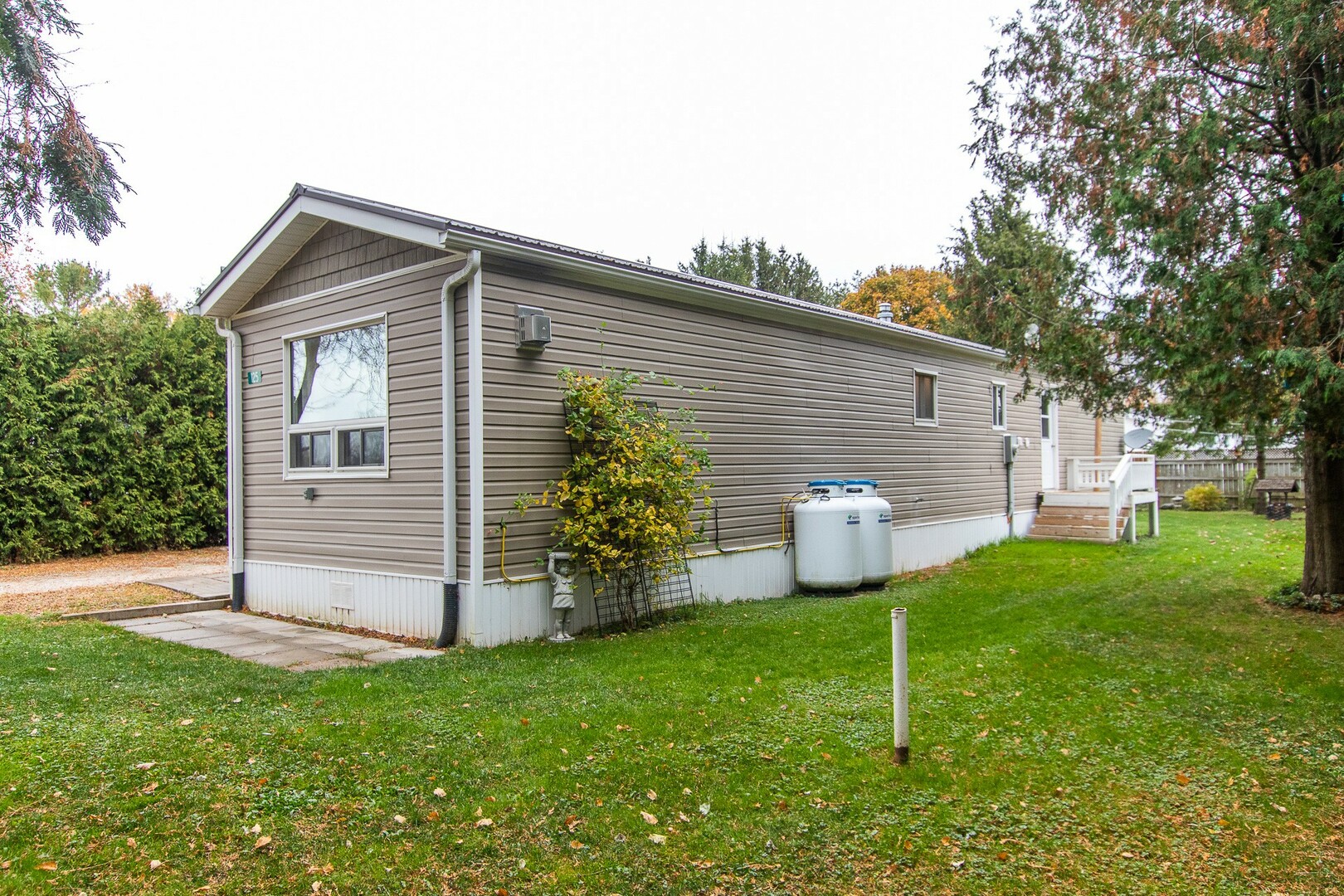 This fresh two-bedroom one bath open concept living bungalow mobile home is situated on a large lot with gardens, trees, a large deck, private patio, large double work shed with power and covered parking for your lawn tractor. There is a fenced in area for the dog to run.