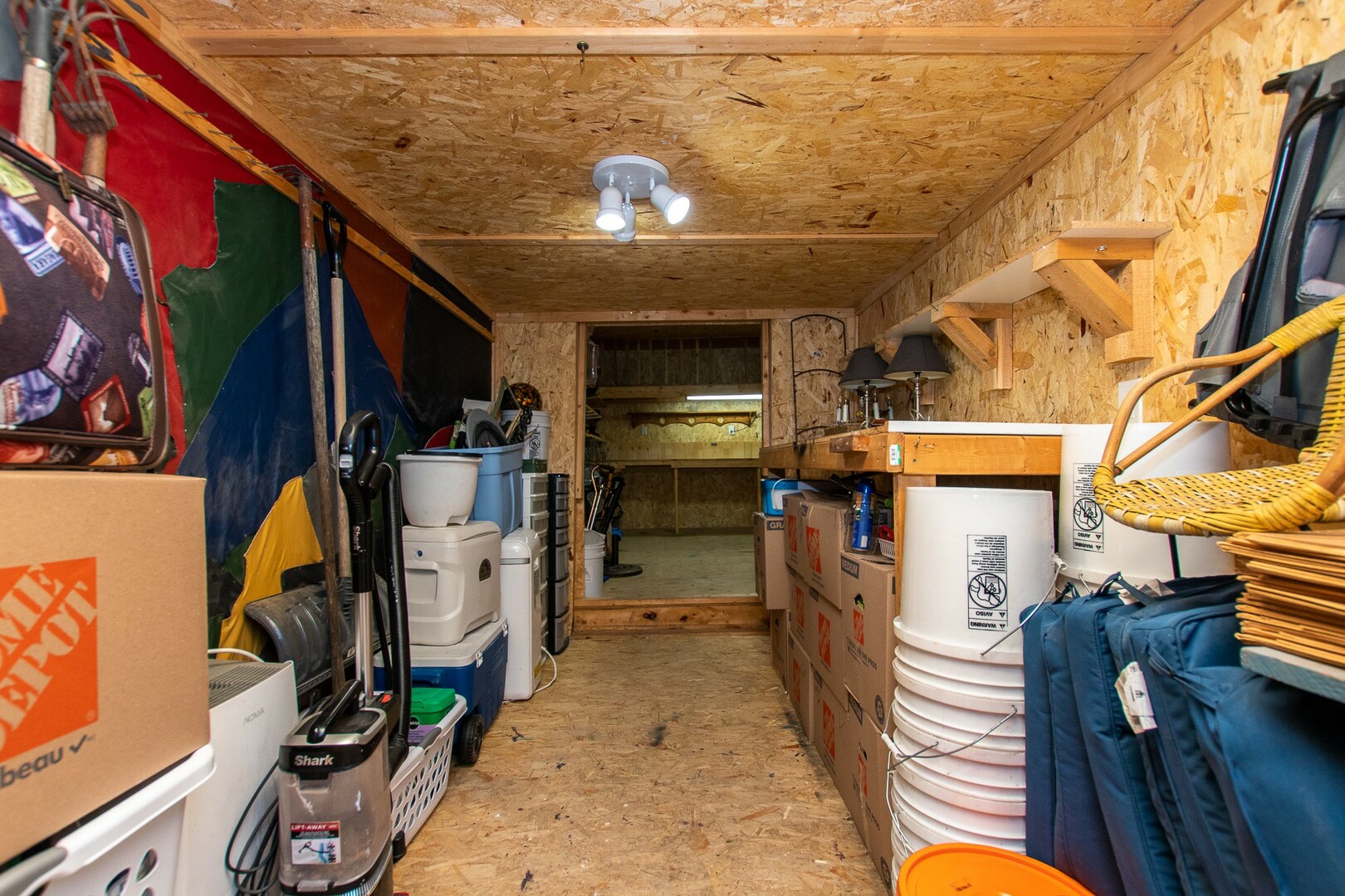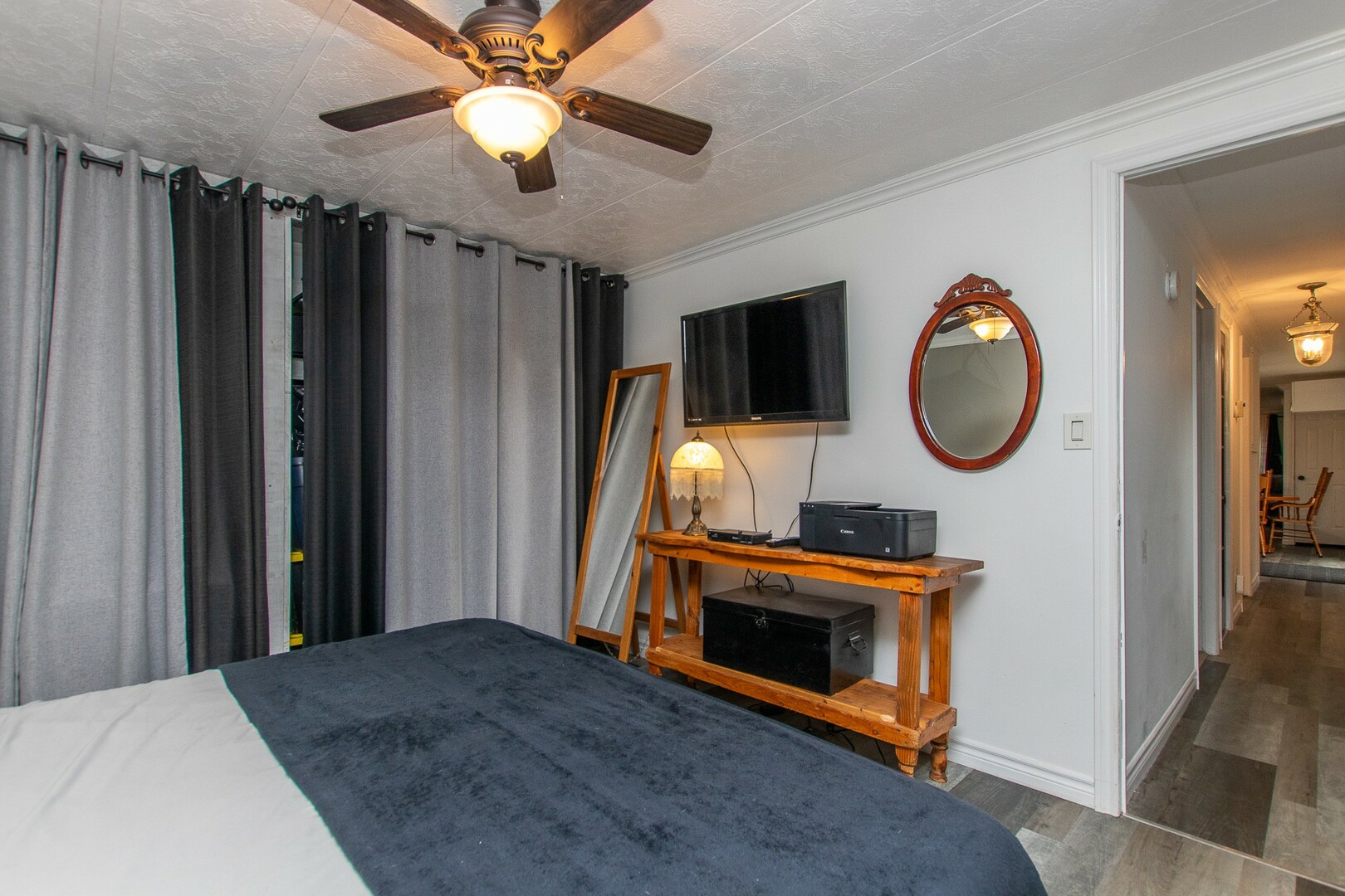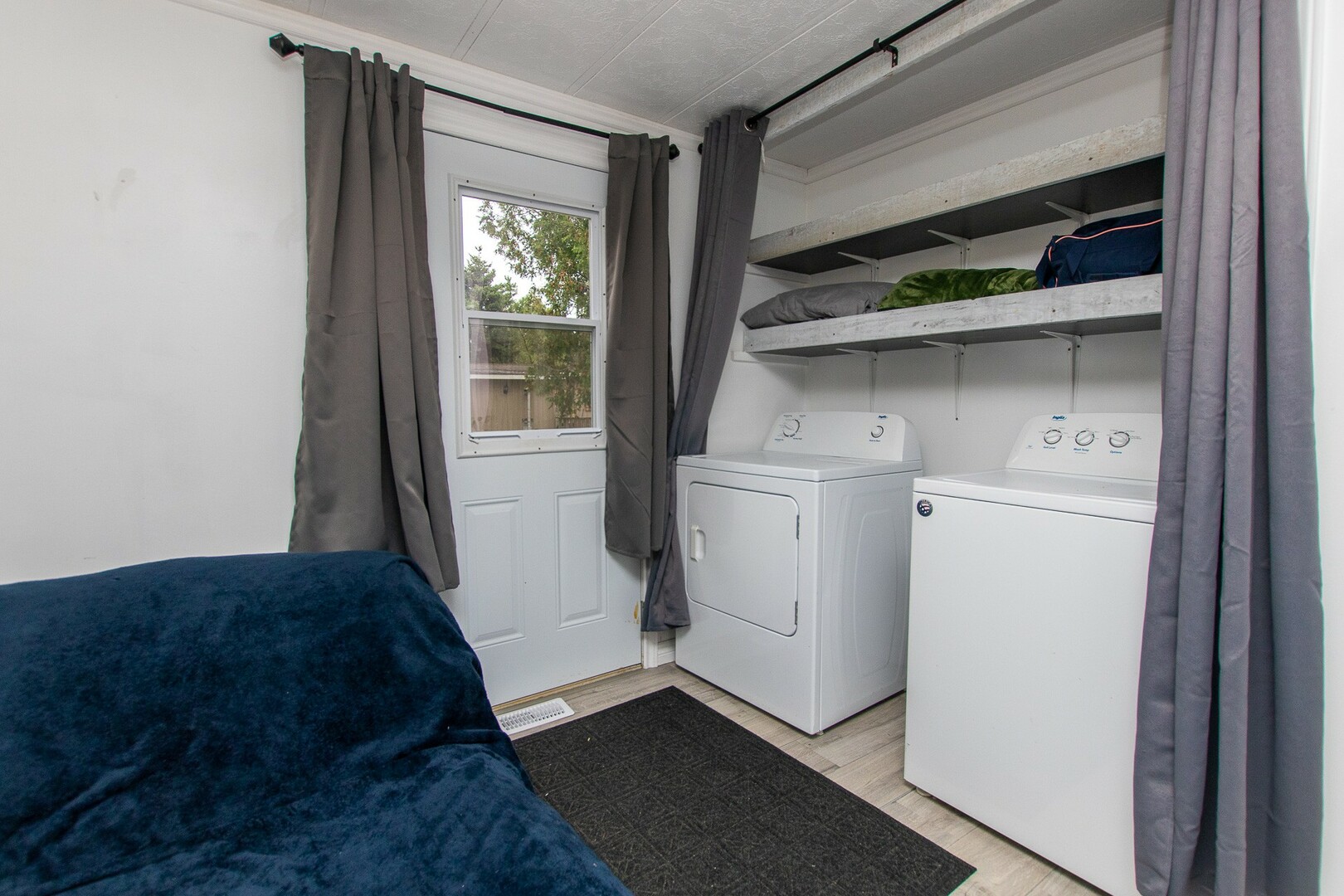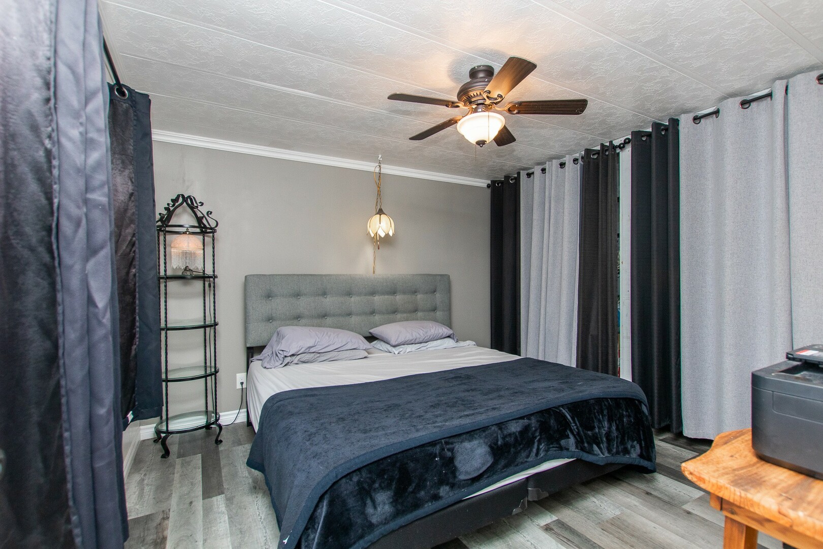 This fresh two-bedroom one bath open concept living bungalow mobile home is situated on a large lot with gardens, trees, a large deck, private patio, large double work shed with power and covered parking for your lawn tractor. There is a fenced in area for the dog to run.