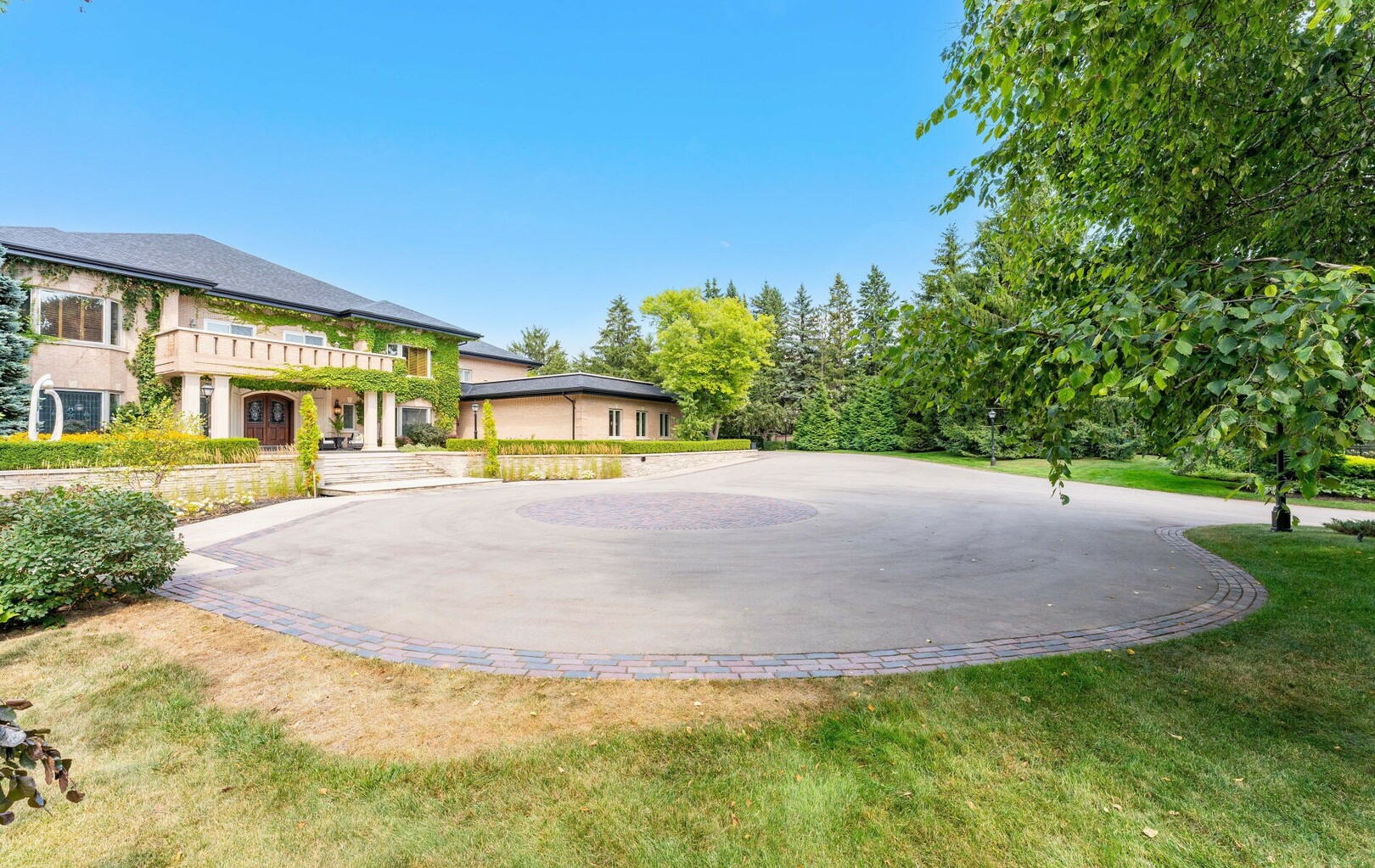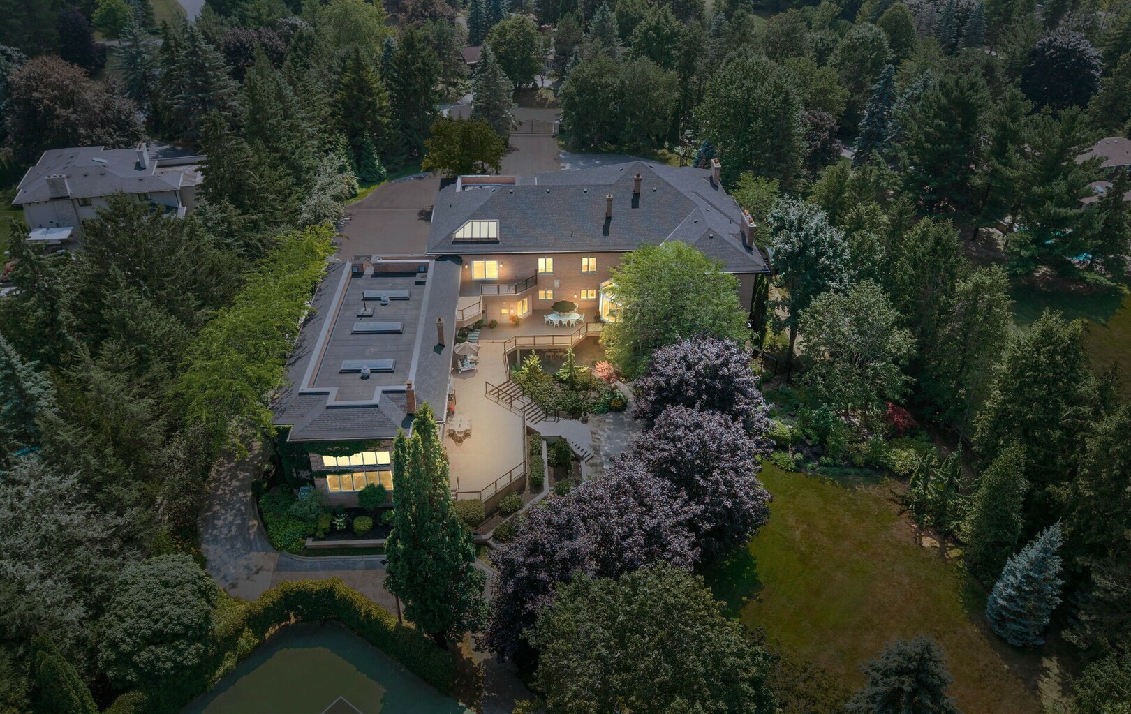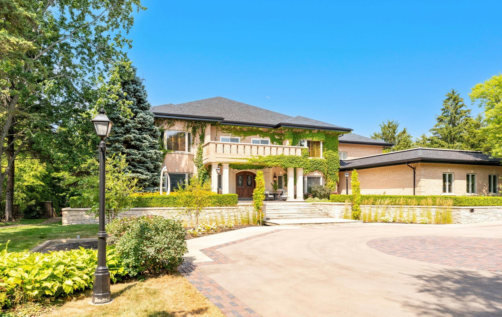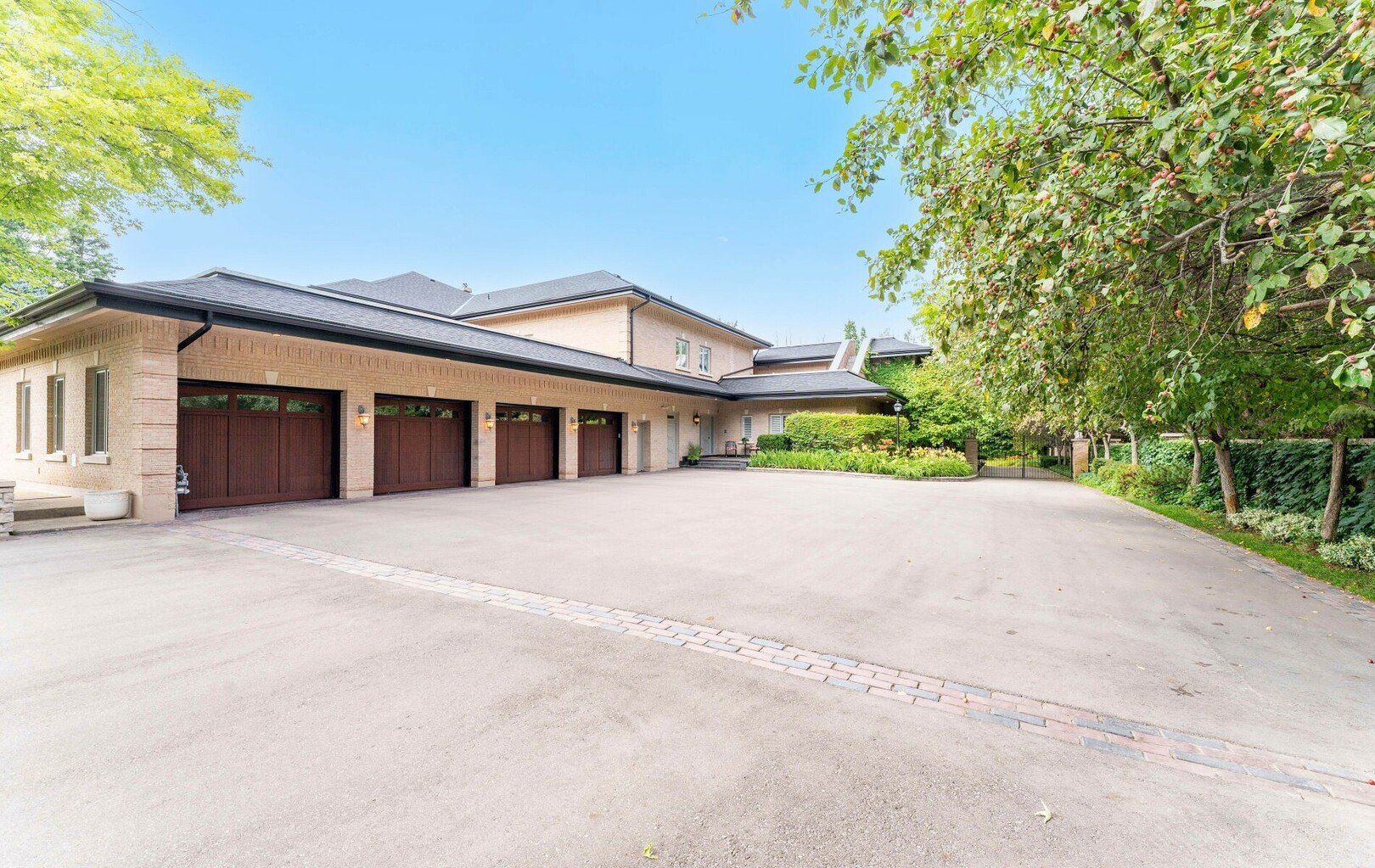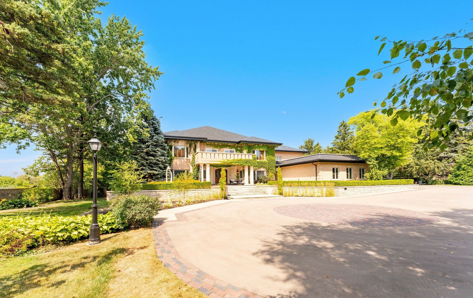 The estate’s 2.08-acre lot is landscaped with artistry, featuring manicured lawns and outdoor living spaces perfect for entertaining or quiet reflection. A four-car garage with parking for 40+ vehicles ensures convenience and flexibility.