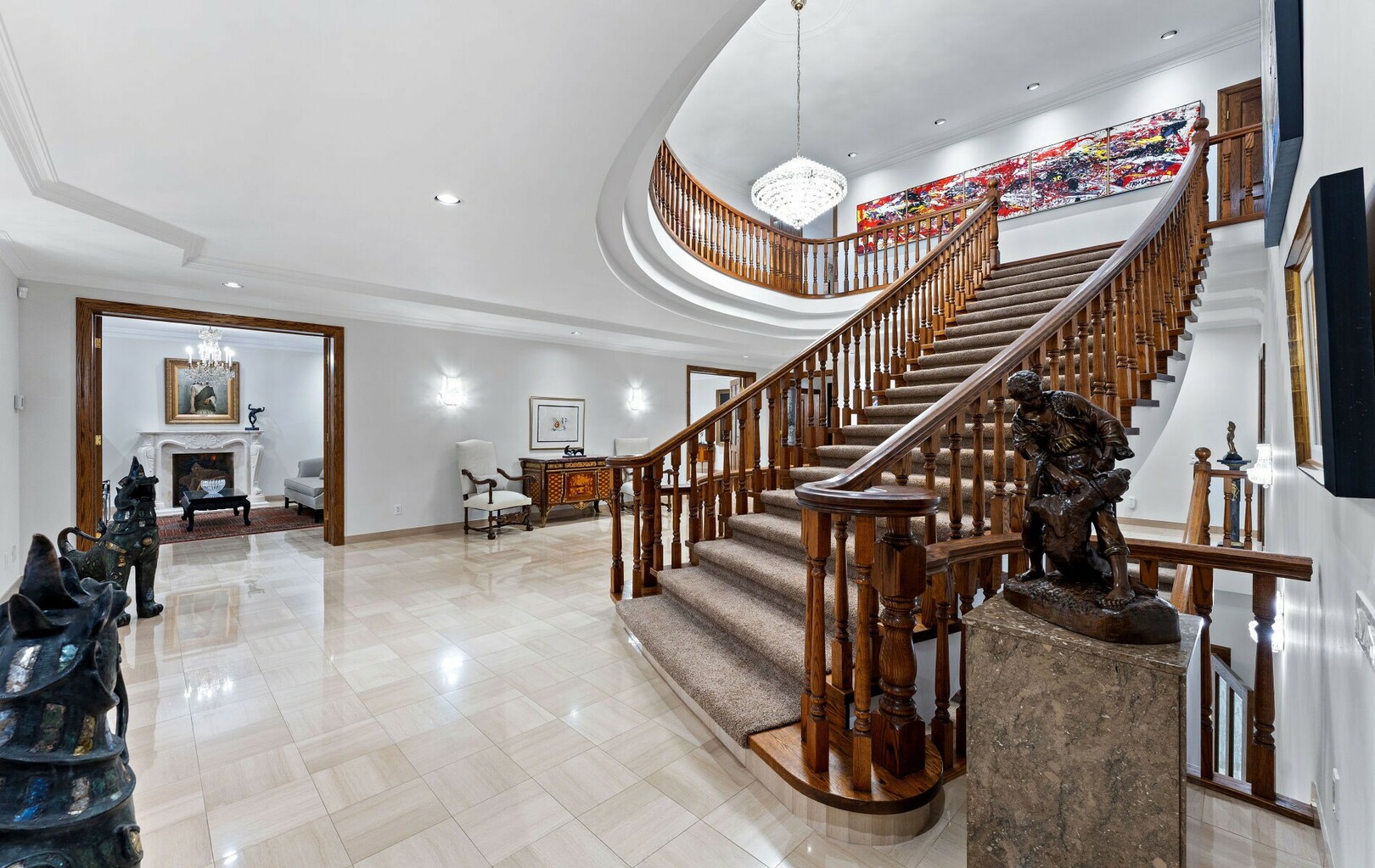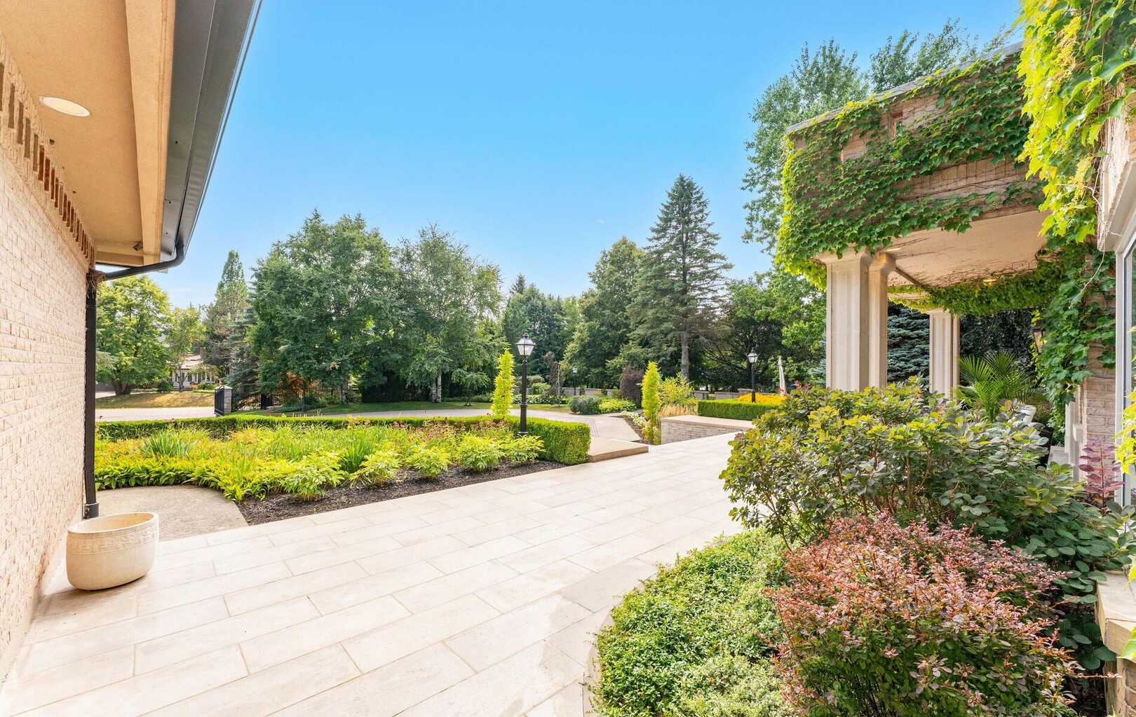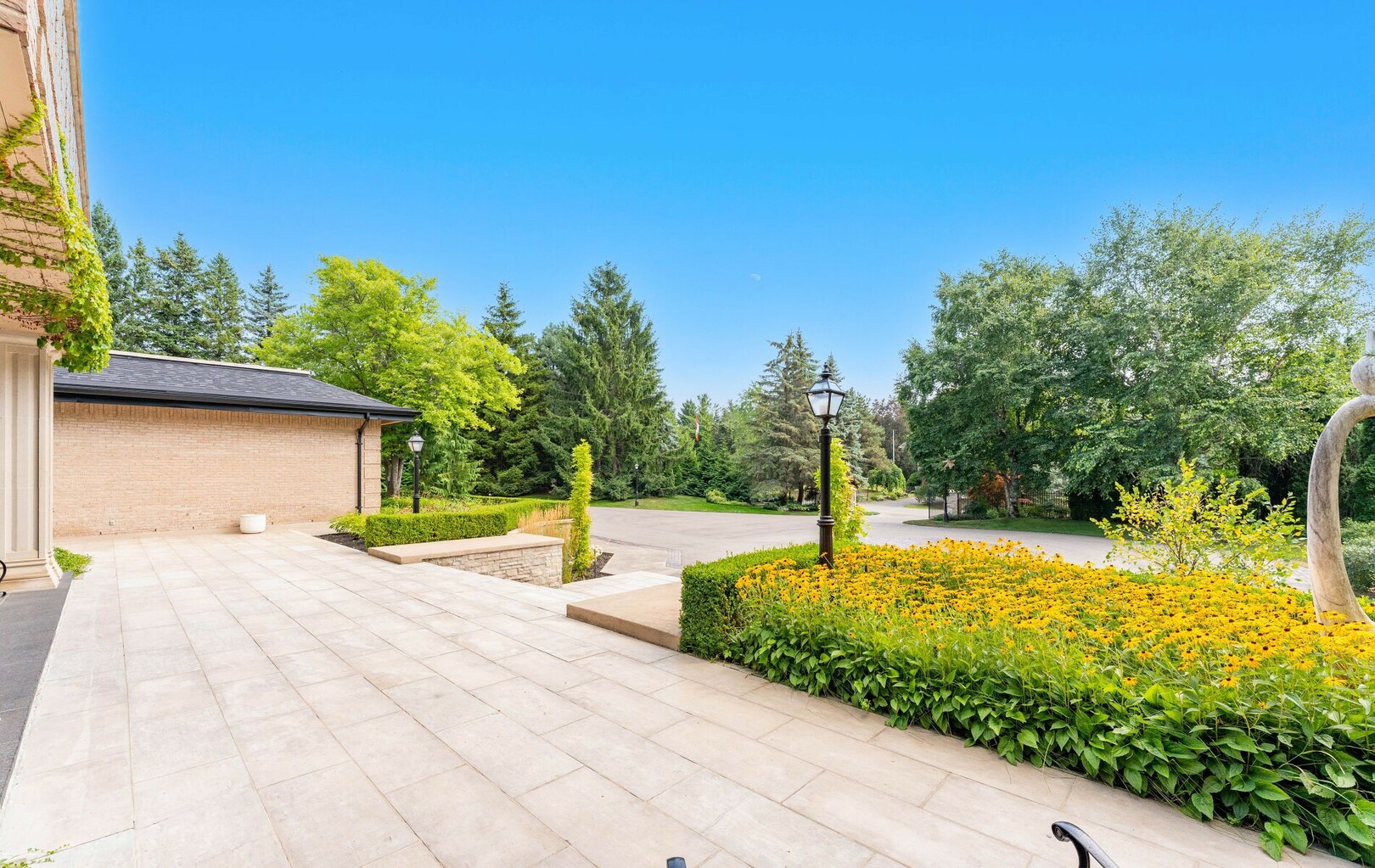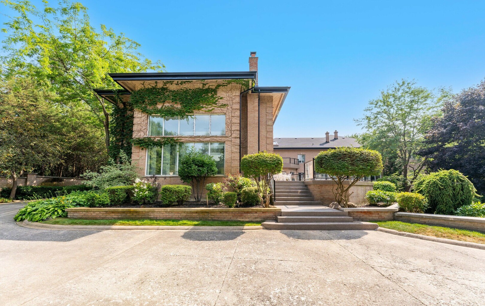 The estate’s 2.08-acre lot is landscaped with artistry, featuring manicured lawns and outdoor living spaces perfect for entertaining or quiet reflection. A four-car garage with parking for 40+ vehicles ensures convenience and flexibility.
