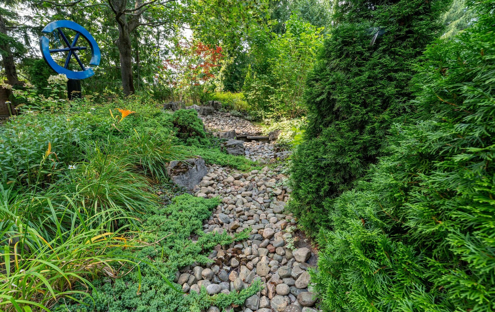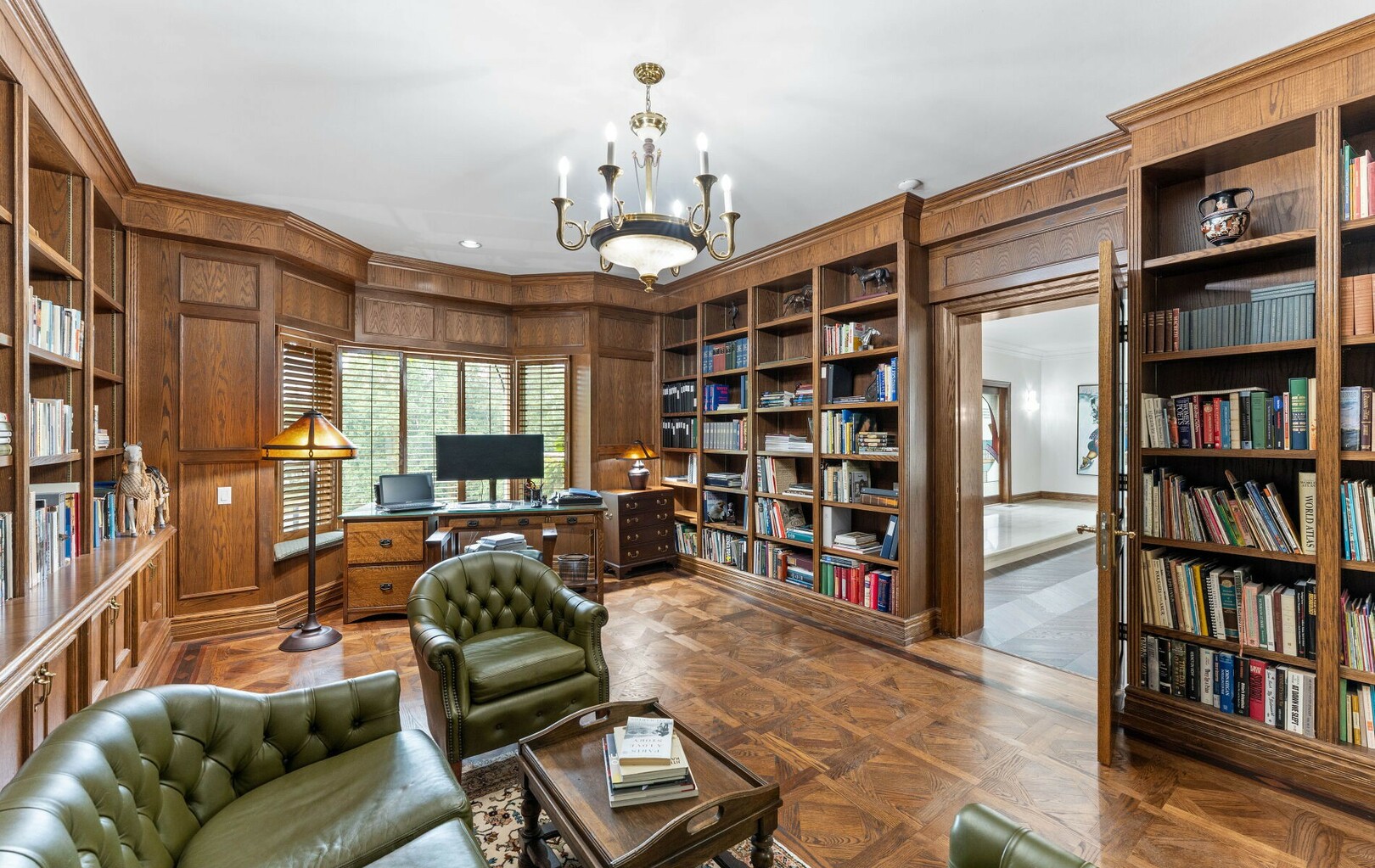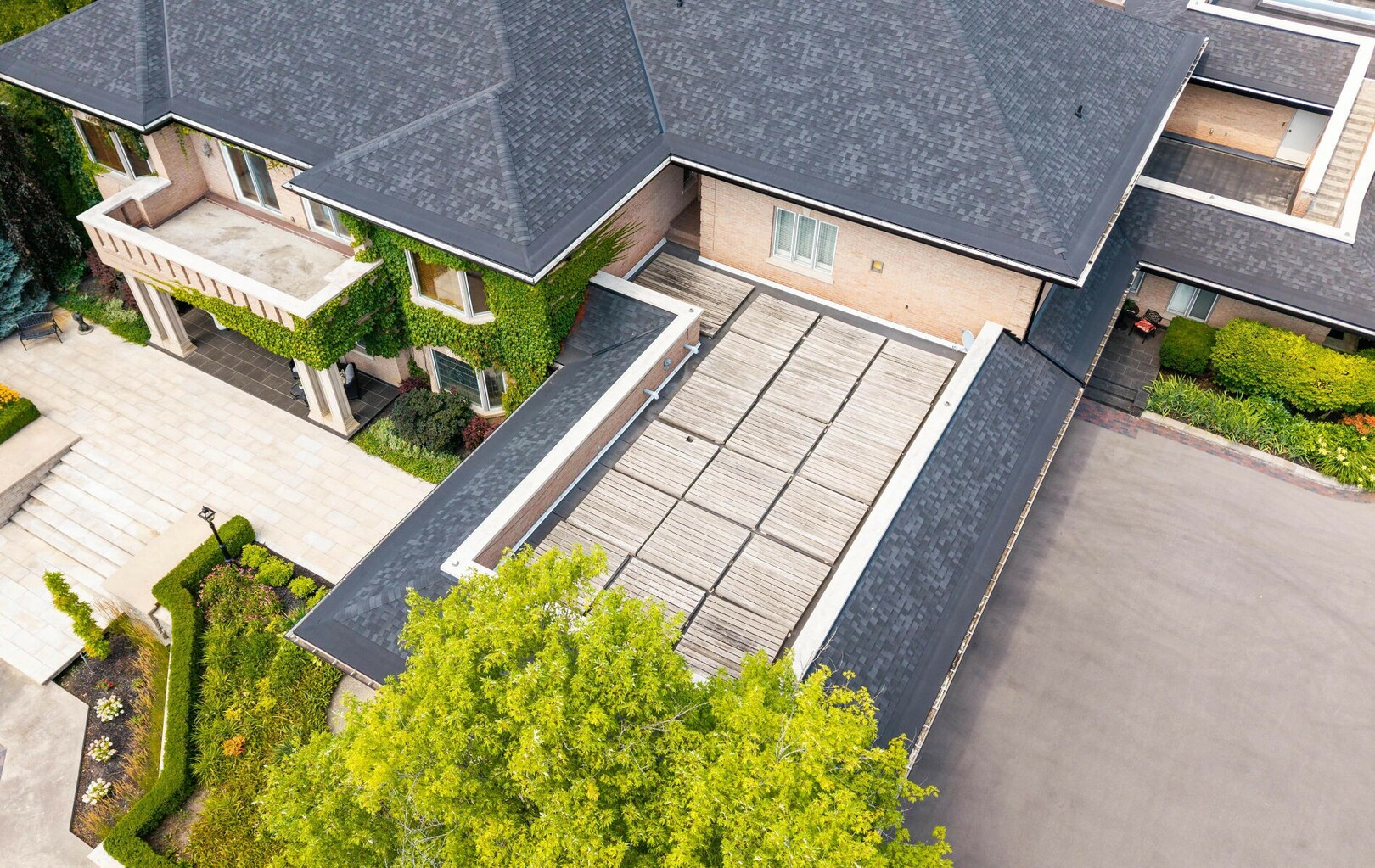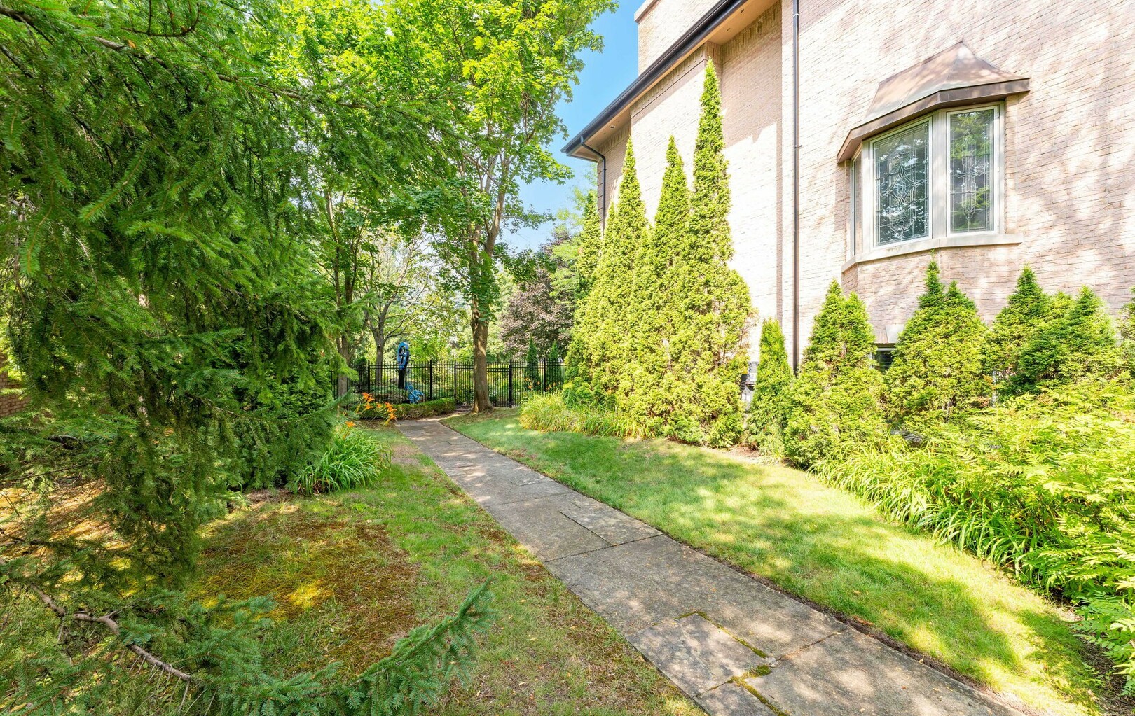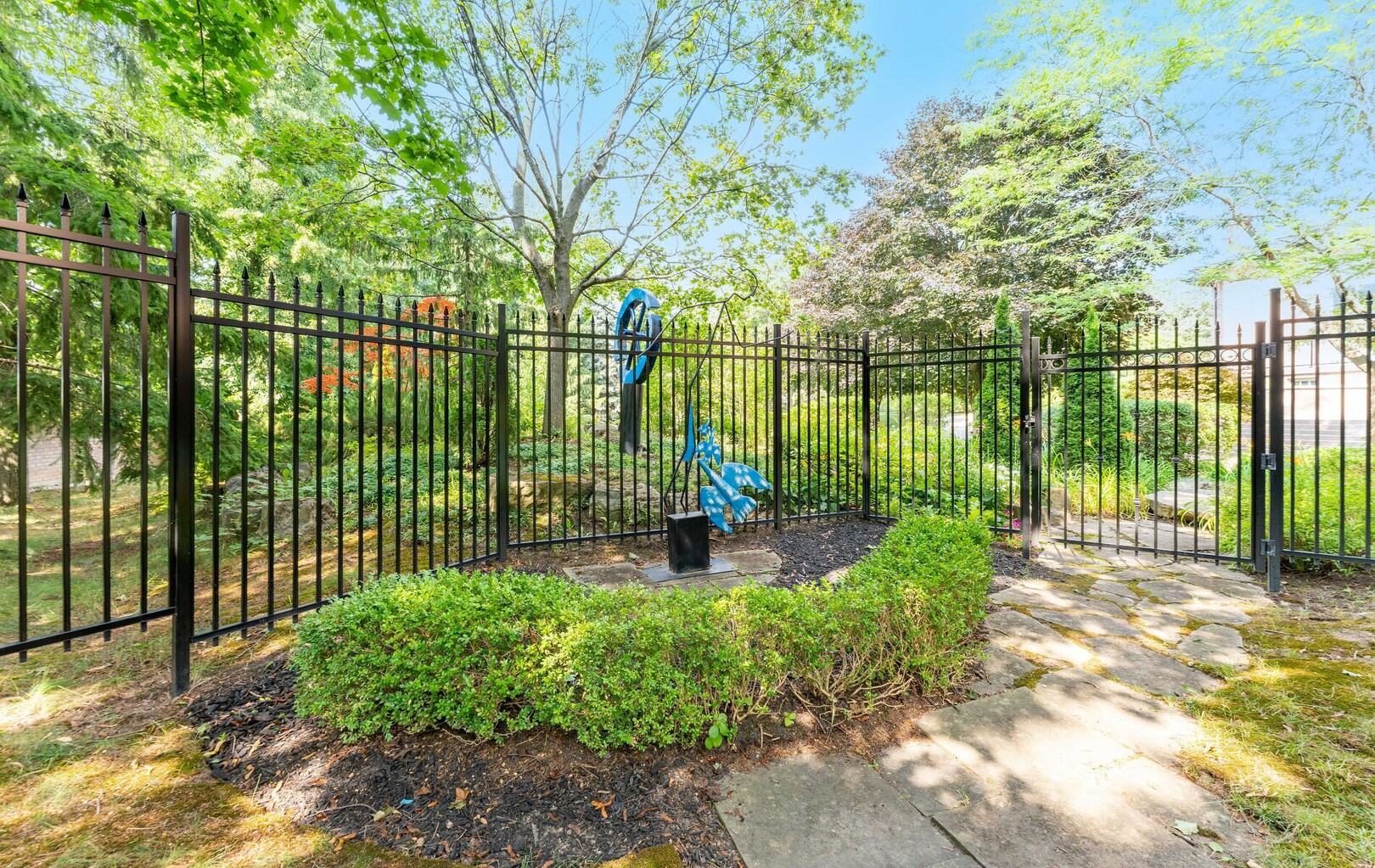 The estate’s 2.08-acre lot is landscaped with artistry, featuring manicured lawns and outdoor living spaces perfect for entertaining or quiet reflection. A four-car garage with parking for 40+ vehicles ensures convenience and flexibility.