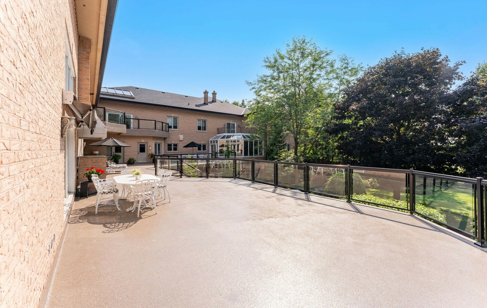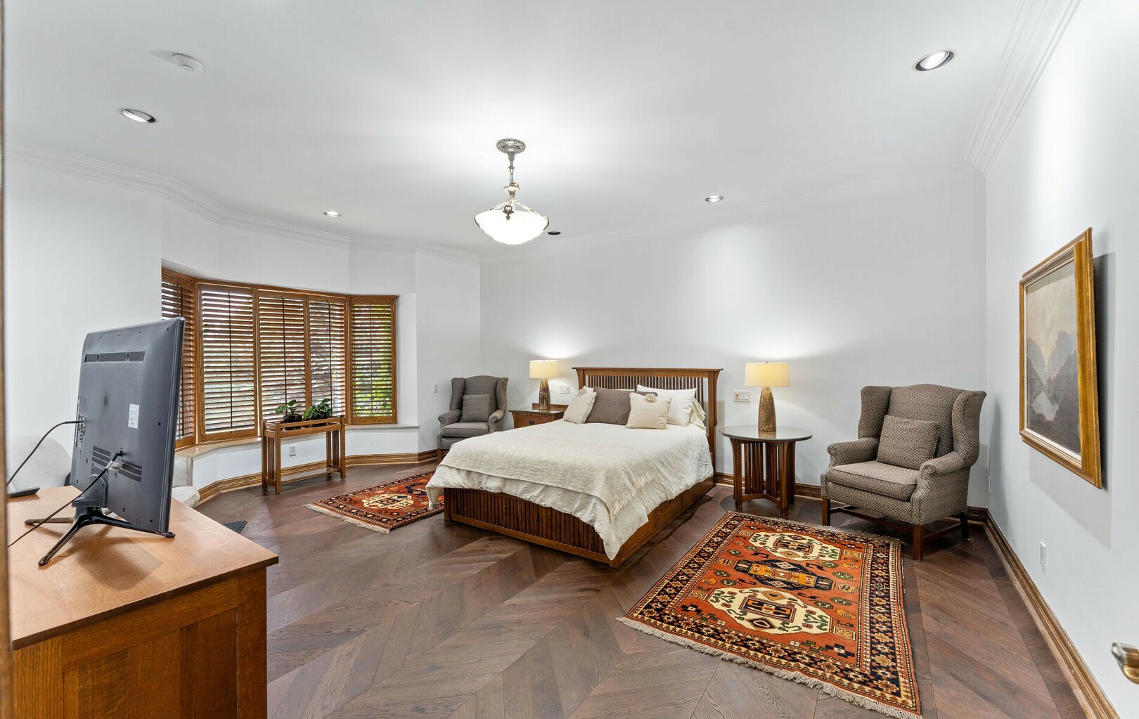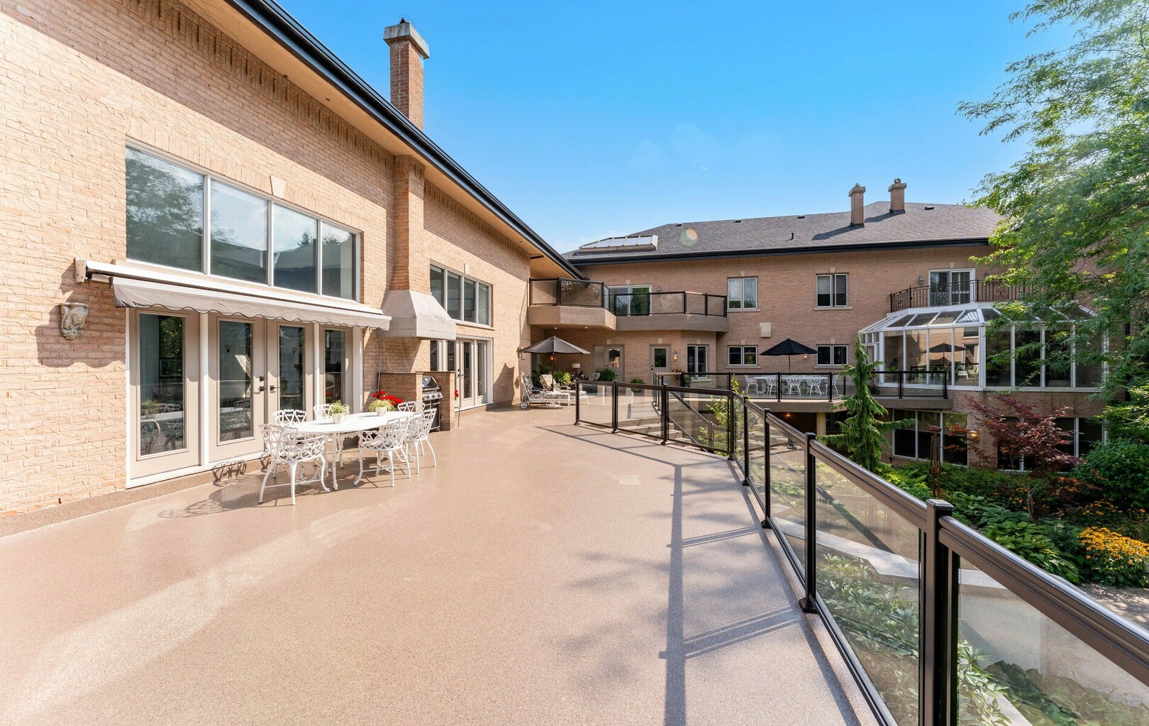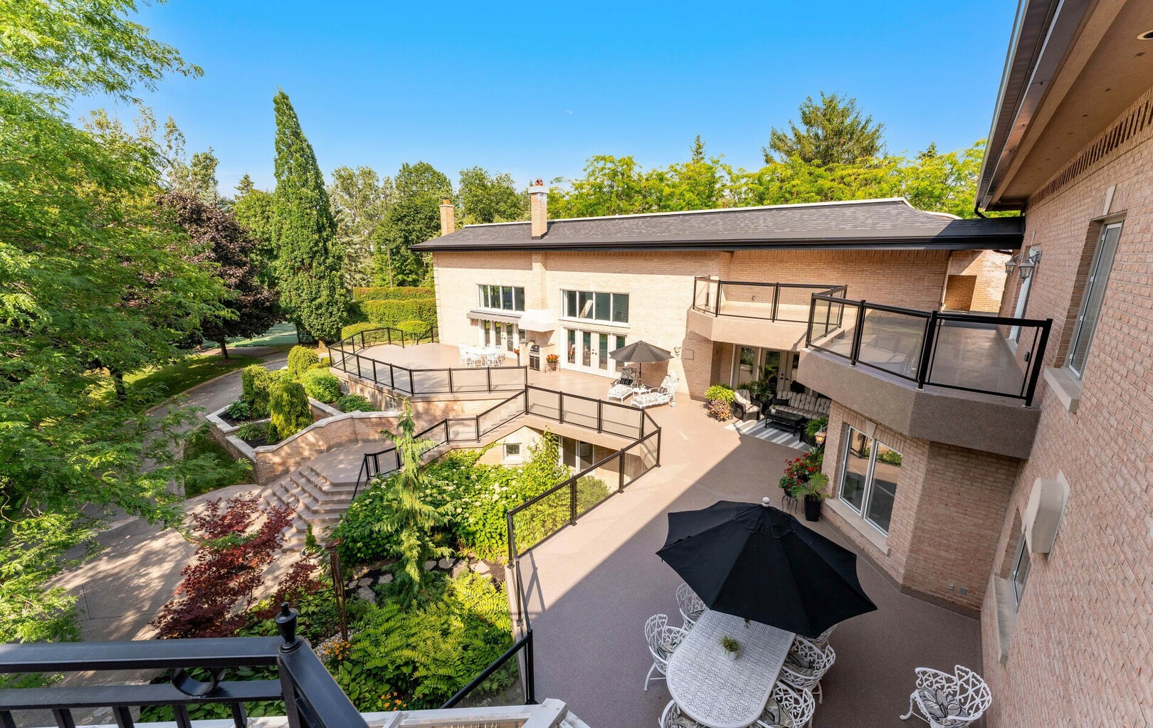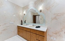 The estate offers five bedrooms, each with walk-in closets and spa-like ensuites. The primary suite is its crown jewel, featuring a private balcony walk out from the sitting area with fireplace and wet bar, a lavish 7-piece bath, custom cabinetry, and a dressing space akin to a boutique. With two laundry rooms—including one directly off the primary suite—function meets refinement at every turn.