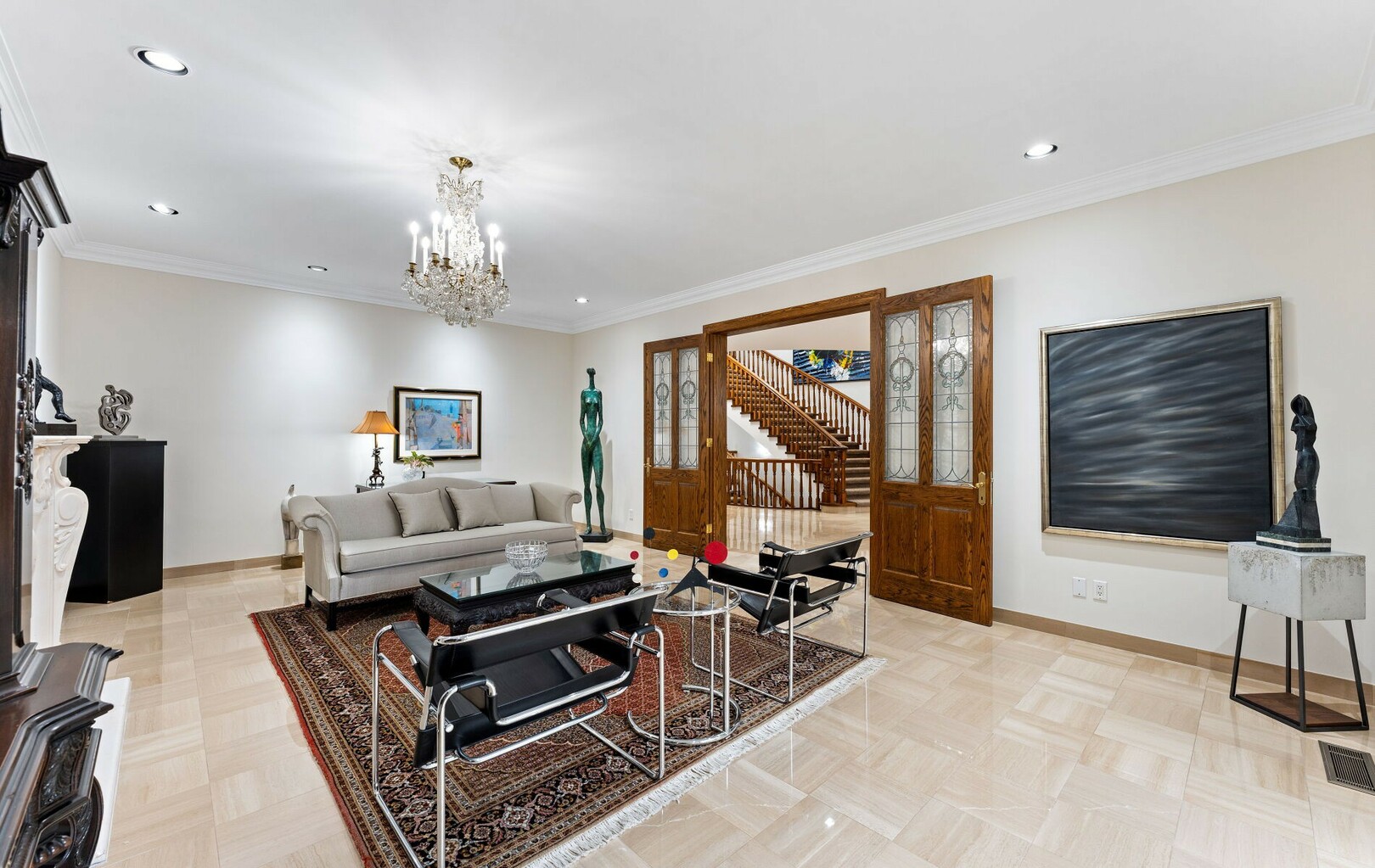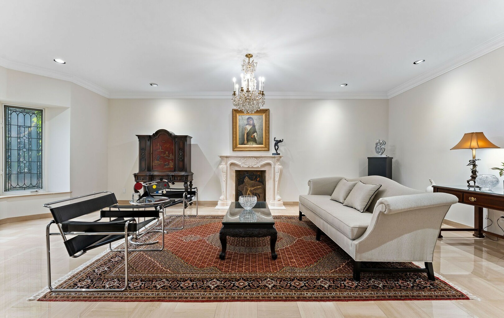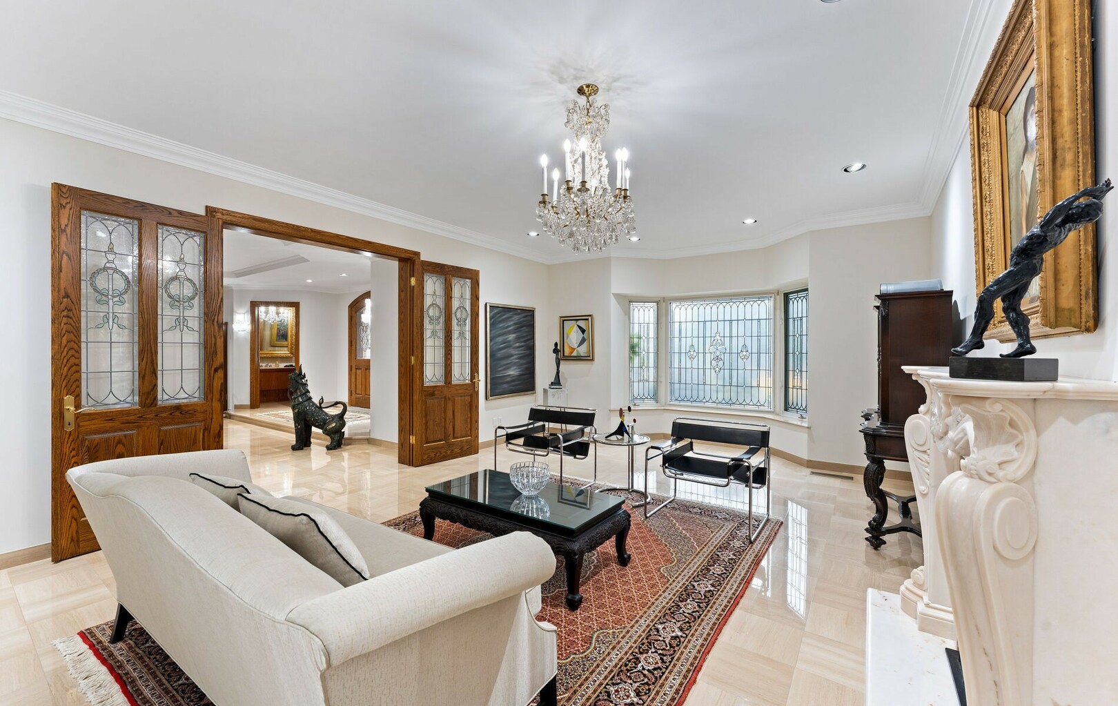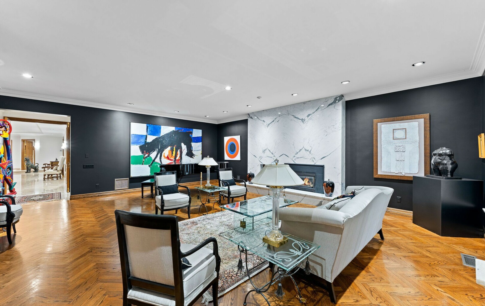 The main level balances elegance with comfort—marble floors, soaring windows, and warm woodwork set the tone. Multiple kitchens, including a chef’s haven and secondary preparation areas, ensure that hosting is effortless. Expansive principal rooms lead naturally to terraces and gardens, blurring the line between indoors and out.