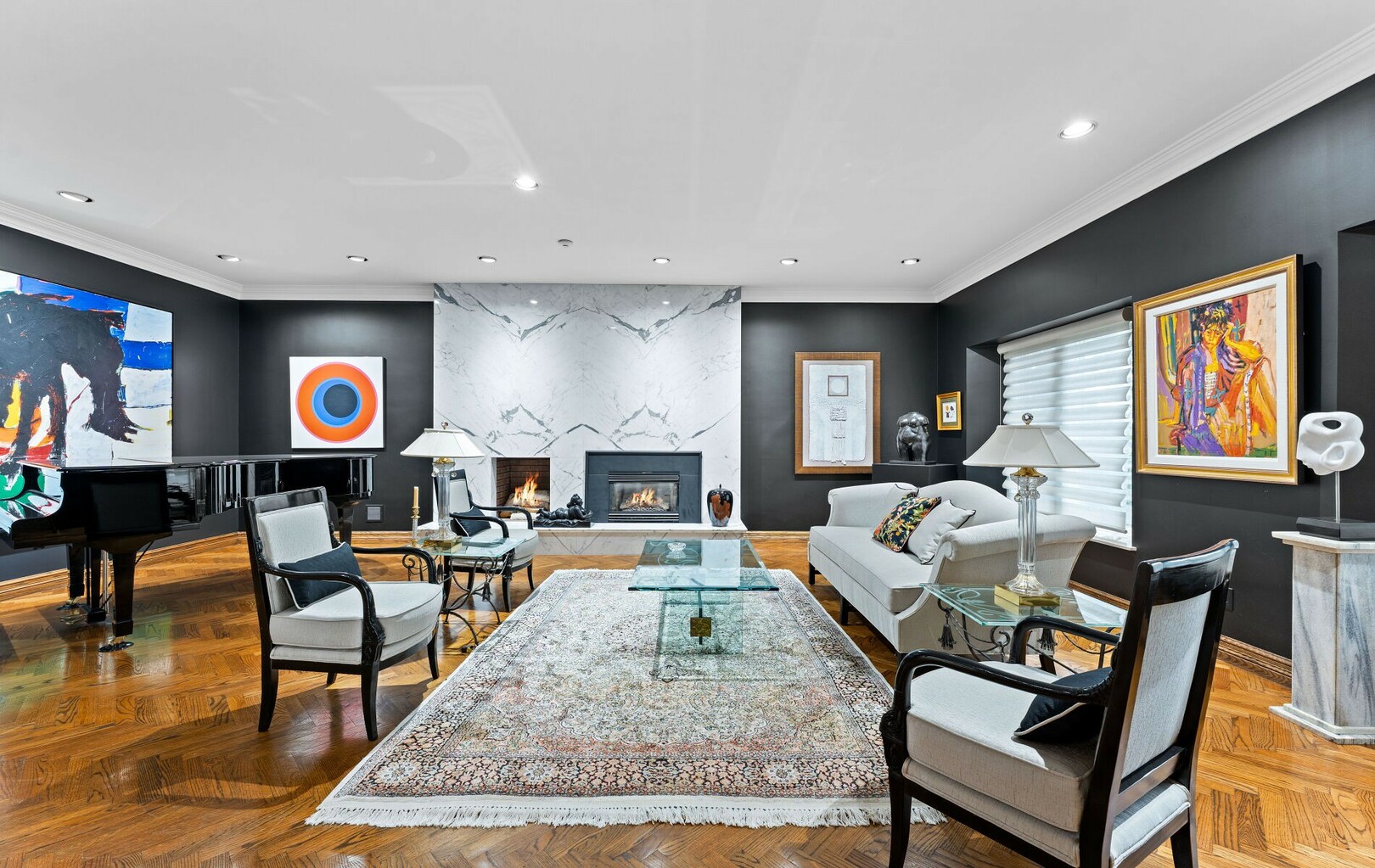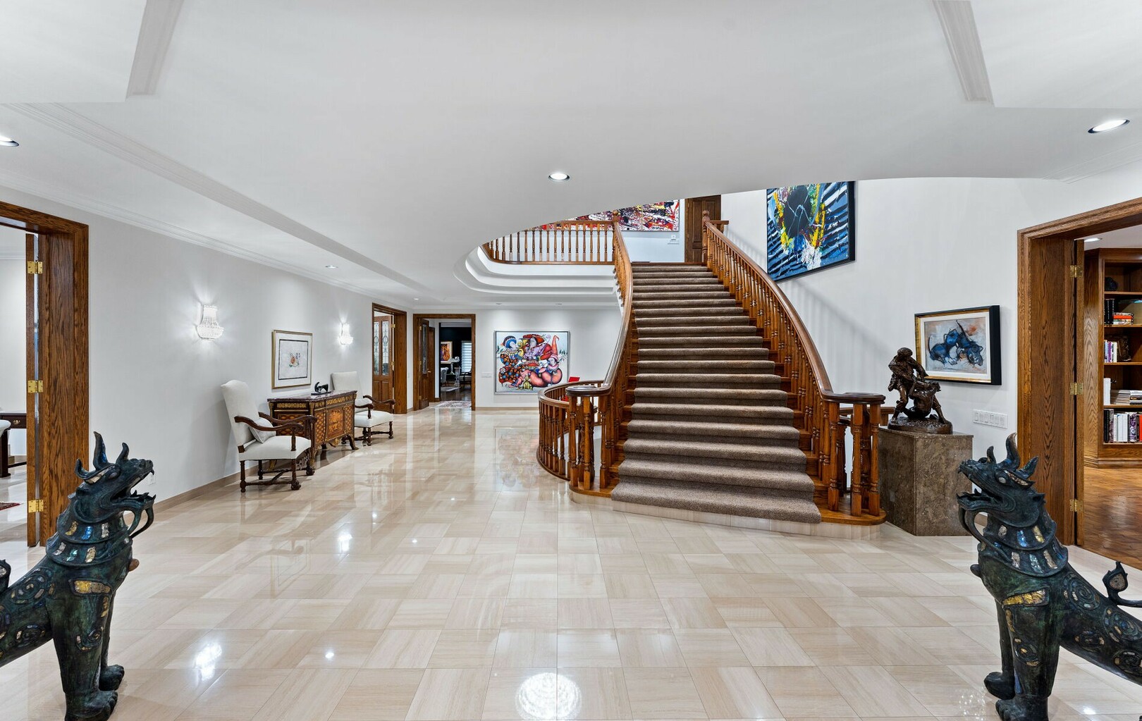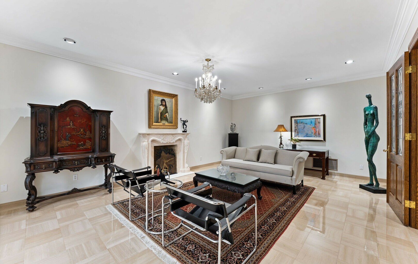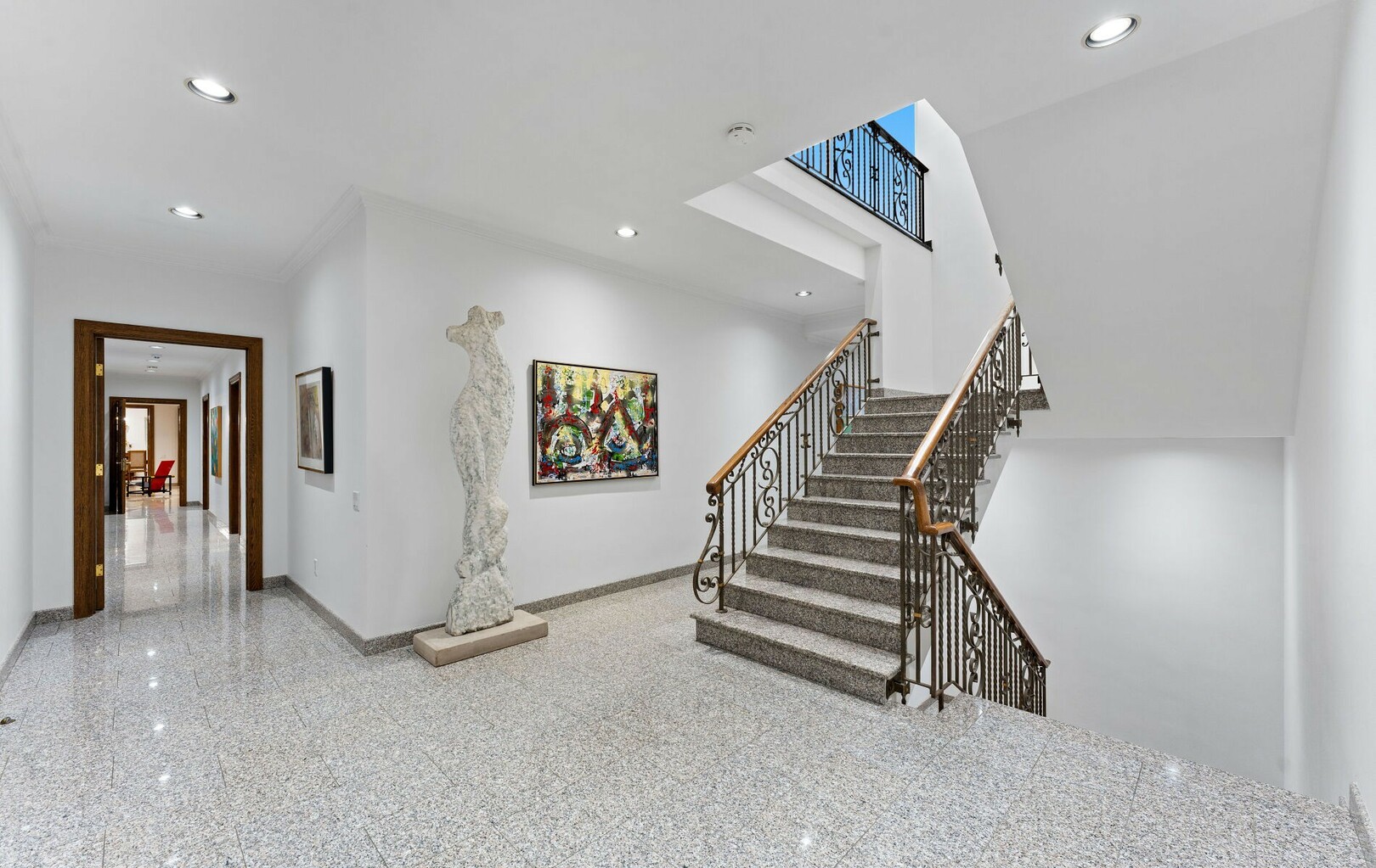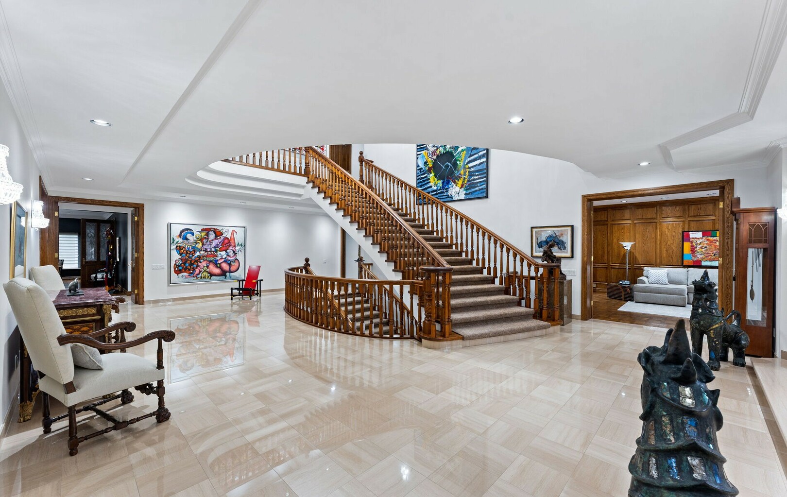 The main level balances elegance with comfort—marble floors, soaring windows, and warm woodwork set the tone. Multiple kitchens, including a chef’s haven and secondary preparation areas, ensure that hosting is effortless. Expansive principal rooms lead naturally to terraces and gardens, blurring the line between indoors and out.