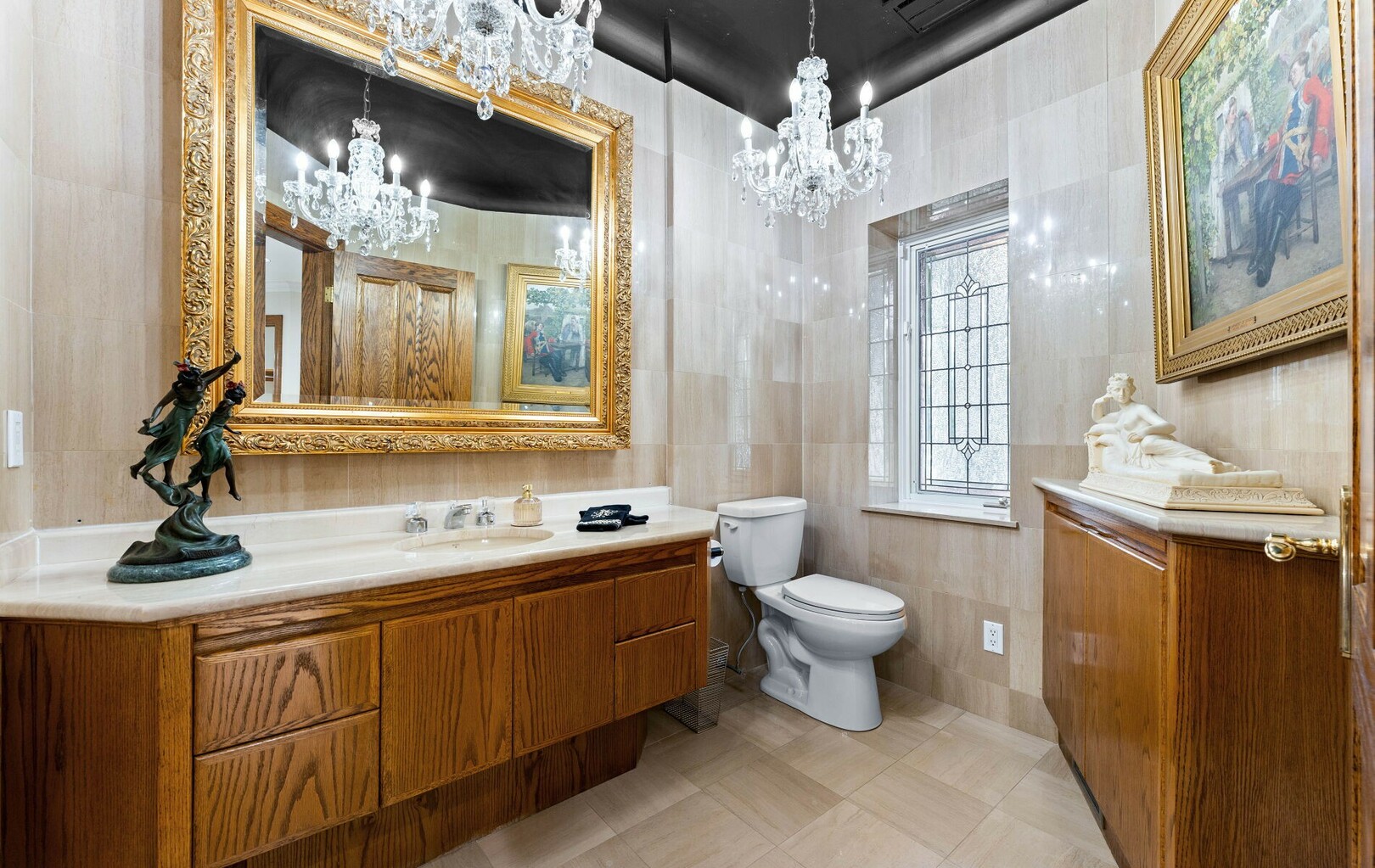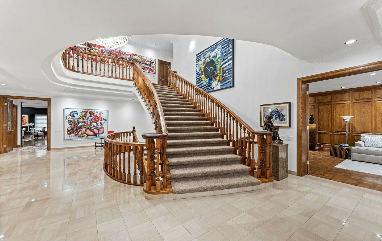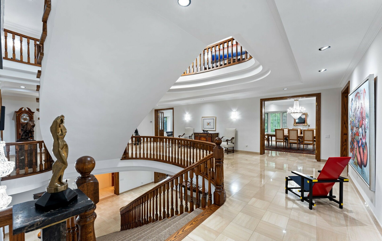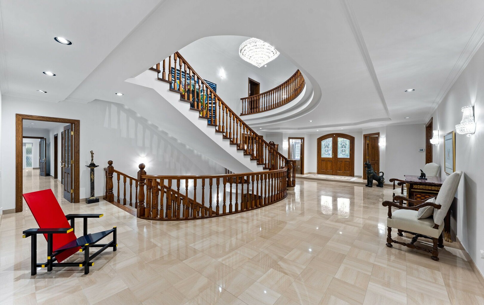 The main level balances elegance with comfort—marble floors, soaring windows, and warm woodwork set the tone. Multiple kitchens, including a chef’s haven and secondary preparation areas, ensure that hosting is effortless. Expansive principal rooms lead naturally to terraces and gardens, blurring the line between indoors and out.
