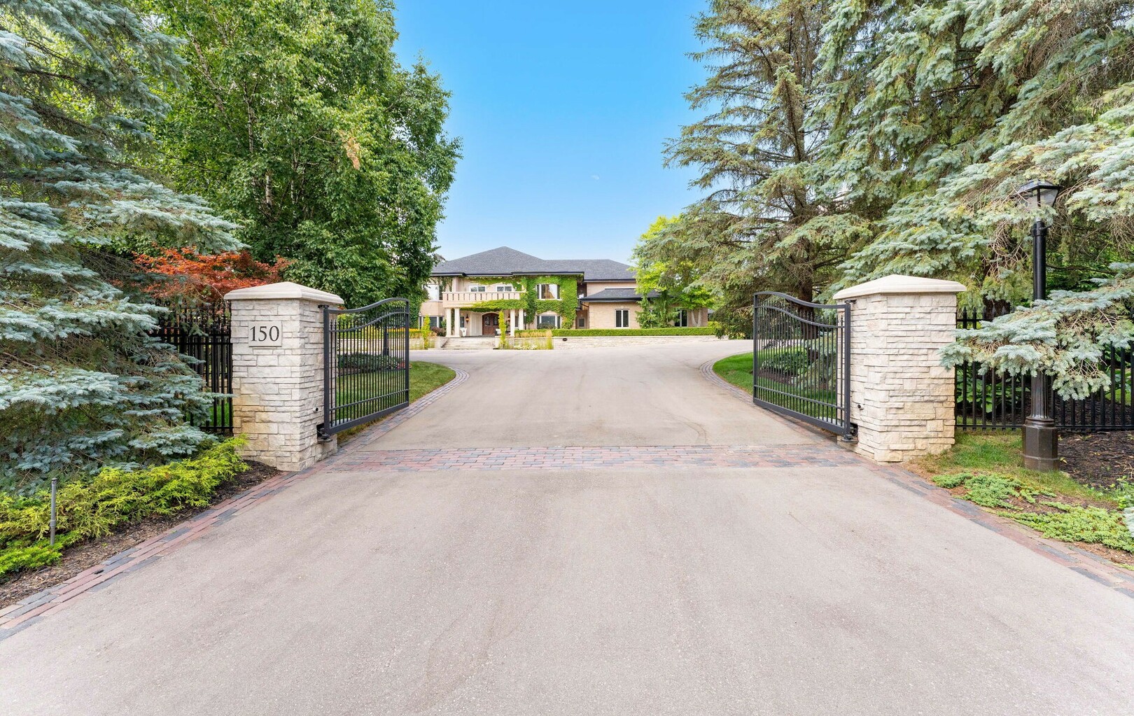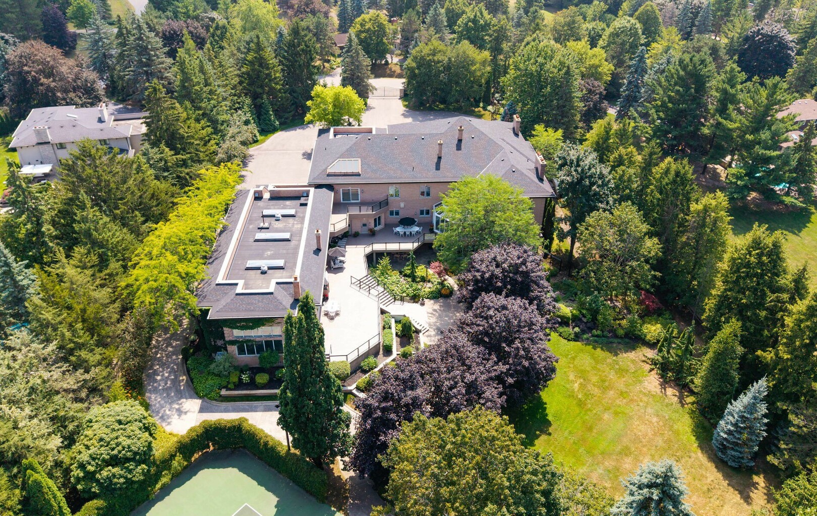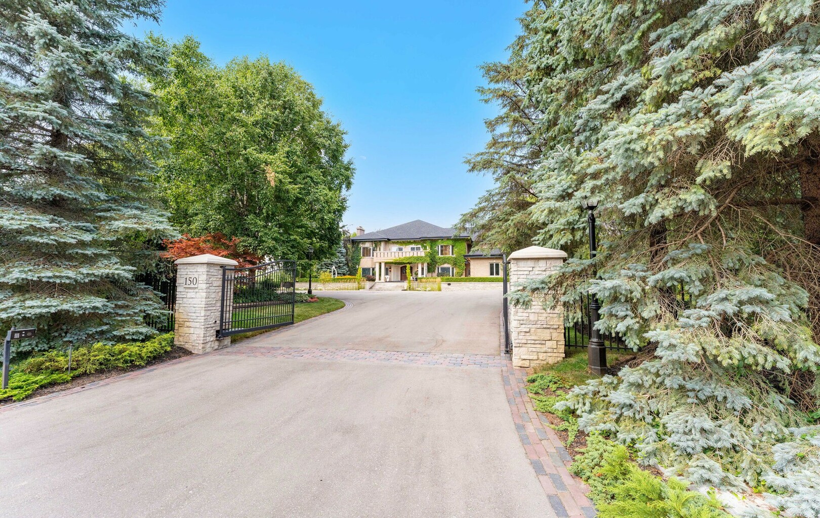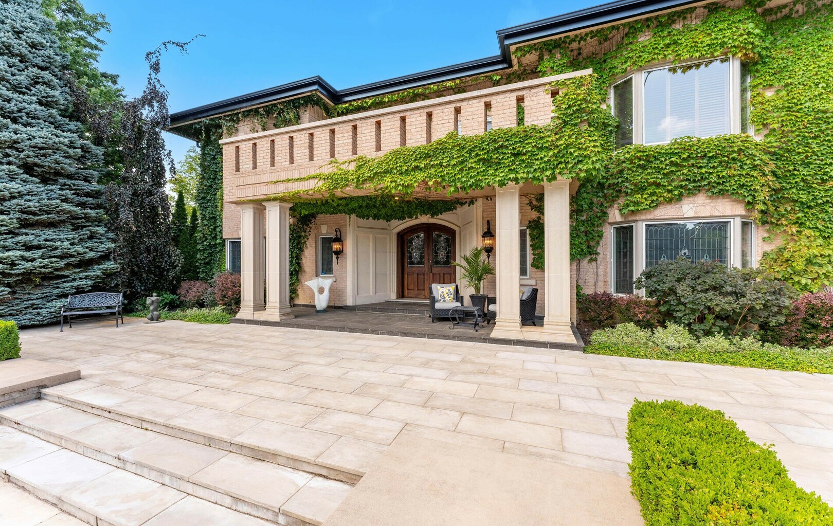 A Rare Architectural Gem! Step into a world where artistry, craftsmanship, and architectural vision meet. This one-of-a-kind estate spans over 22,000 square feet of living space and is built to stand the test of time. Constructed with solid concrete and fronted by a pure limestone façade, the residence offers unmatched enduring strength and permanence, reminiscent of a private castle.From the moment you arrive, the homes presence is undeniable. Expansive manicured gardens, a professional sized tennis court with LED lighting, and a four-car garage set the tone for an estate designed with both elegance and functionality in mind. Inside, the amenities continue with a large indoor bromine pool and hot tub with a walk-out to the terrace, while the lower level offers a kitchen, bar area, and recreation room with its own walk-out to the grounds. Spaces flow effortlessly. Inside, the home reveals layer upon layer of unique detail and artistry:A striking floating staircase anchors the main foyer with architectural flair Handcrafted stained glass windows transform light through gentle refraction, filling each room with soft elegant hues. Solid wood doors, intricate trim work, and custom millwork speak to the caliber of craftsmanship rarely seen today. A curated art collection and Arts & Crafts-inspired elements add depth, character, and artistic soul throughout. The estate offers an exceptionally flexible layout designed to adapt to many lifestyles with 5 bedrooms in total. Four bedrooms each offer their own luxurious 5-piece ensuite, complete with elegant vanities, generous built-in cabinetry, and/or spacious walk-in closets. The Primary Suite is a private retreat, featuring a cozy sitting area with a private wet bar, walk-out access to a balcony, a lavish 7-piece bathroom, a custom built-in armoire, and an expansive walk-in closet. All walk-in closets throughout are equipped with closet organizers. (id:9346)