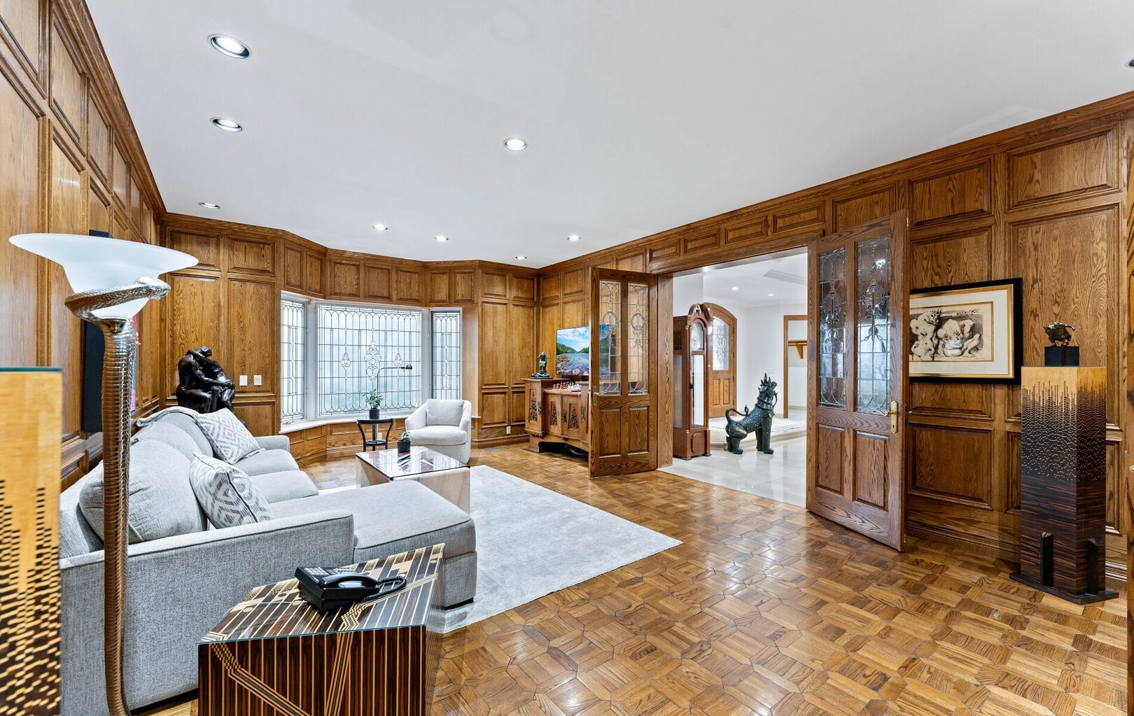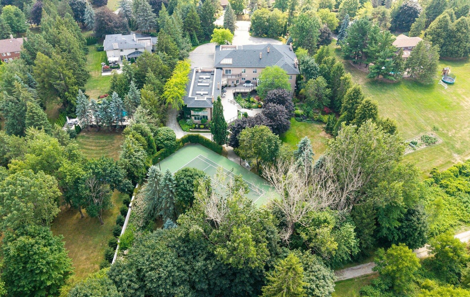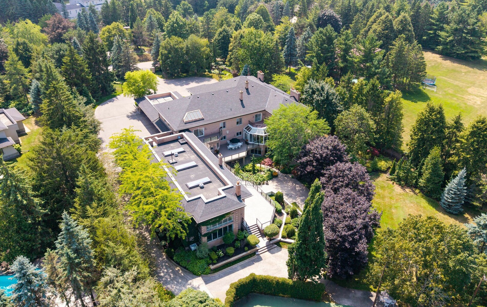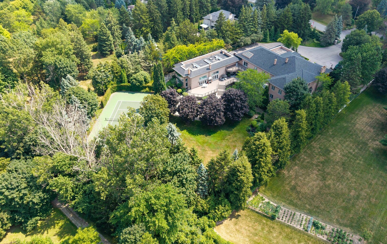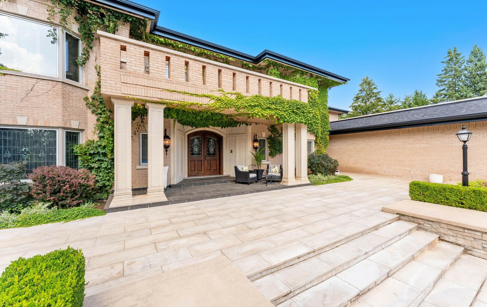 A Rare Architectural Gem! Step into a world where artistry, craftsmanship, and architectural vision meet. This one-of-a-kind estate spans over 22,000 square feet of living space and is built to stand the test of time. Constructed with solid concrete and fronted by a pure limestone façade, the residence offers unmatched enduring strength and permanence, reminiscent of a private castle.From the moment you arrive, the homes presence is undeniable. Expansive manicured gardens, a professional sized tennis court with LED lighting, and a four-car garage set the tone for an estate designed with both elegance and functionality in mind. Inside, the amenities continue with a large indoor bromine pool and hot tub with a walk-out to the terrace, while the lower level offers a kitchen, bar area, and recreation room with its own walk-out to the grounds. Spaces flow effortlessly. Inside, the home reveals layer upon layer of unique detail and artistry:A striking floating staircase anchors the main foyer with architectural flair Handcrafted stained glass windows transform light through gentle refraction, filling each room with soft elegant hues. Solid wood doors, intricate trim work, and custom millwork speak to the caliber of craftsmanship rarely seen today. A curated art collection and Arts & Crafts-inspired elements add depth, character, and artistic soul throughout. The estate offers an exceptionally flexible layout designed to adapt to many lifestyles with 5 bedrooms in total. Four bedrooms each offer their own luxurious 5-piece ensuite, complete with elegant vanities, generous built-in cabinetry, and/or spacious walk-in closets. The Primary Suite is a private retreat, featuring a cozy sitting area with a private wet bar, walk-out access to a balcony, a lavish 7-piece bathroom, a custom built-in armoire, and an expansive walk-in closet. All walk-in closets throughout are equipped with closet organizers. (id:9346)