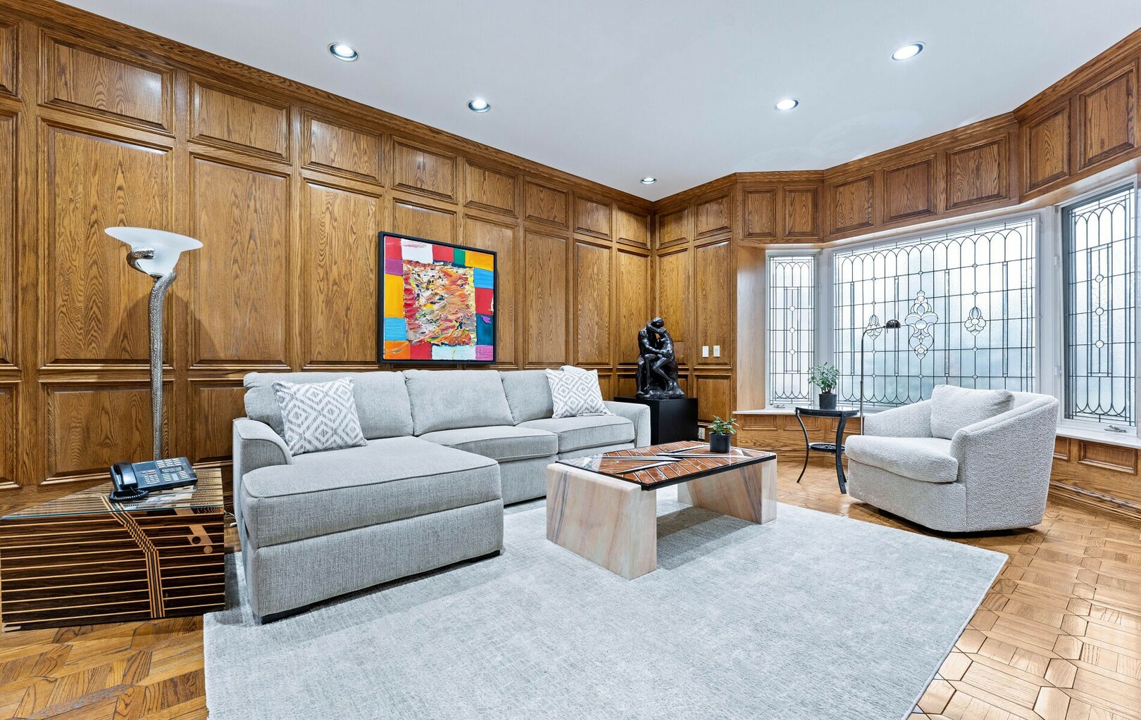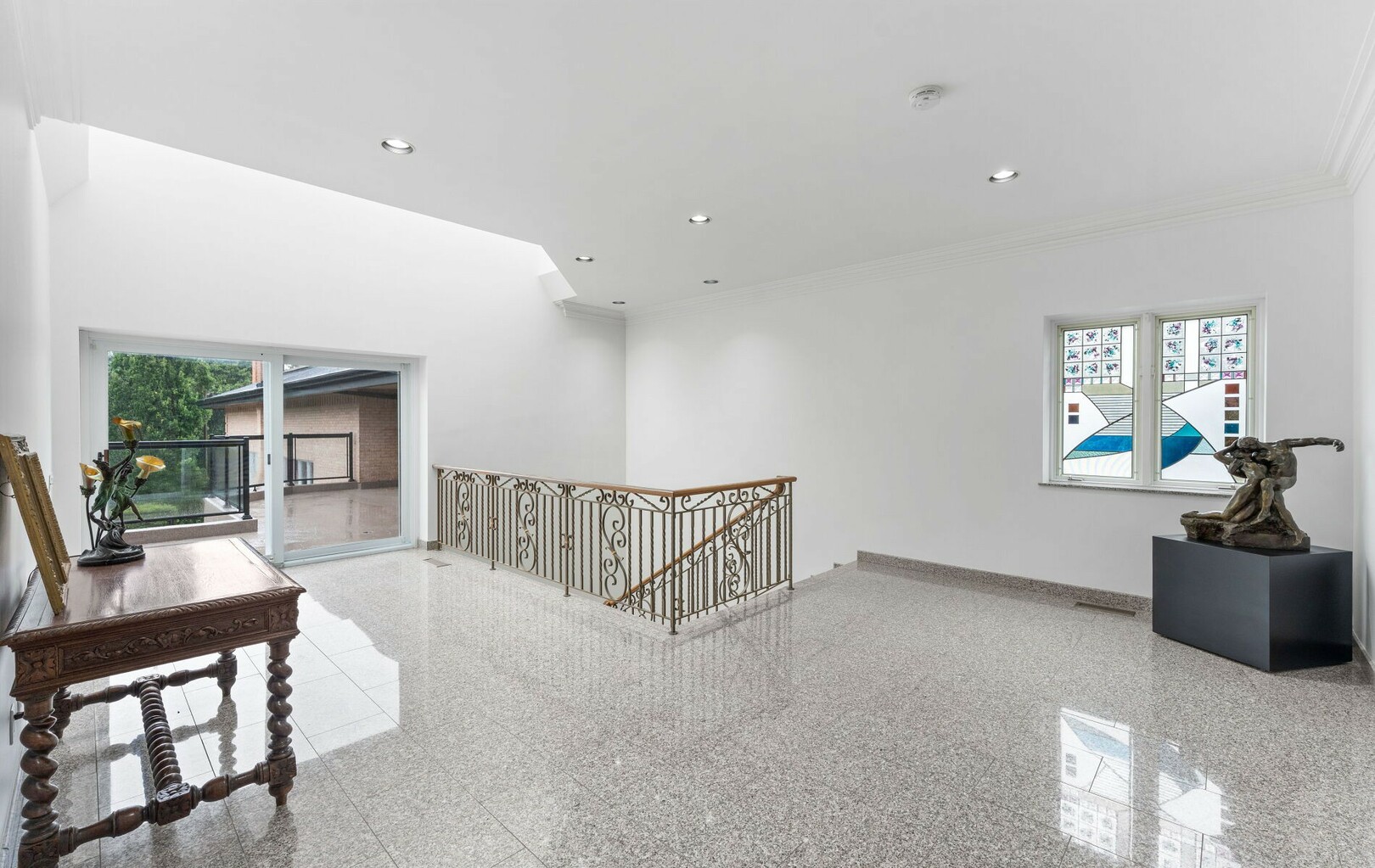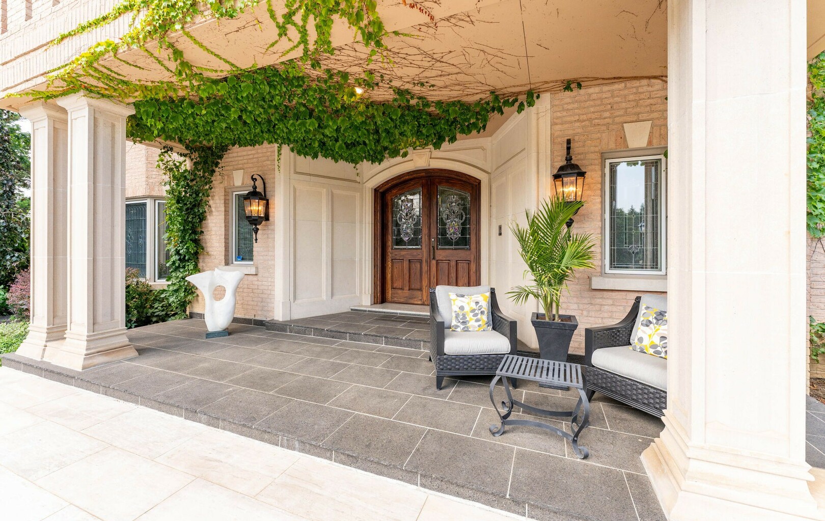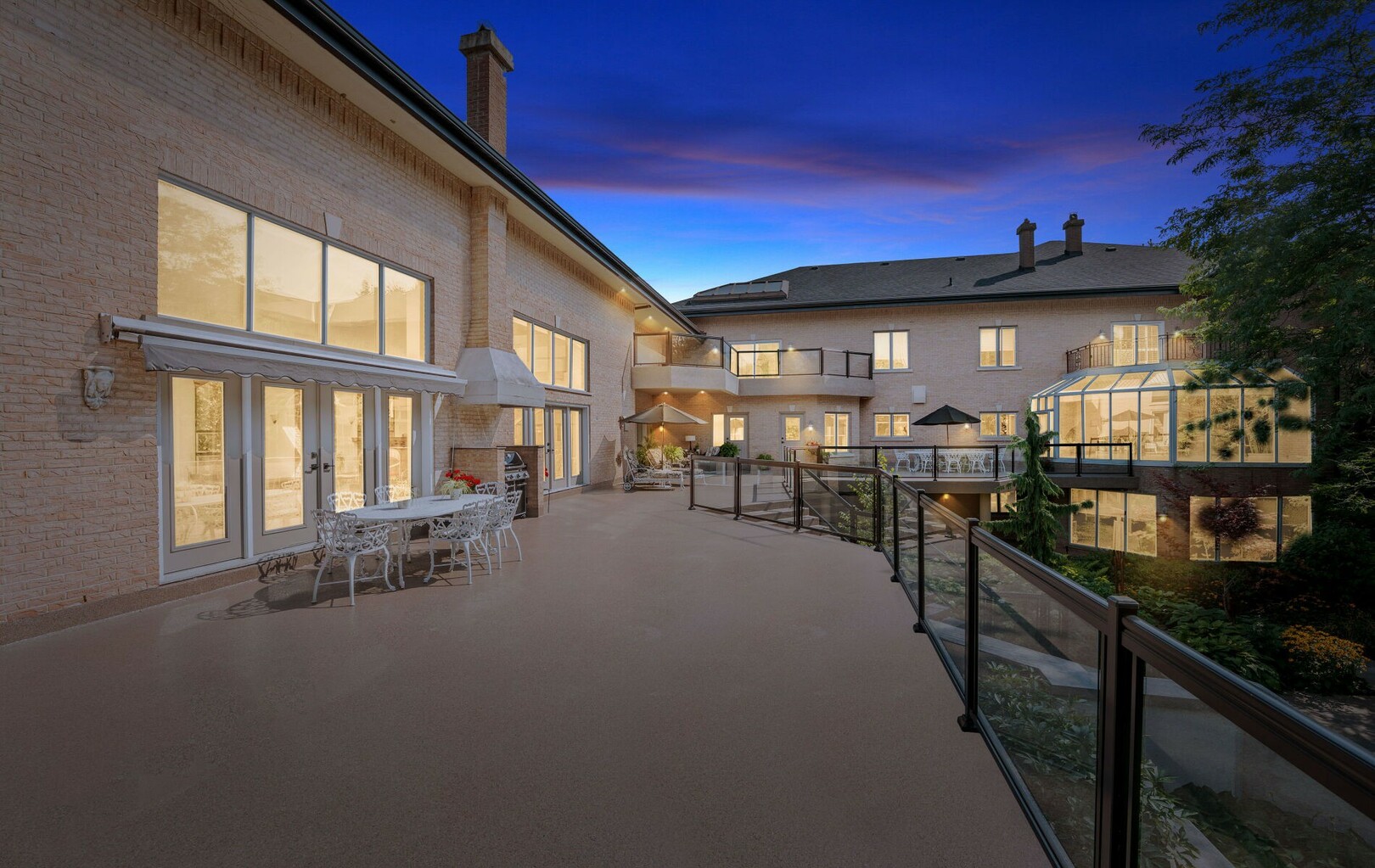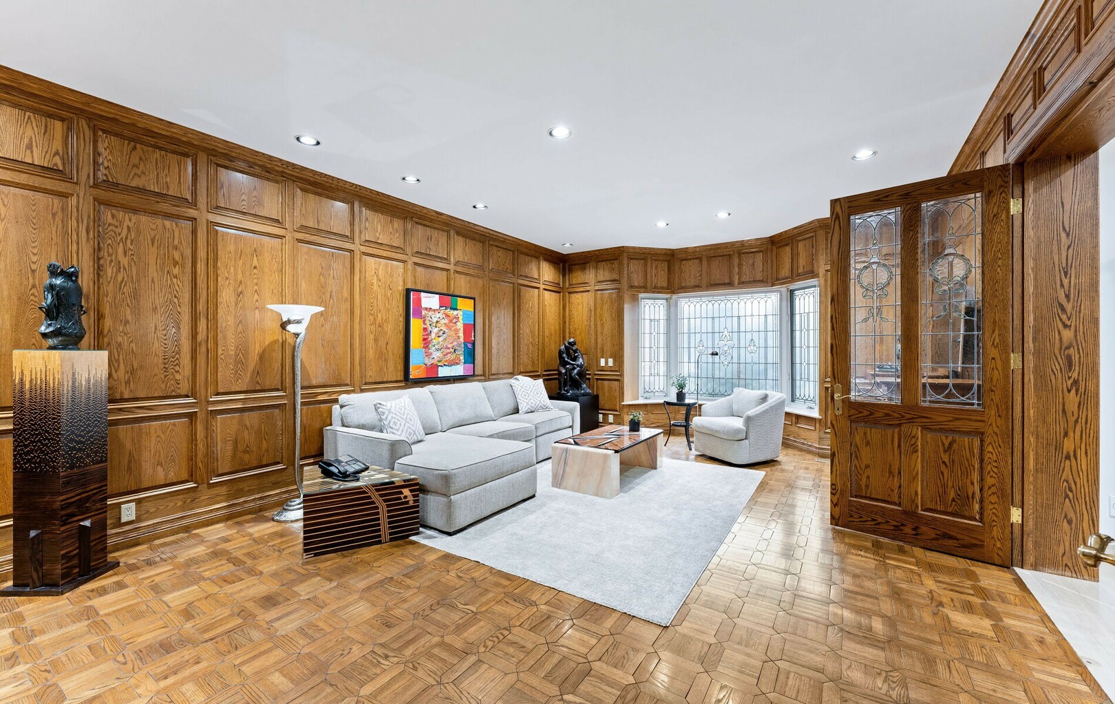 A Rare Architectural Gem! Step into a world where artistry, craftsmanship, and architectural vision meet. This one-of-a-kind estate spans over 22,000 square feet of living space and is built to stand the test of time. Constructed with solid concrete and fronted by a pure limestone façade, the residence offers unmatched enduring strength and permanence, reminiscent of a private castle.From the moment you arrive, the homes presence is undeniable. Expansive manicured gardens, a professional sized tennis court with LED lighting, and a four-car garage set the tone for an estate designed with both elegance and functionality in mind. Inside, the amenities continue with a large indoor bromine pool and hot tub with a walk-out to the terrace, while the lower level offers a kitchen, bar area, and recreation room with its own walk-out to the grounds. Spaces flow effortlessly. Inside, the home reveals layer upon layer of unique detail and artistry:A striking floating staircase anchors the main foyer with architectural flair Handcrafted stained glass windows transform light through gentle refraction, filling each room with soft elegant hues. Solid wood doors, intricate trim work, and custom millwork speak to the caliber of craftsmanship rarely seen today. A curated art collection and Arts & Crafts-inspired elements add depth, character, and artistic soul throughout. The estate offers an exceptionally flexible layout designed to adapt to many lifestyles with 5 bedrooms in total. Four bedrooms each offer their own luxurious 5-piece ensuite, complete with elegant vanities, generous built-in cabinetry, and/or spacious walk-in closets. The Primary Suite is a private retreat, featuring a cozy sitting area with a private wet bar, walk-out access to a balcony, a lavish 7-piece bathroom, a custom built-in armoire, and an expansive walk-in closet. All walk-in closets throughout are equipped with closet organizers. (id:9346)