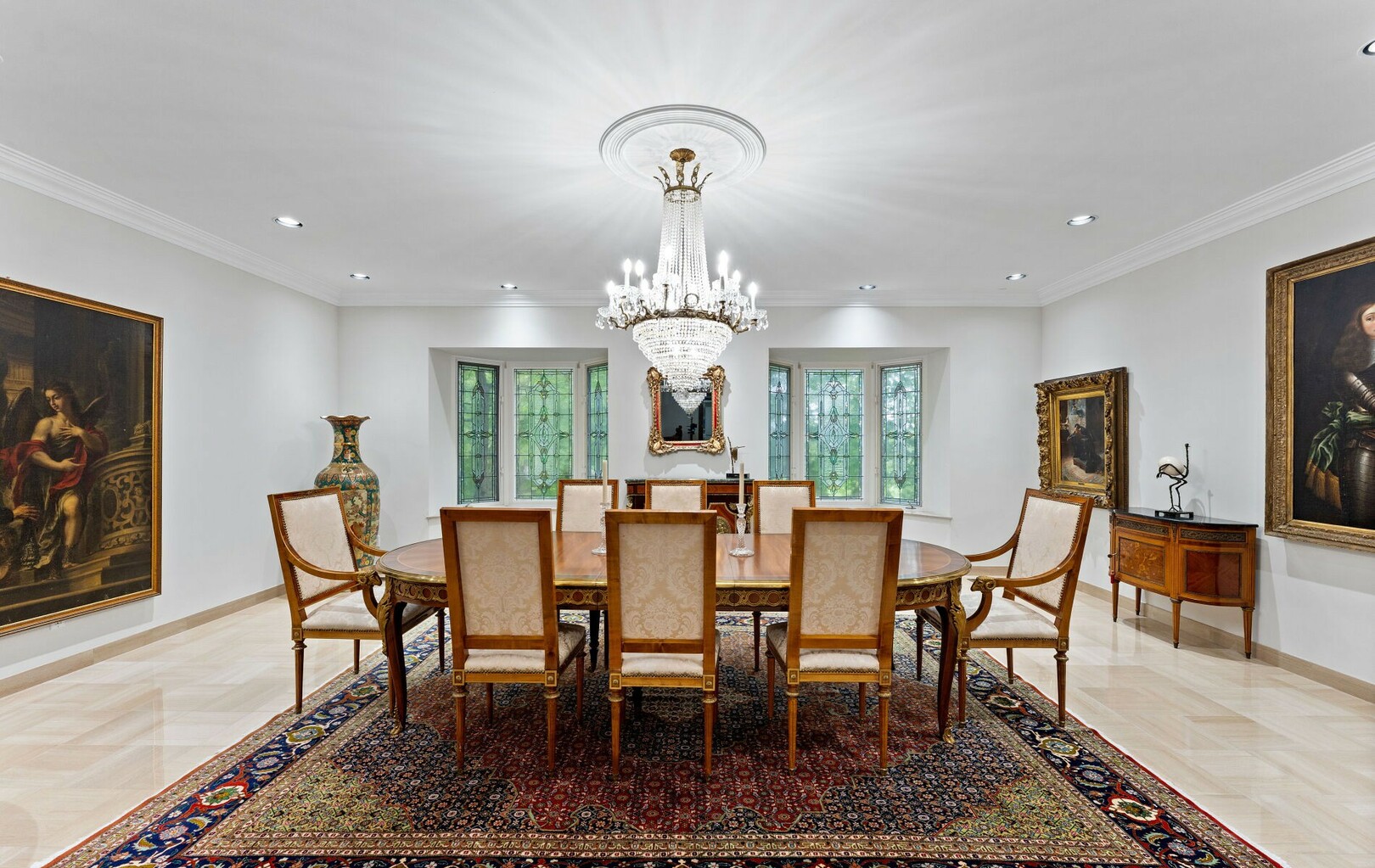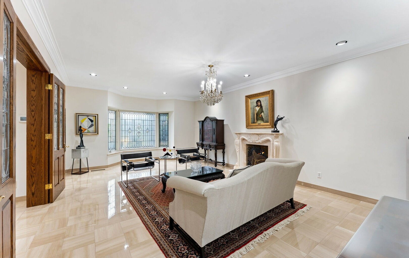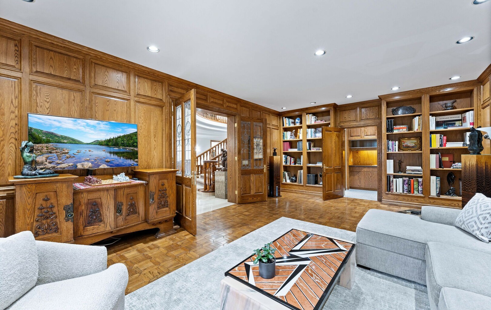 Inside, over 22,000 square feet of living space unfolds in seamless harmony. Every element, from handcrafted stained glass windows to artisan millwork, reflects a rare commitment to detail. The flow of the home invites both intimate family living and grand-scale entertaining.