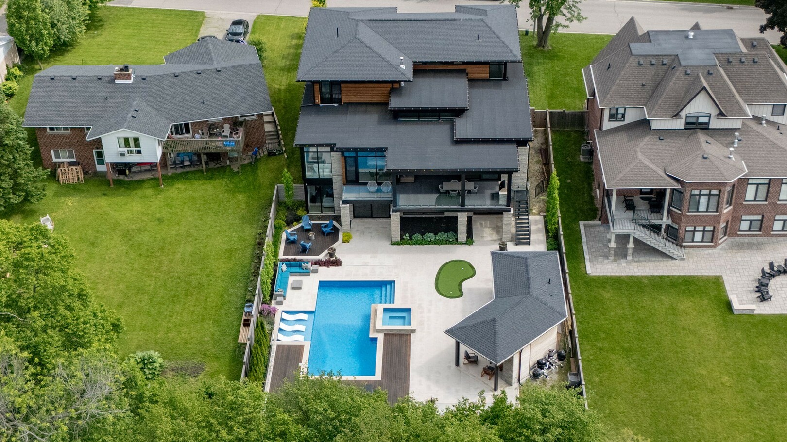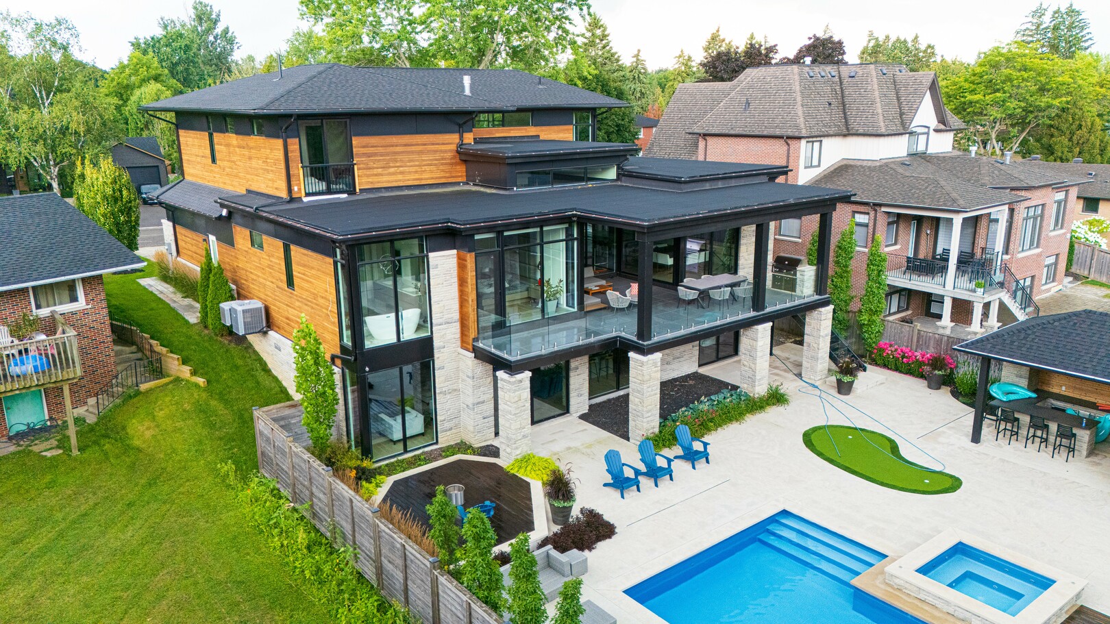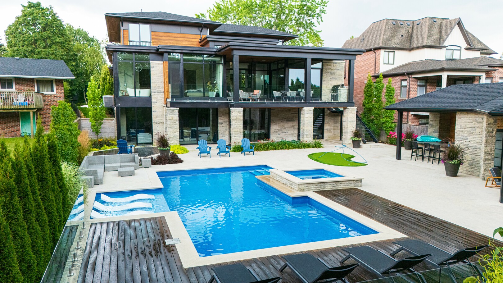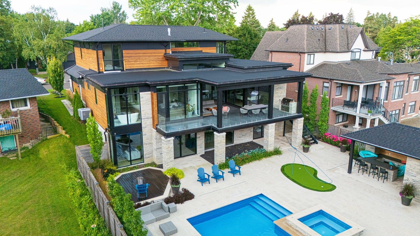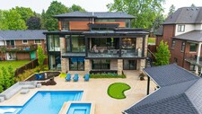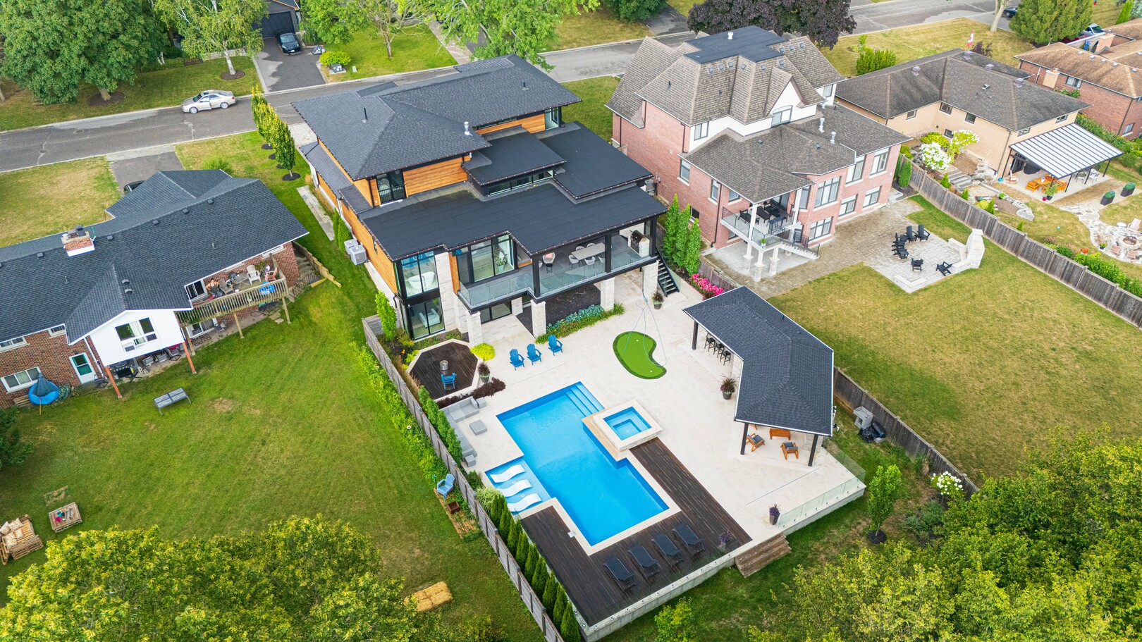 A masterpiece by David Small Designs, this architectural gem offers an elevated lifestyle with cutting-edge design and sophisticated finishes for the most discerning buyer. Soaring 10-20 ft ceilings, expansive floor-to-ceiling windows, wide-plank 8 white oak hardwood, and Eurofase designer lighting create a showstopping backdrop for everyday living and entertaining. - Smart home automation throughout (Lutron, Sonos) seamlessly blends technology with comfort. The open-concept chefs kitchen is a culinary dream, featuring premium Miele appliances and a spacious walk-in butlers' pantry. - Indulge in the bespoke main floor primary suite offering privacy, elegance, W/o to balcony, ravine views and custom millwork throughout. The second-floor family room can easily be converted into an additional bedroom to suit your needs. - The premium walkout basement is designed for both relaxation and entertainment, featuring a serene yoga studio, sophisticated cocktail lounge, and an inviting media room. Step outside to your private backyard oasis complete with an inground saltwater pool, hot tub, covered loggia, and a cabana with a cozy fireplace. Fully landscaped with elegant Indiana limestone and backing onto a tranquil ravine, this outdoor space offers unmatched privacy and natural beauty. - Additional Highlights: Heated driveway and walk way, Heated Floors,Impeccable craftsmanship & attention to every detail! - Located Mins To Highway 400, go train, Kings Finest Schools ( Country Day/Villa Nova/ King City High) walking distance to restaurants, amenities, Parks and walking trails. (id:9346)