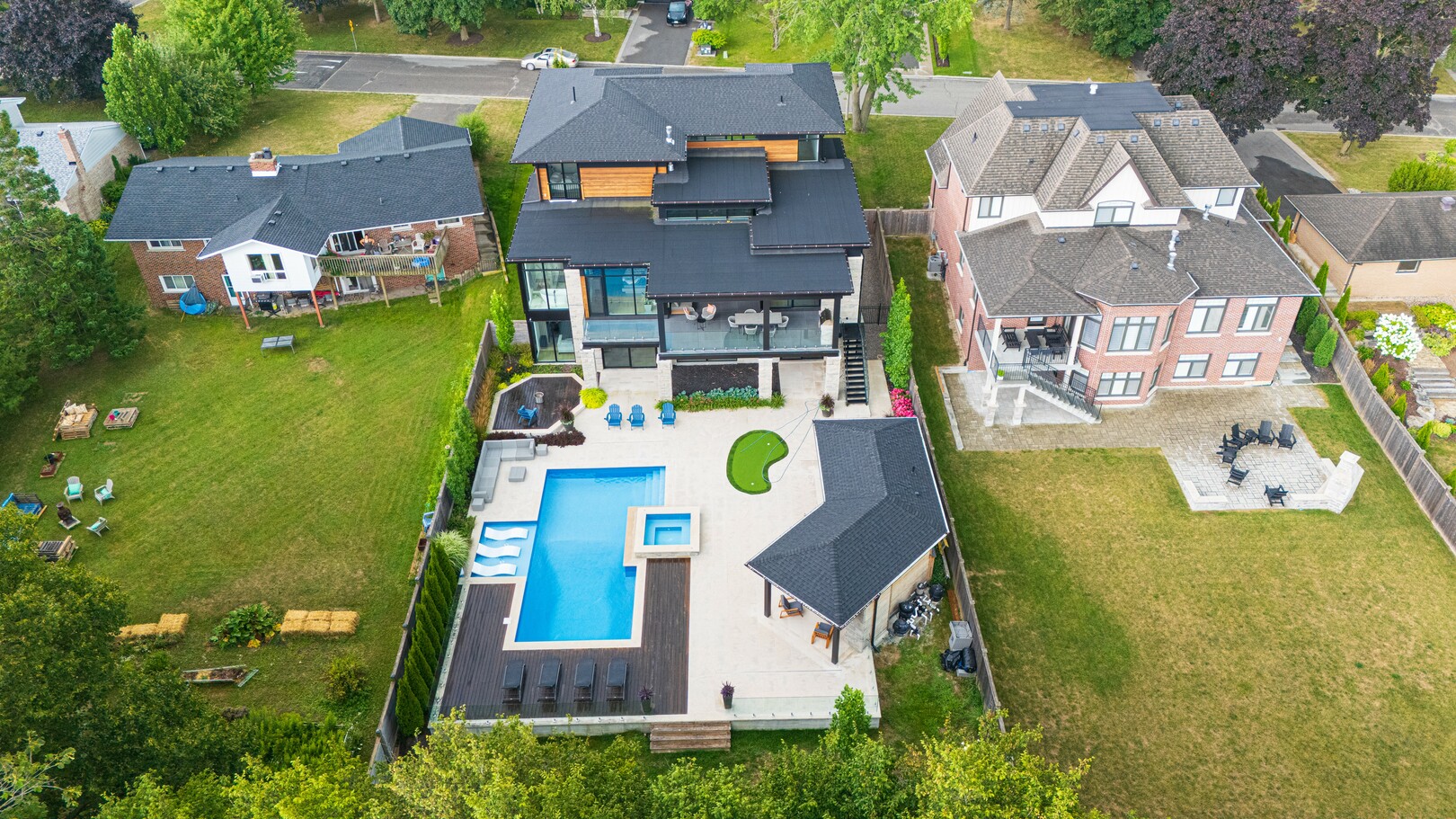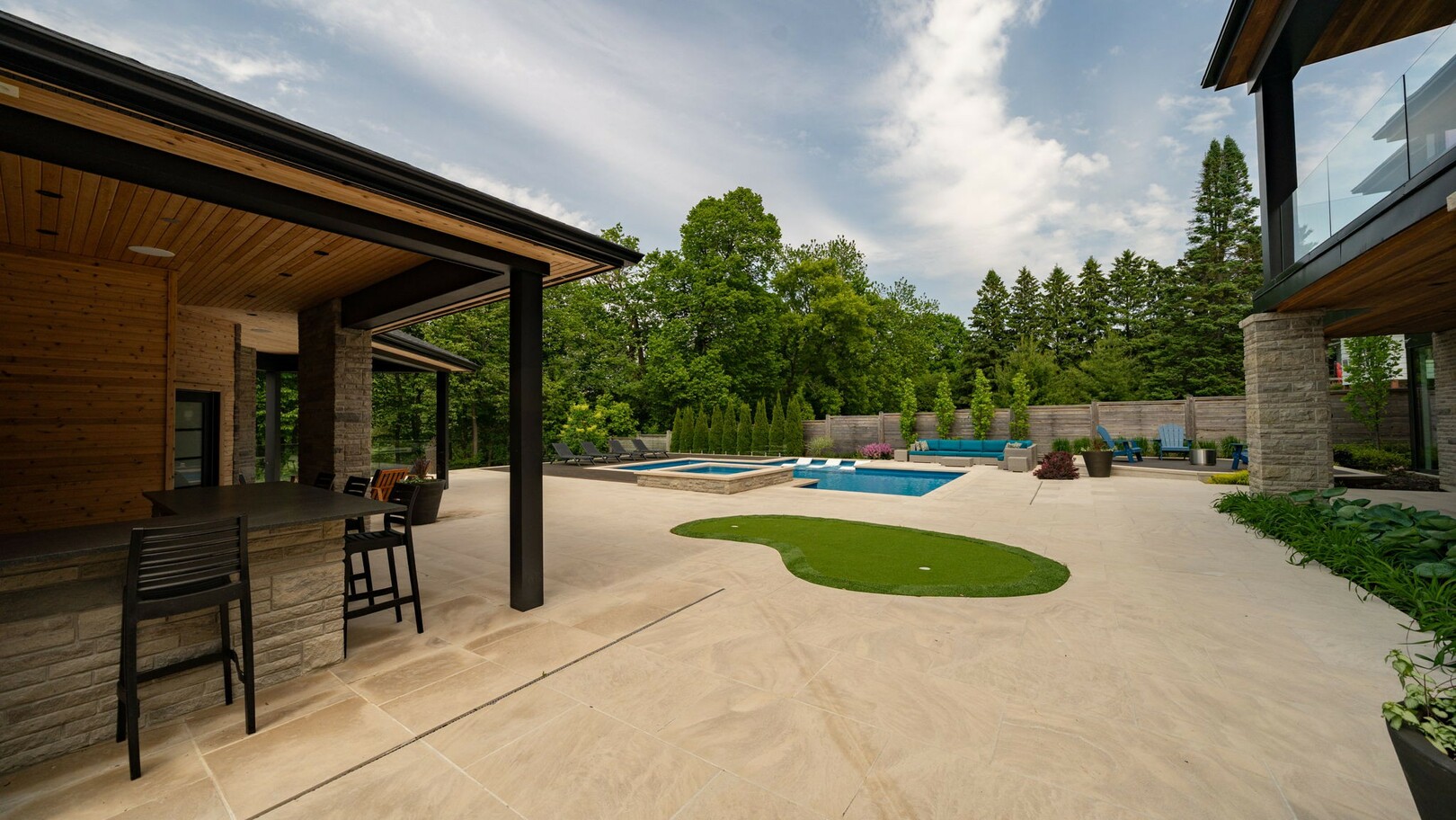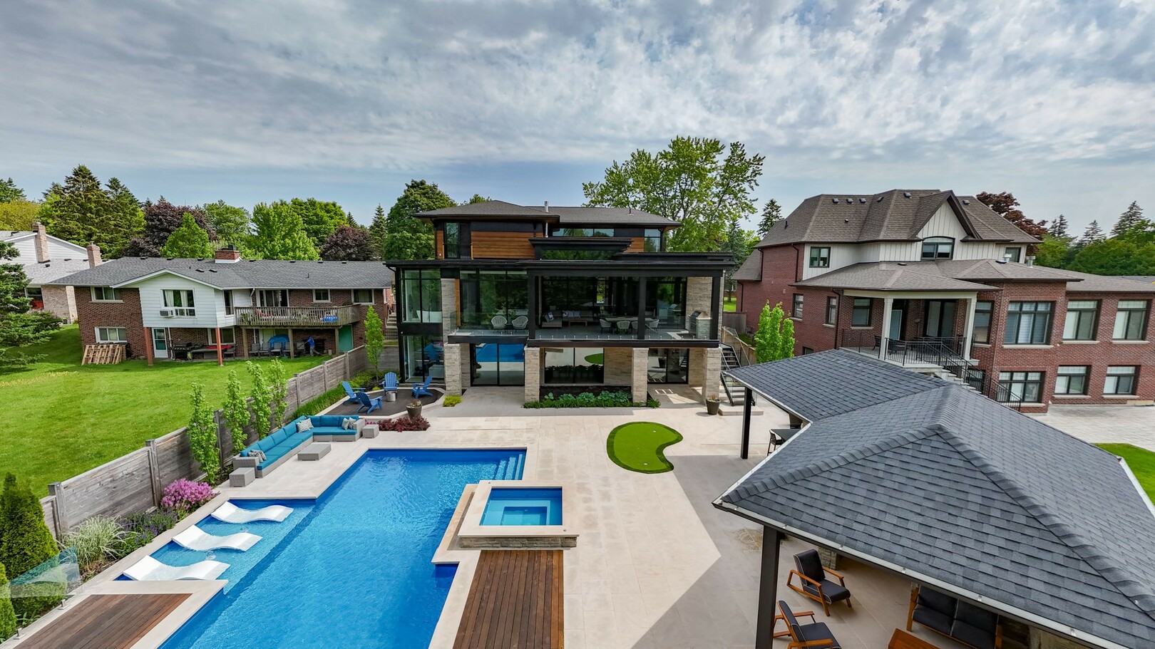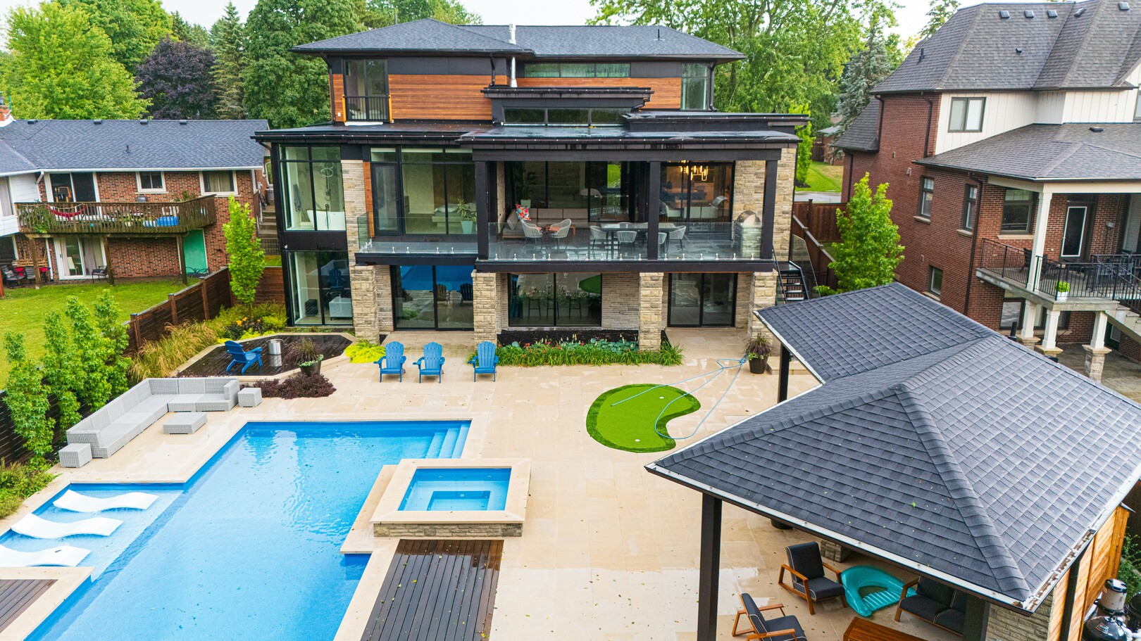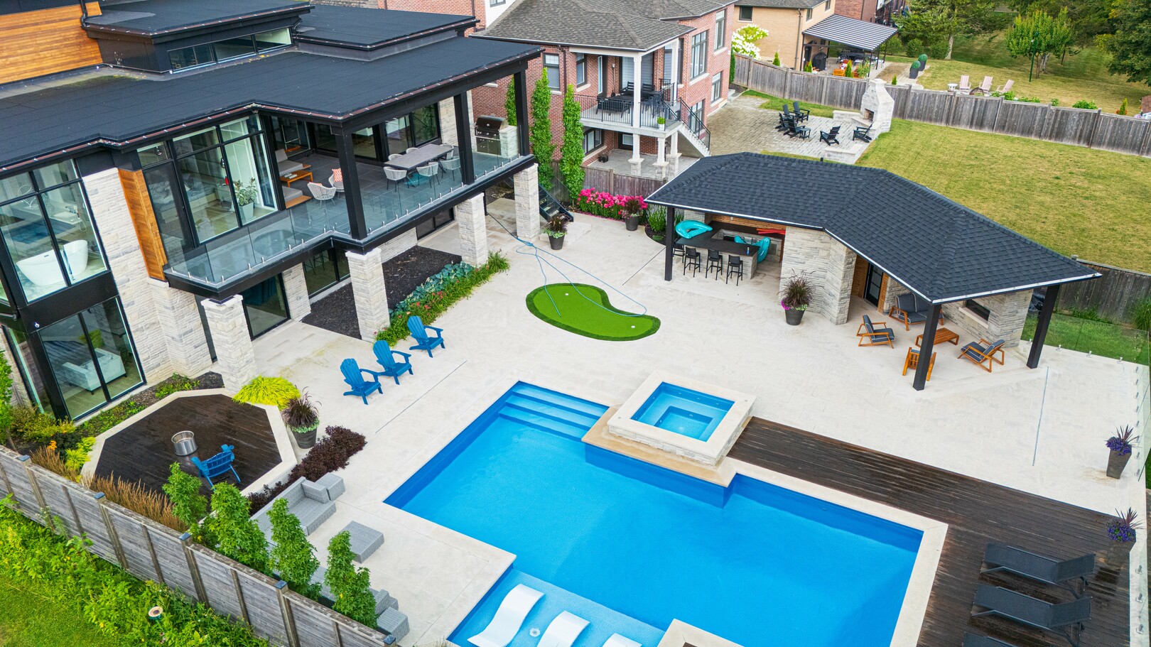 A masterpiece by David Small Designs, this architectural gem offers an elevated lifestyle with cutting-edge design and sophisticated finishes for the most discerning buyer. Soaring 10-20 ft ceilings, expansive floor-to-ceiling windows, wide-plank 8 white oak hardwood, and Eurofase designer lighting create a showstopping backdrop for everyday living and entertaining. - Smart home automation throughout (Lutron, Sonos) seamlessly blends technology with comfort. The open-concept chefs kitchen is a culinary dream, featuring premium Miele appliances and a spacious walk-in butlers' pantry. - Indulge in the bespoke main floor primary suite offering privacy, elegance, W/o to balcony, ravine views and custom millwork throughout. The second-floor family room can easily be converted into an additional bedroom to suit your needs. - The premium walkout basement is designed for both relaxation and entertainment, featuring a serene yoga studio, sophisticated cocktail lounge, and an inviting media room. Step outside to your private backyard oasis complete with an inground saltwater pool, hot tub, covered loggia, and a cabana with a cozy fireplace. Fully landscaped with elegant Indiana limestone and backing onto a tranquil ravine, this outdoor space offers unmatched privacy and natural beauty. - Additional Highlights: Heated driveway and walk way, Heated Floors,Impeccable craftsmanship & attention to every detail! - Located Mins To Highway 400, go train, Kings Finest Schools ( Country Day/Villa Nova/ King City High) walking distance to restaurants, amenities, Parks and walking trails. (id:9346)
