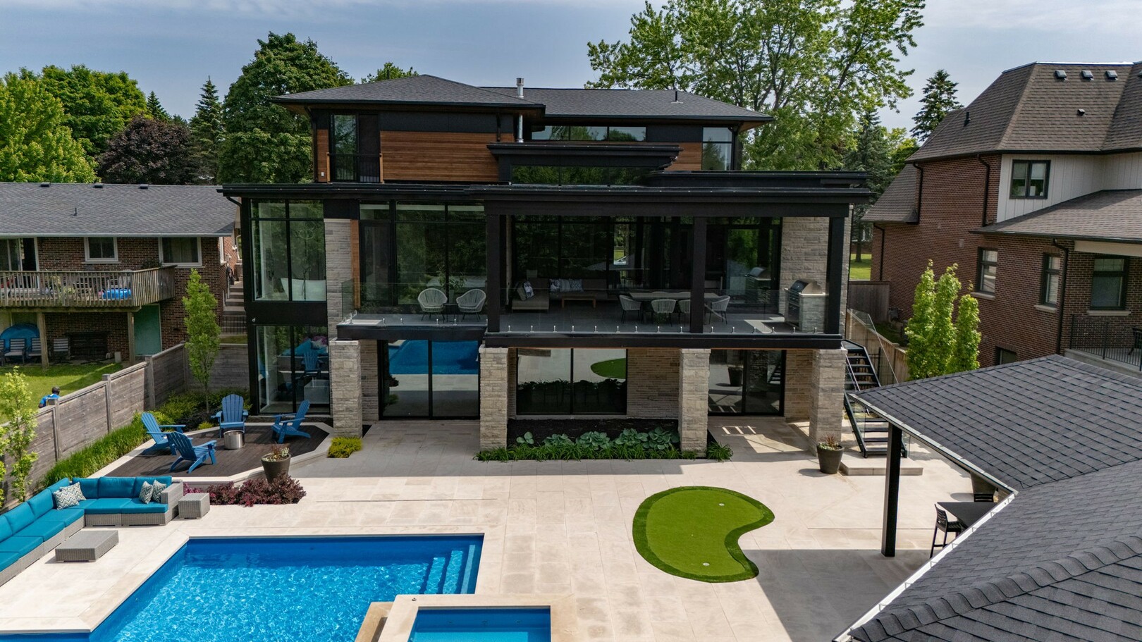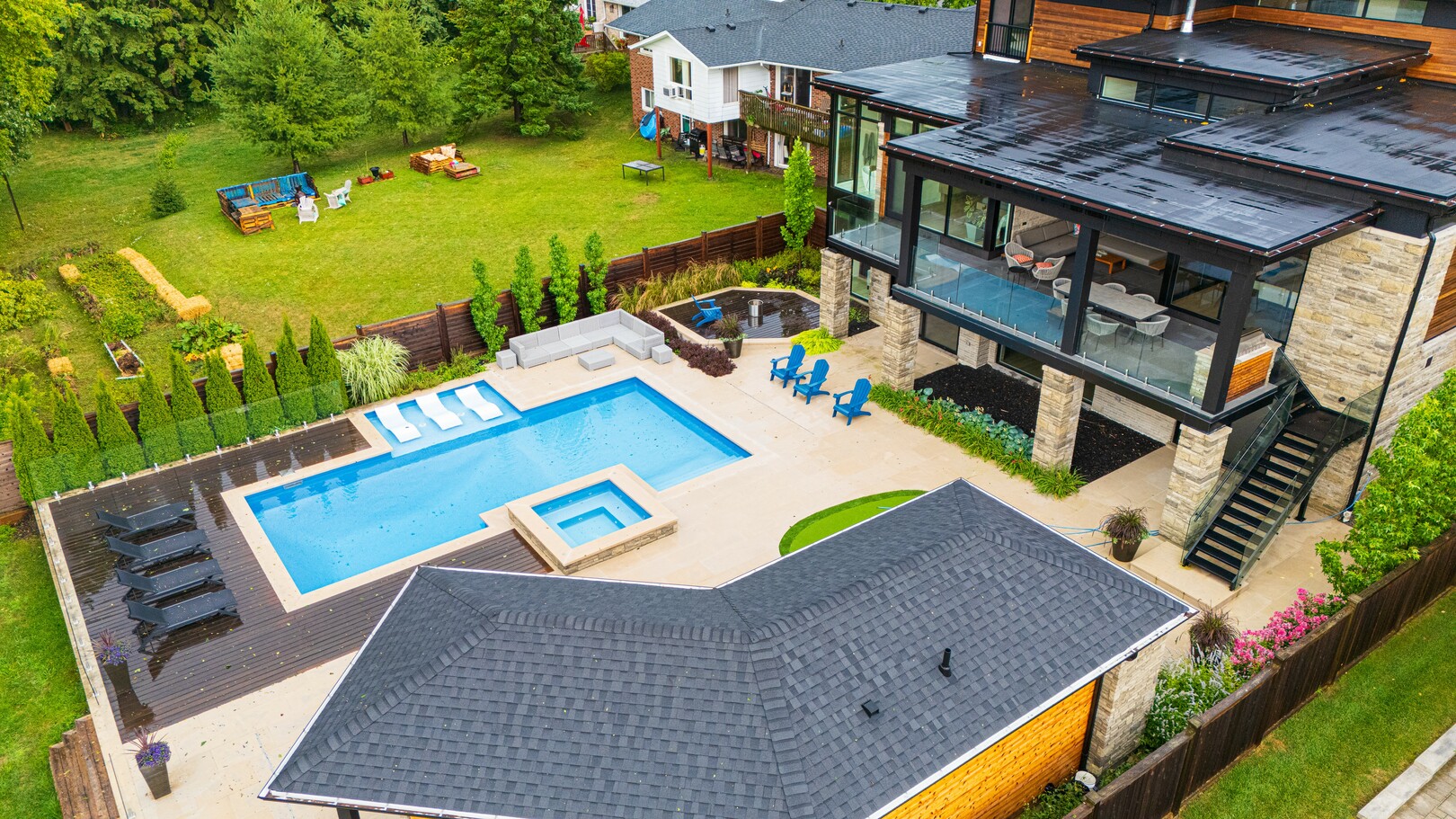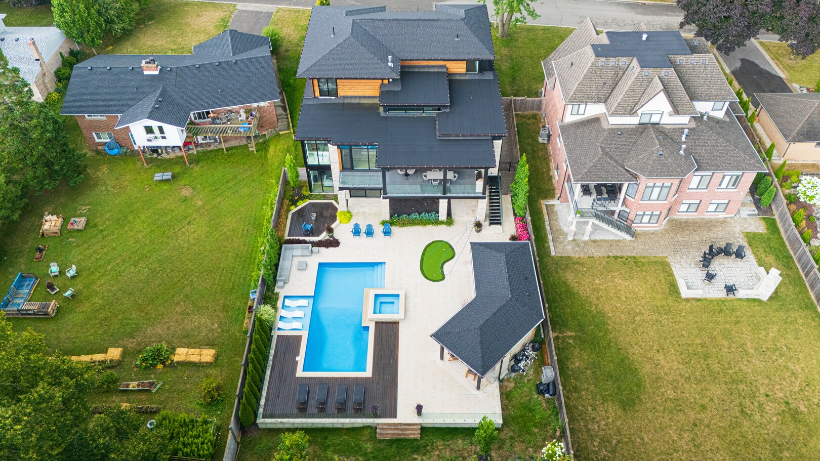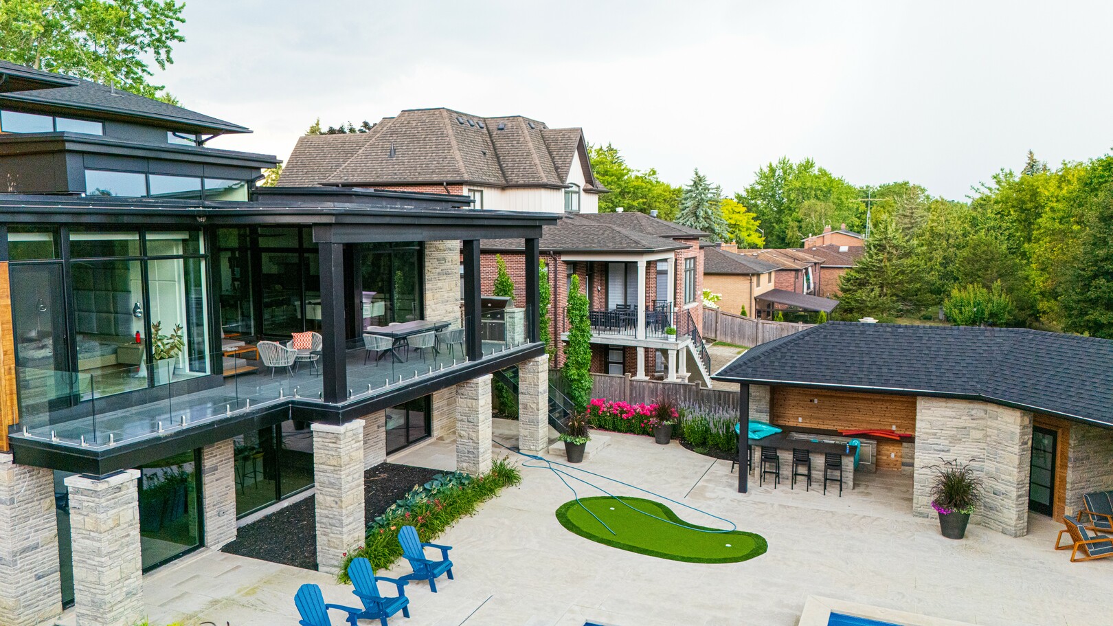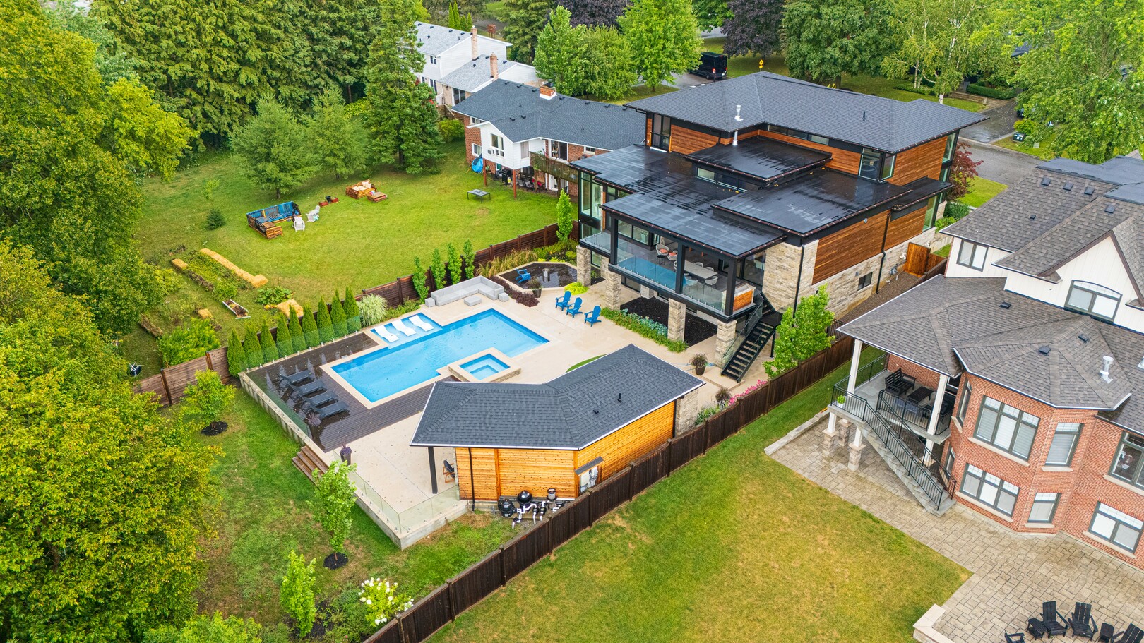 A masterpiece by David Small Designs, this architectural gem offers an elevated lifestyle with cutting-edge design and sophisticated finishes for the most discerning buyer. Soaring 10-20 ft ceilings, expansive floor-to-ceiling windows, wide-plank 8 white oak hardwood, and Eurofase designer lighting create a showstopping backdrop for everyday living and entertaining. - Smart home automation throughout (Lutron, Sonos) seamlessly blends technology with comfort. The open-concept chefs kitchen is a culinary dream, featuring premium Miele appliances and a spacious walk-in butlers' pantry. - Indulge in the bespoke main floor primary suite offering privacy, elegance, W/o to balcony, ravine views and custom millwork throughout. The second-floor family room can easily be converted into an additional bedroom to suit your needs. - The premium walkout basement is designed for both relaxation and entertainment, featuring a serene yoga studio, sophisticated cocktail lounge, and an inviting media room. Step outside to your private backyard oasis complete with an inground saltwater pool, hot tub, covered loggia, and a cabana with a cozy fireplace. Fully landscaped with elegant Indiana limestone and backing onto a tranquil ravine, this outdoor space offers unmatched privacy and natural beauty. - Additional Highlights: Heated driveway and walk way, Heated Floors,Impeccable craftsmanship & attention to every detail! - Located Mins To Highway 400, go train, Kings Finest Schools ( Country Day/Villa Nova/ King City High) walking distance to restaurants, amenities, Parks and walking trails. (id:9346)