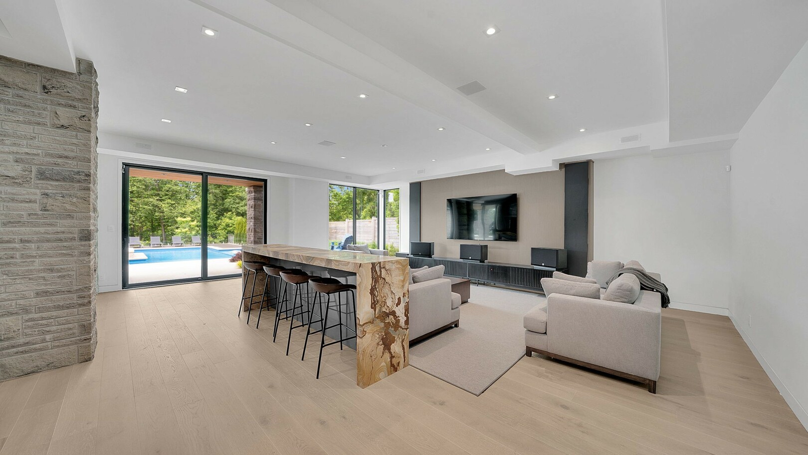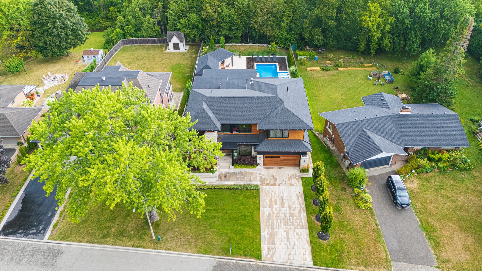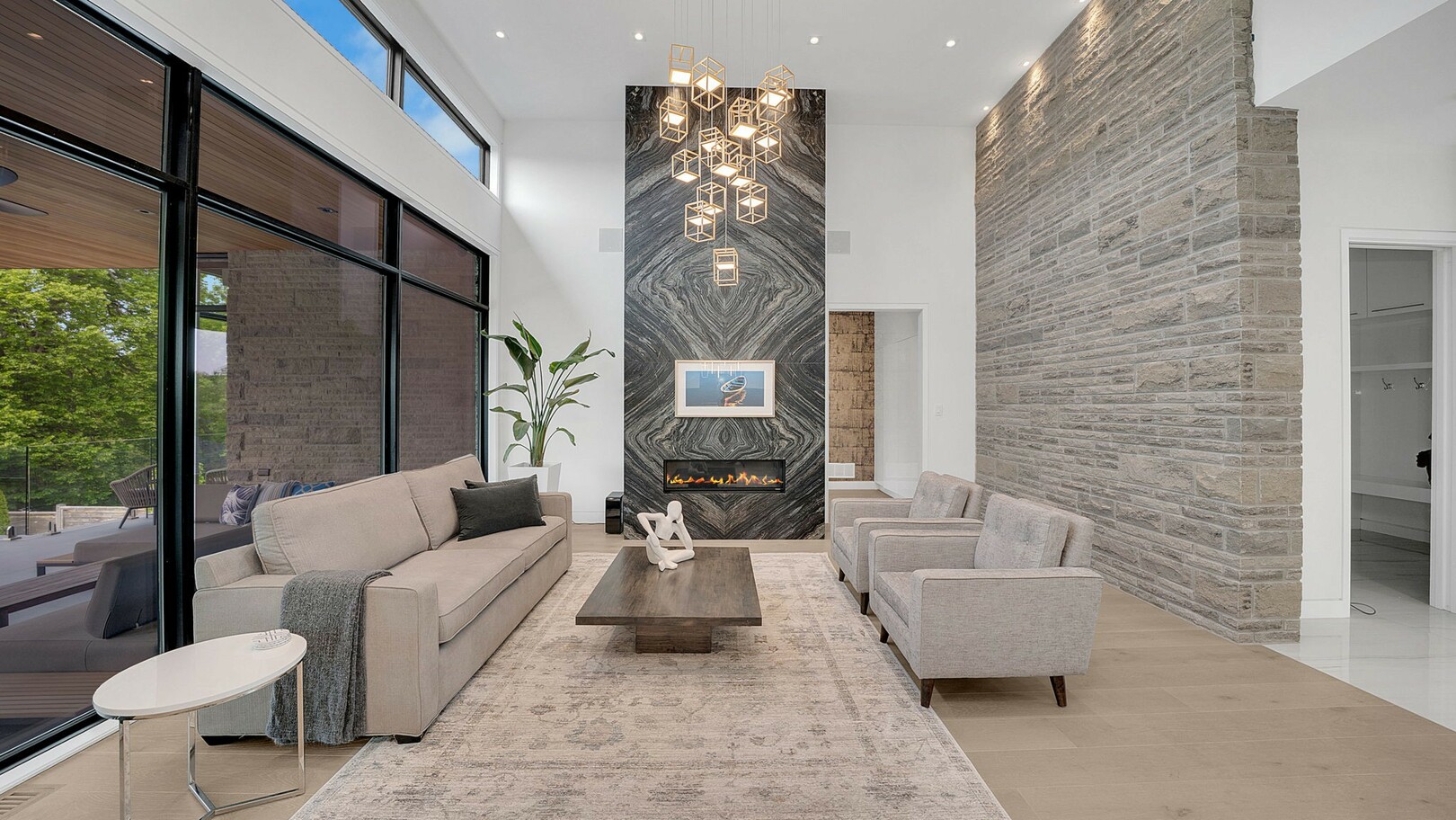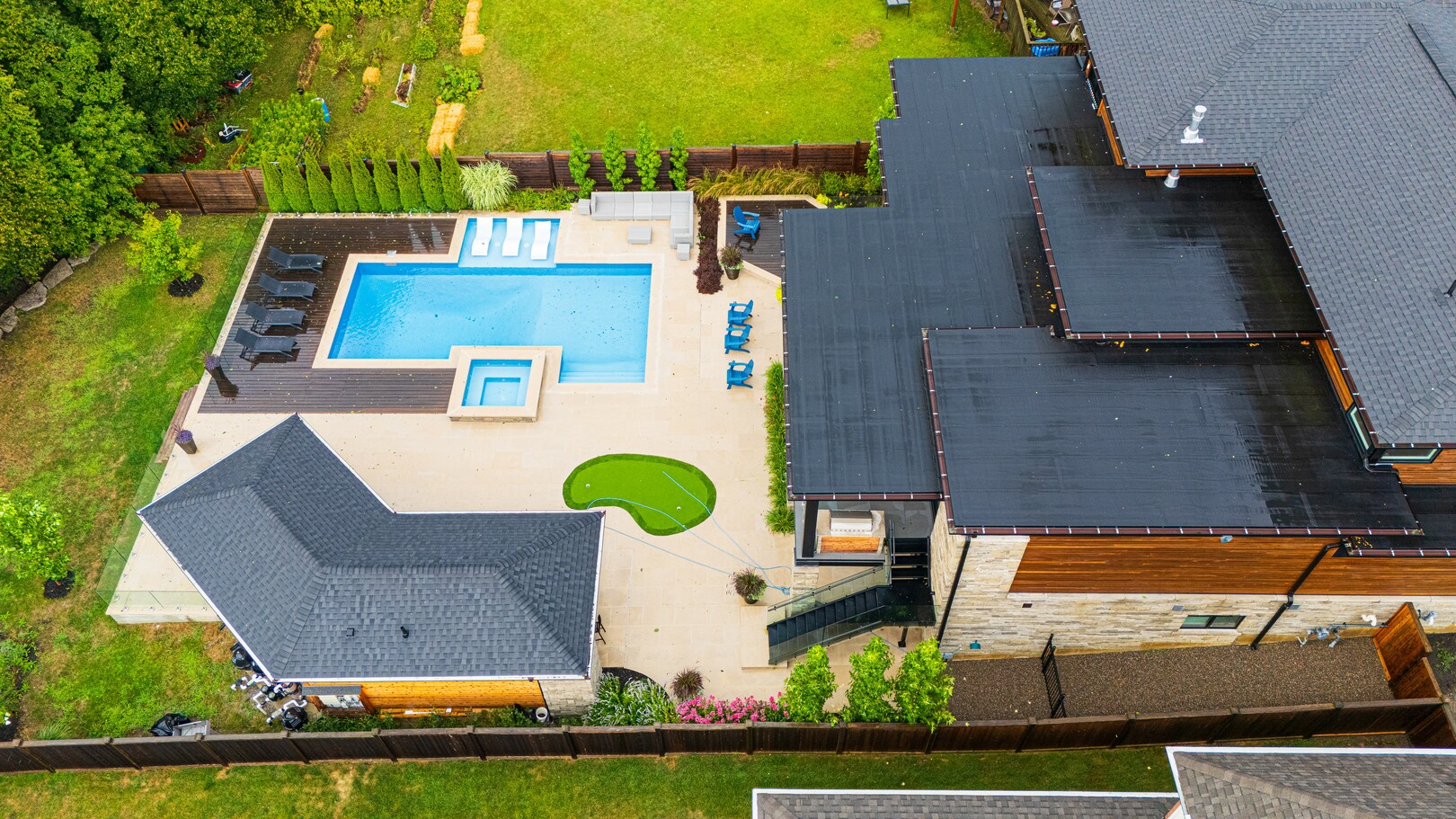A masterpiece by David Small Designs, this architectural gem offers an elevated lifestyle with cutting-edge design and sophisticated finishes for the most discerning buyer. Soaring 10-20 ft ceilings, expansive floor-to-ceiling windows, wide-plank 8 white oak hardwood, and Eurofase designer lighting create a showstopping backdrop for everyday living and entertaining. - Smart home automation throughout (Lutron, Sonos) seamlessly blends technology with comfort. The open-concept chefs kitchen is a culinary dream, featuring premium Miele appliances and a spacious walk-in butlers' pantry. - Indulge in the bespoke main floor primary suite offering privacy, elegance, W/o to balcony, ravine views and custom millwork throughout. The second-floor family room can easily be converted into an additional bedroom to suit your needs. - The premium walkout basement is designed for both relaxation and entertainment, featuring a serene yoga studio, sophisticated cocktail lounge, and an inviting media room. Step outside to your private backyard oasis complete with an inground saltwater pool, hot tub, covered loggia, and a cabana with a cozy fireplace. Fully landscaped with elegant Indiana limestone and backing onto a tranquil ravine, this outdoor space offers unmatched privacy and natural beauty. - Additional Highlights: Heated driveway and walk way, Heated Floors,Impeccable craftsmanship & attention to every detail! - Located Mins To Highway 400, go train, Kings Finest Schools ( Country Day/Villa Nova/ King City High) walking distance to restaurants, amenities, Parks and walking trails. (id:9346)